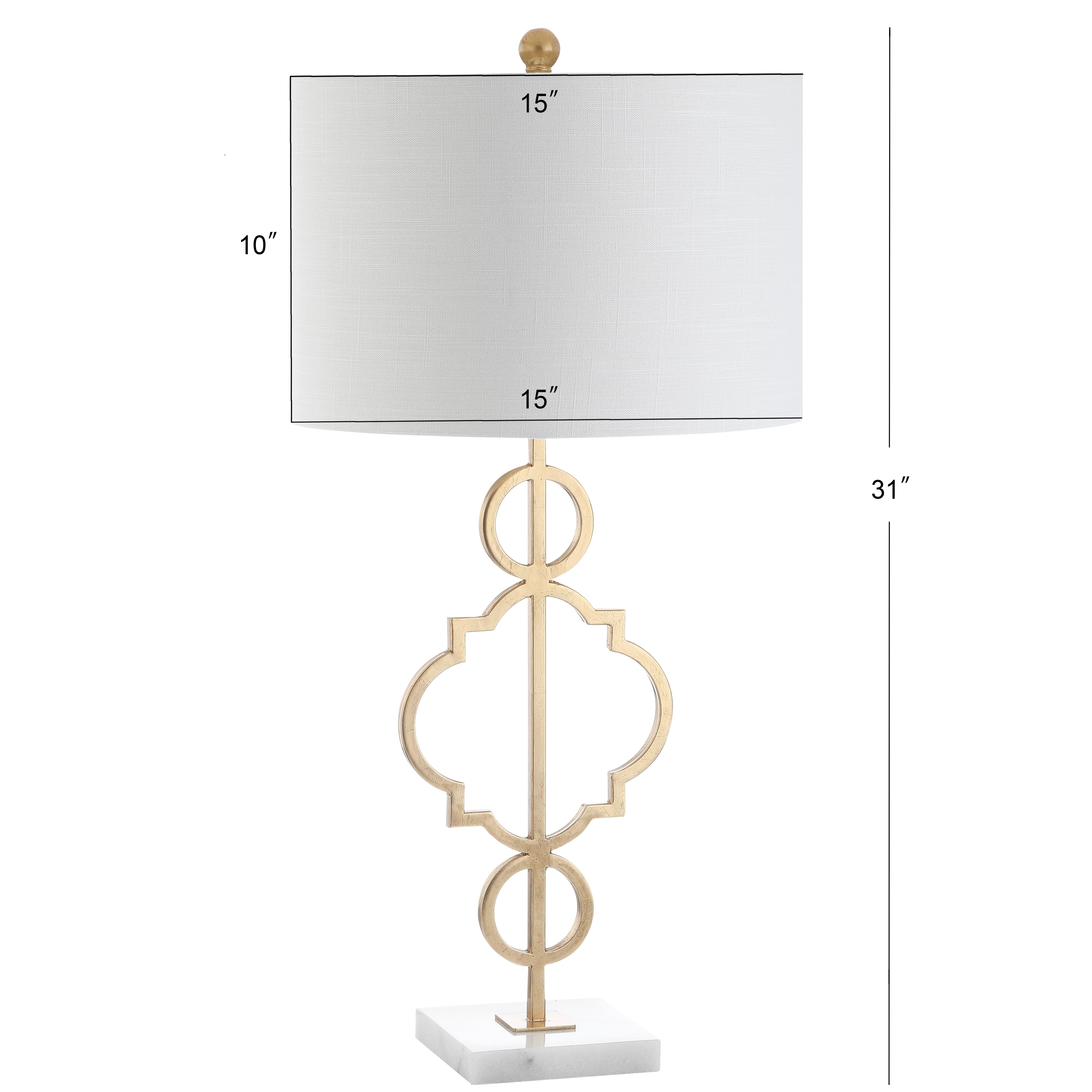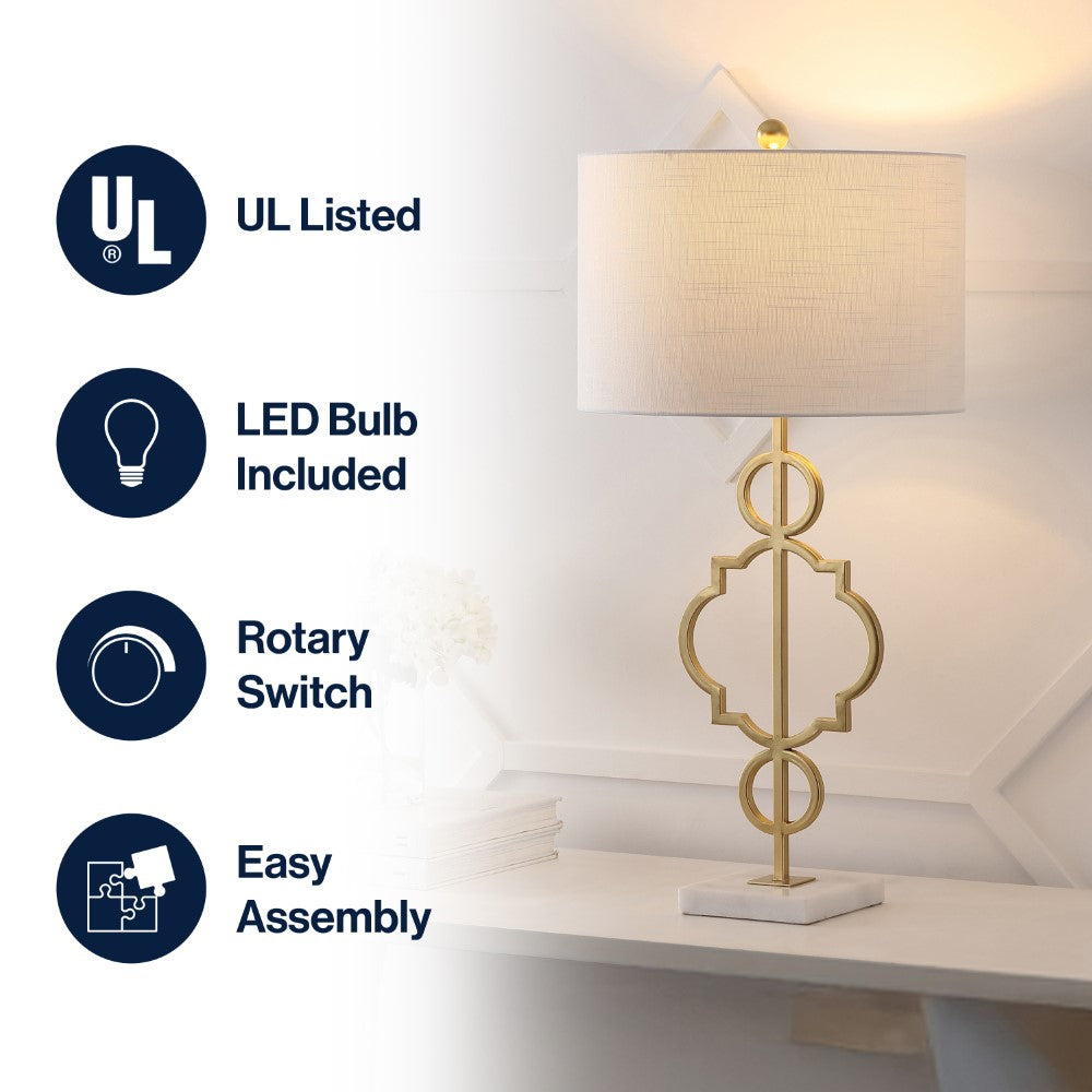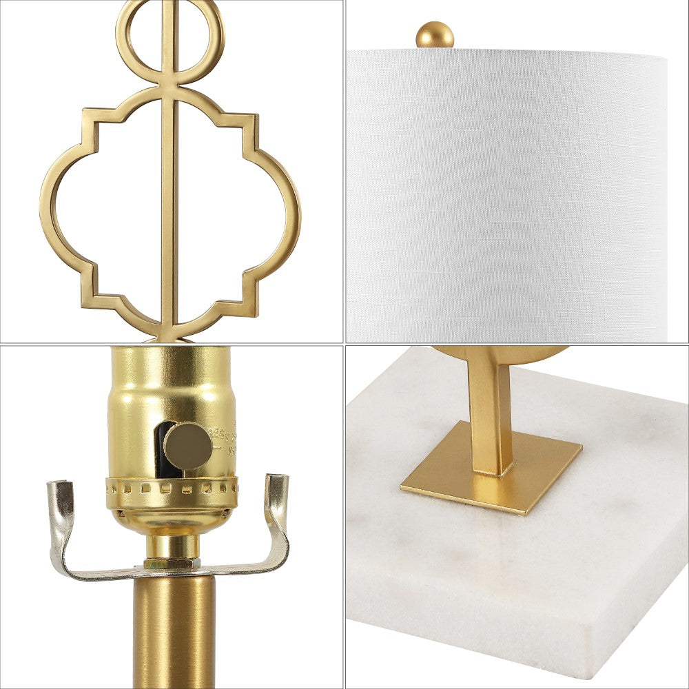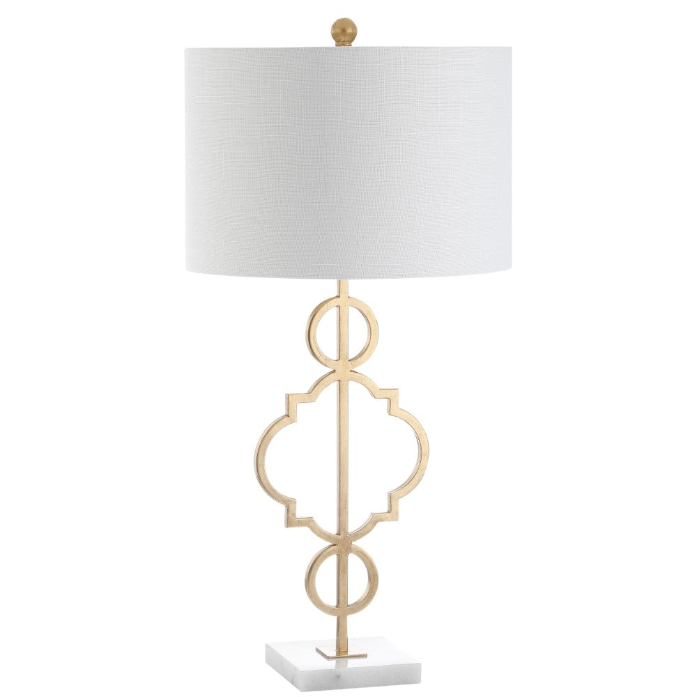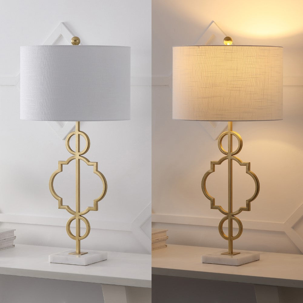 A quatrefoil motif gives this table lamp a bit of far-flung flair. The marble pedestal lends a contemporary edge while the gilded iron finish is a nod to the classics. Topped with a white linen drum shade, it works well with a variety of home décor styles -- including your own!