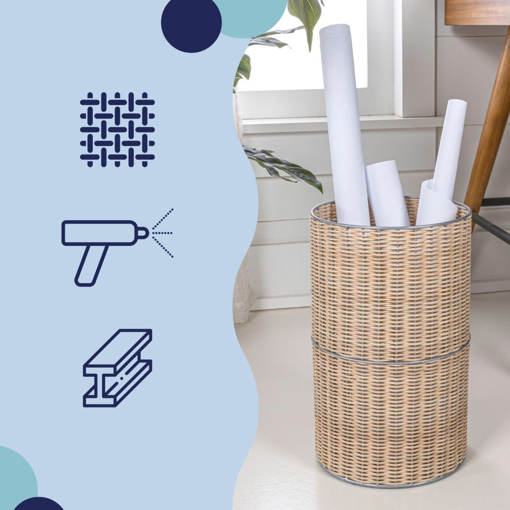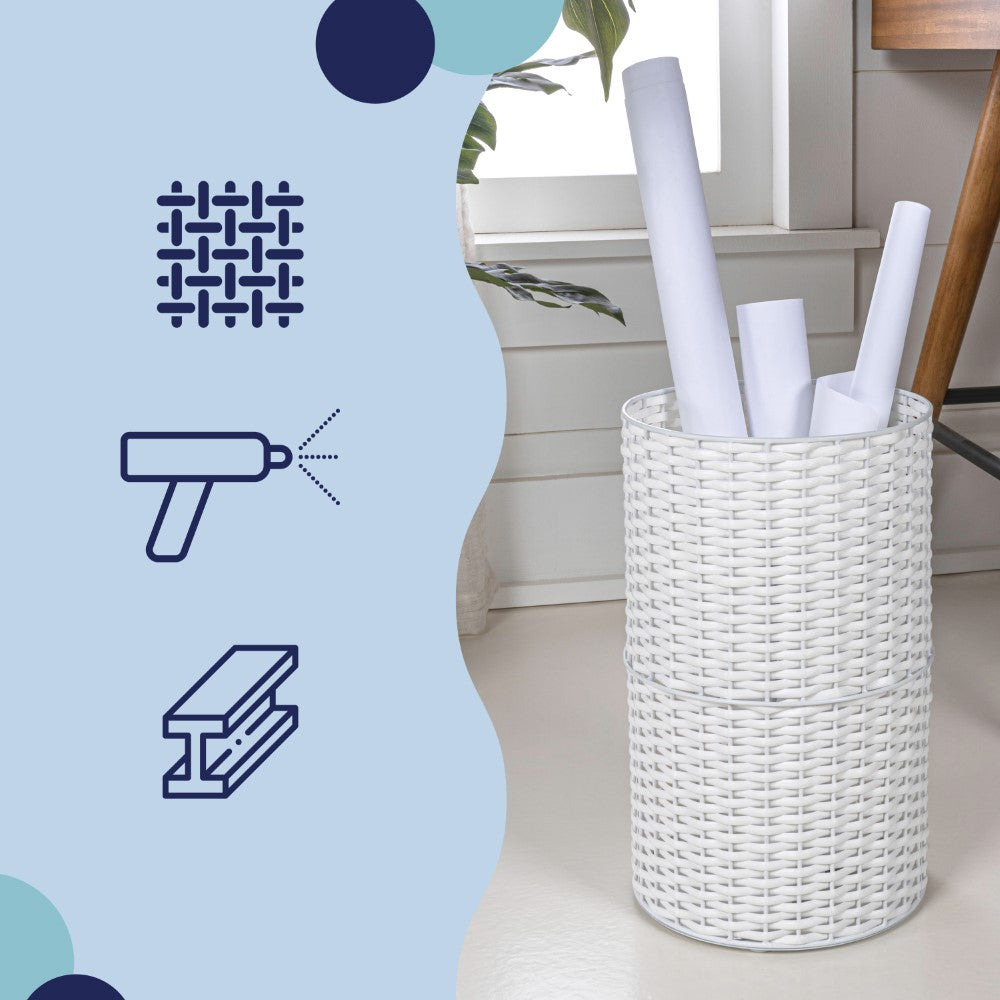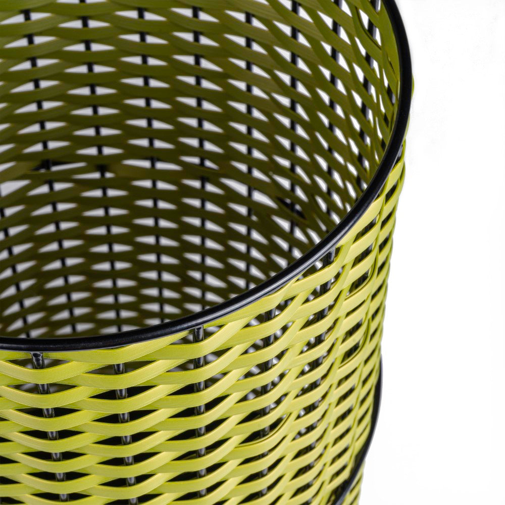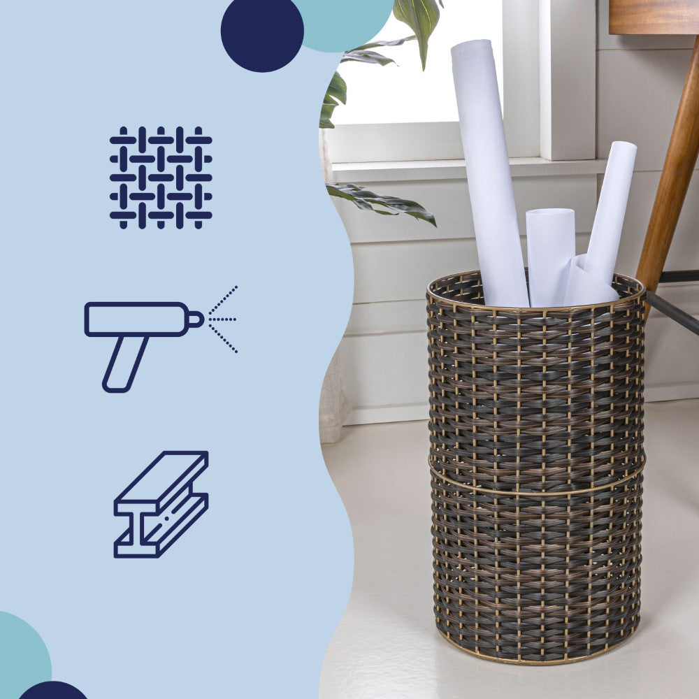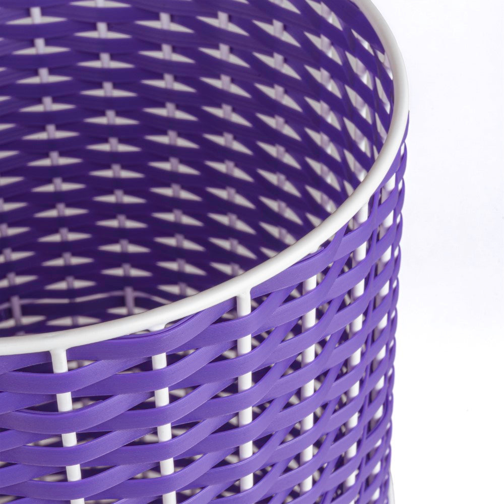This slim wastebasket is the perfect shape to tuck into a small bathroom, bedroom or office. Durable enough for outdoor use, it's made from synthetic wicker woven onto a steel frame. Add color and texture to your space with the modern look of this versatile trash can.