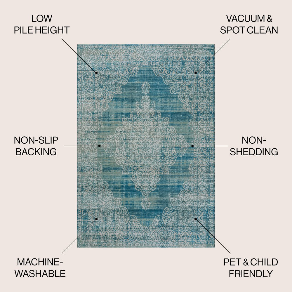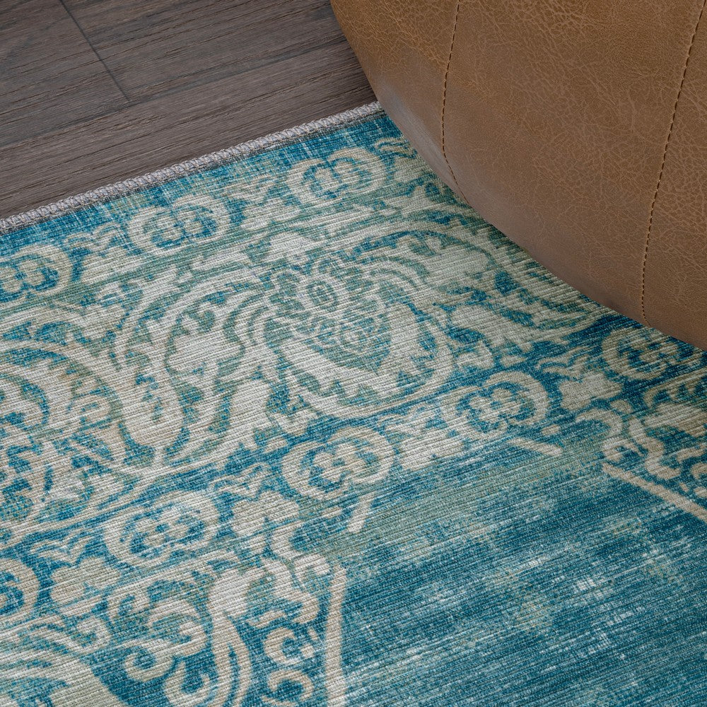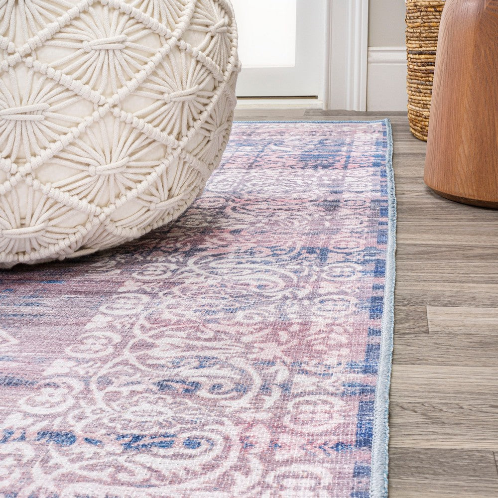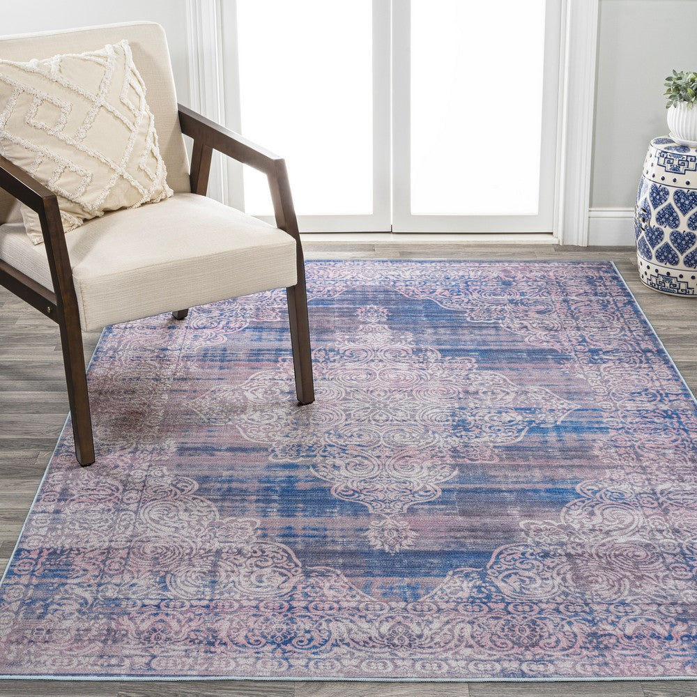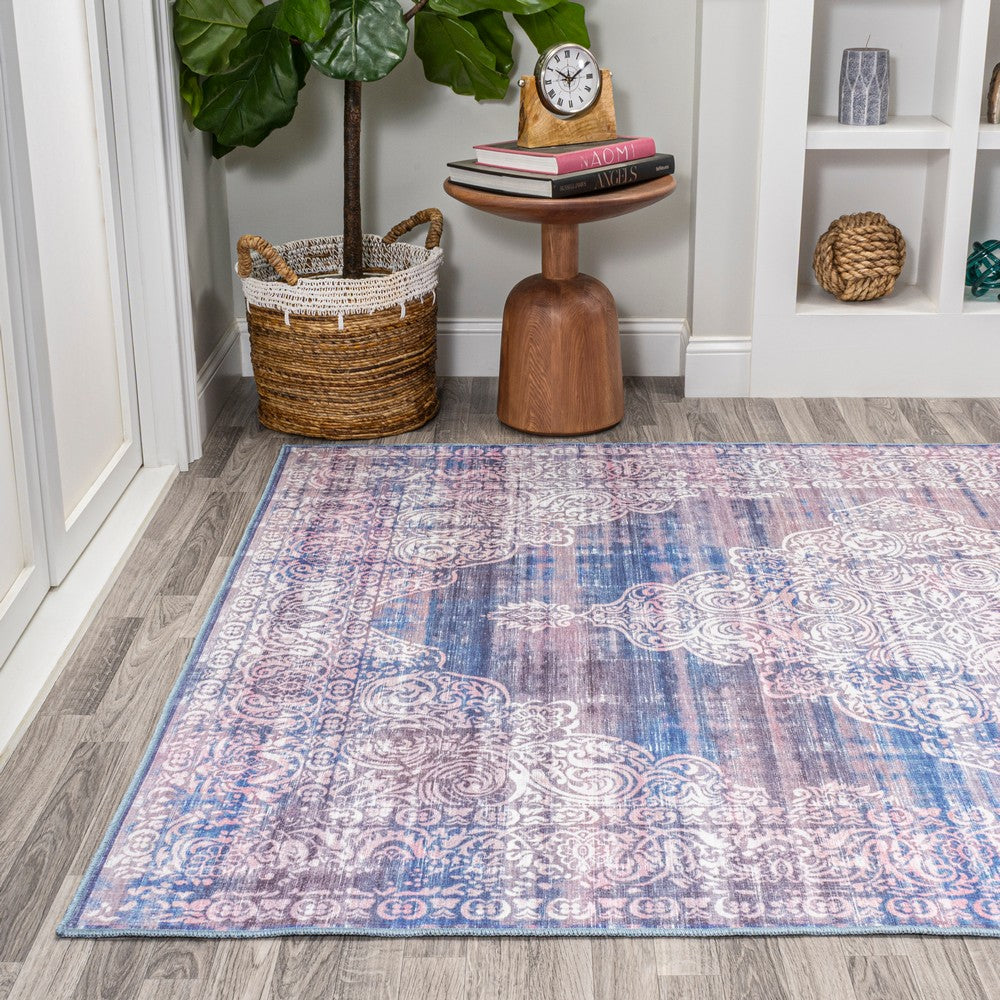 An ornate border and medallion design give this rug a French Country cottage look; but the faded color palette has a Bohemian vibe. Updated colors in a mingled weave create a vintage, distressed look. Use this romantic rug in a family room, bedroom, living room, dining room, entry, or porch; the busy pattern is kid and pet friendly.