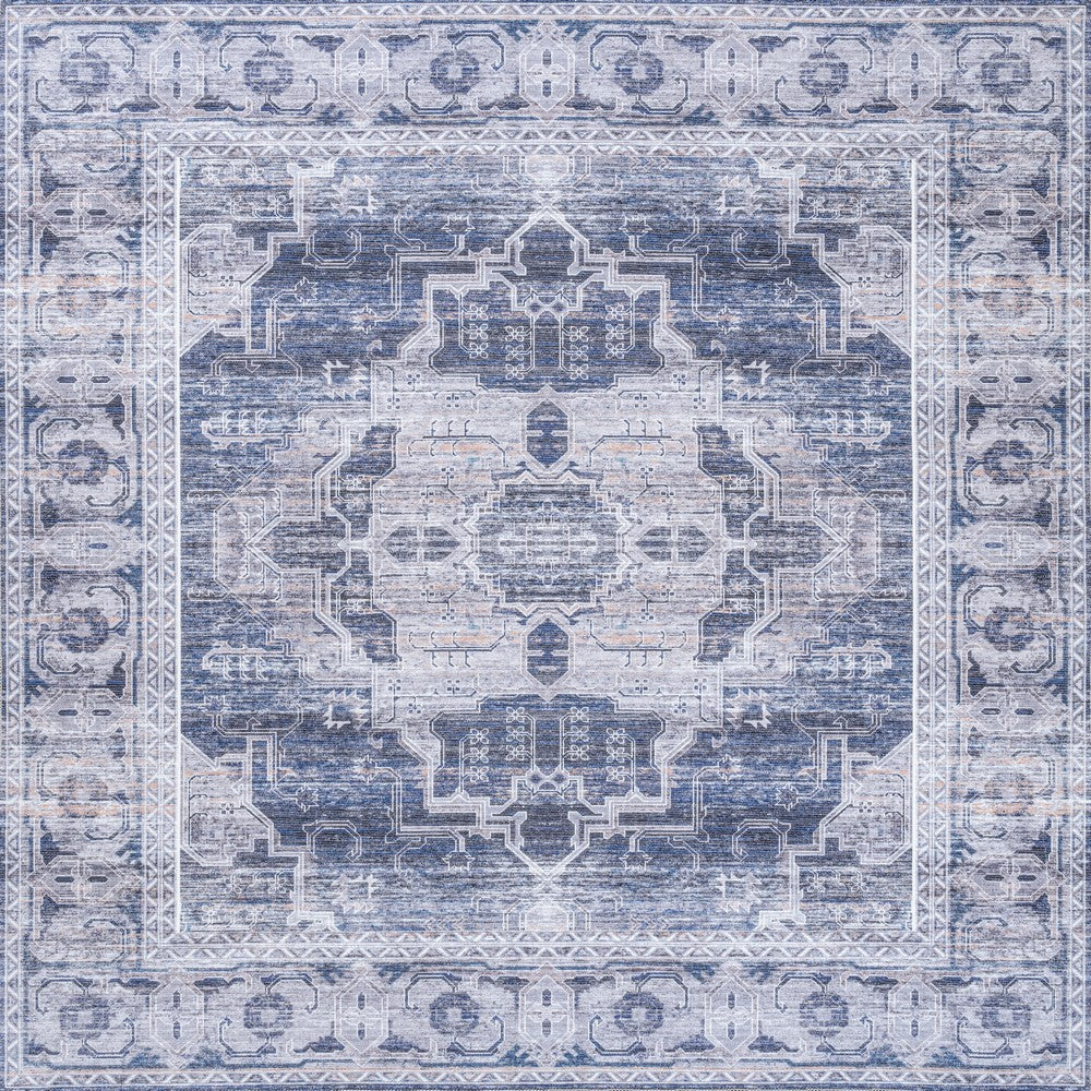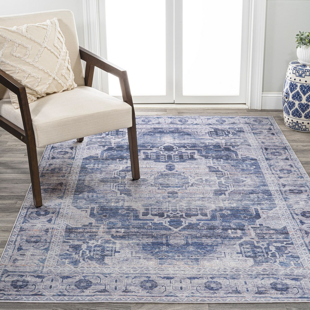 - The navy and ivory medallion design adds a timeless look to any space