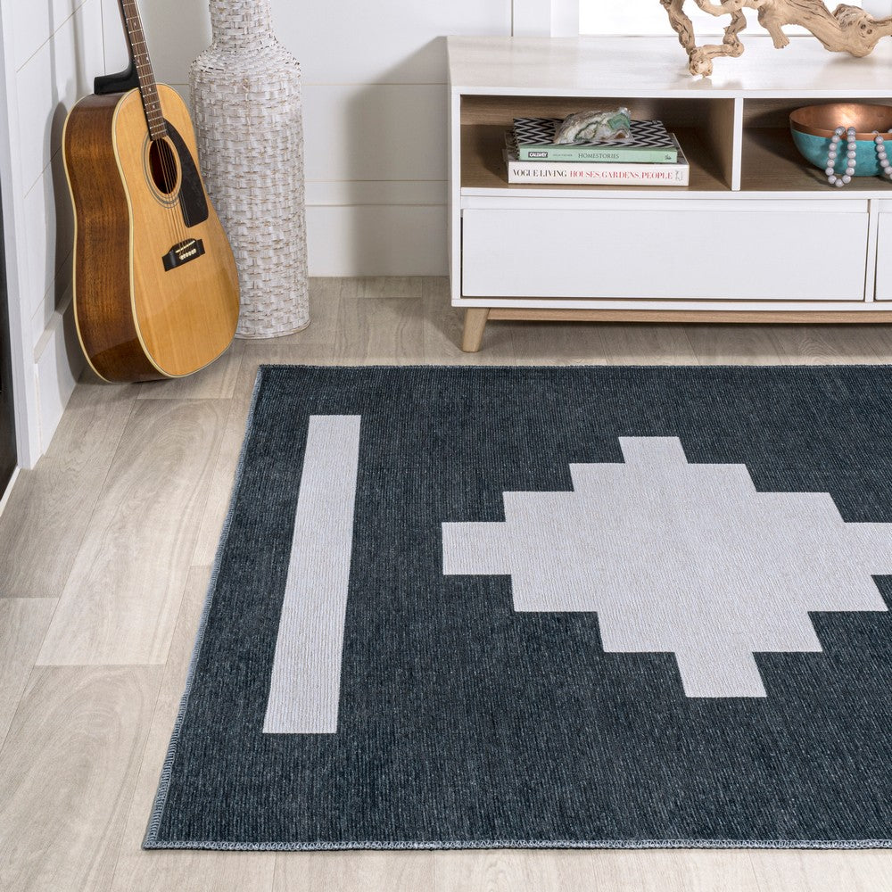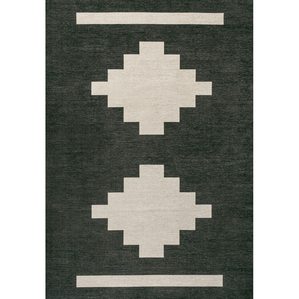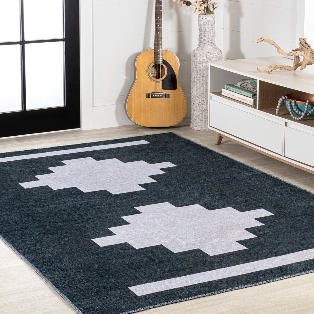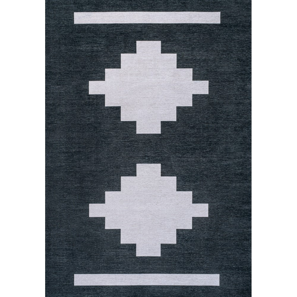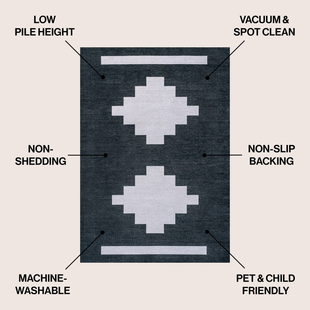 Inspired by moroccan designs, our machine washable geometric rug has minimalist simplicity. The double medallion pattern is woven in a modern, two-tone color palette. Add graphic punch to your living room, dining room, entry, or bedroom with this easy-care rug.