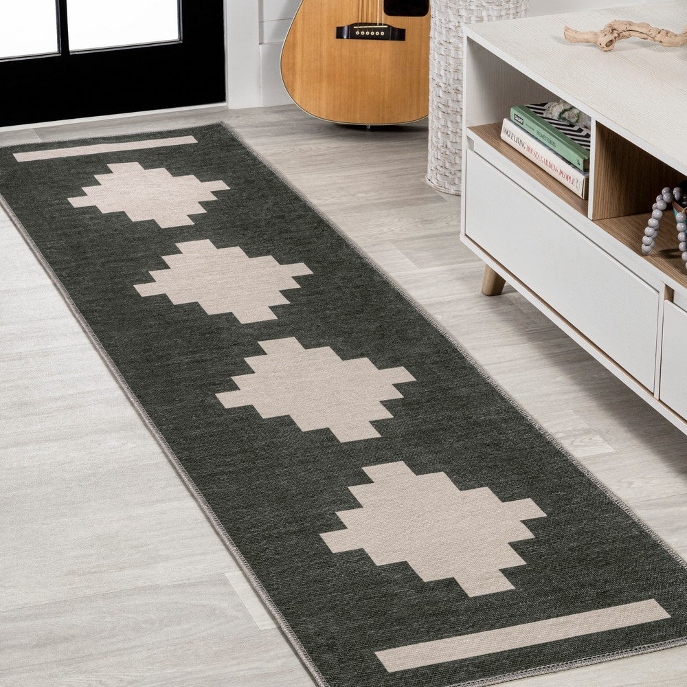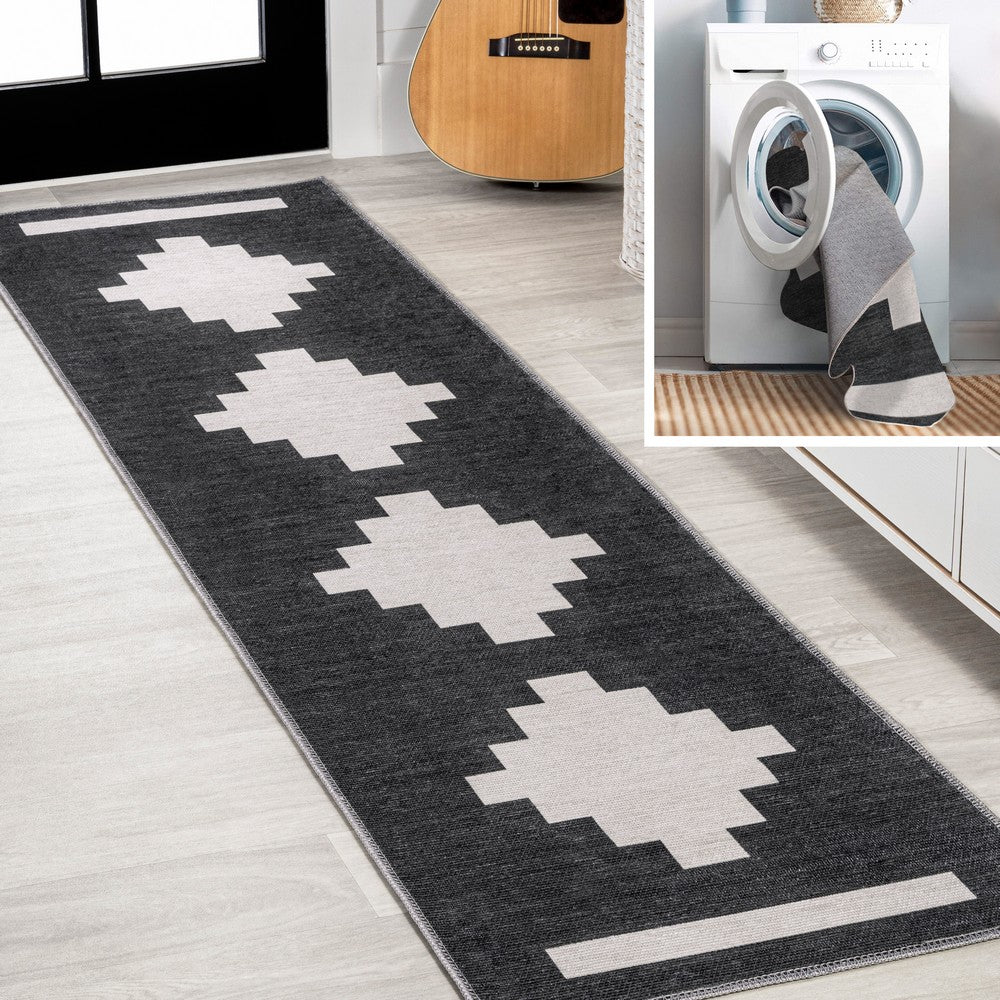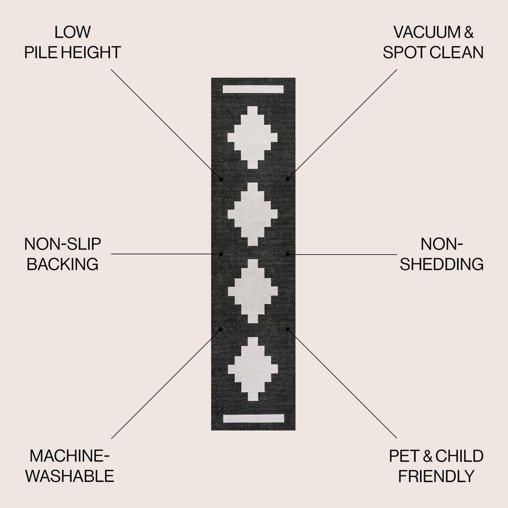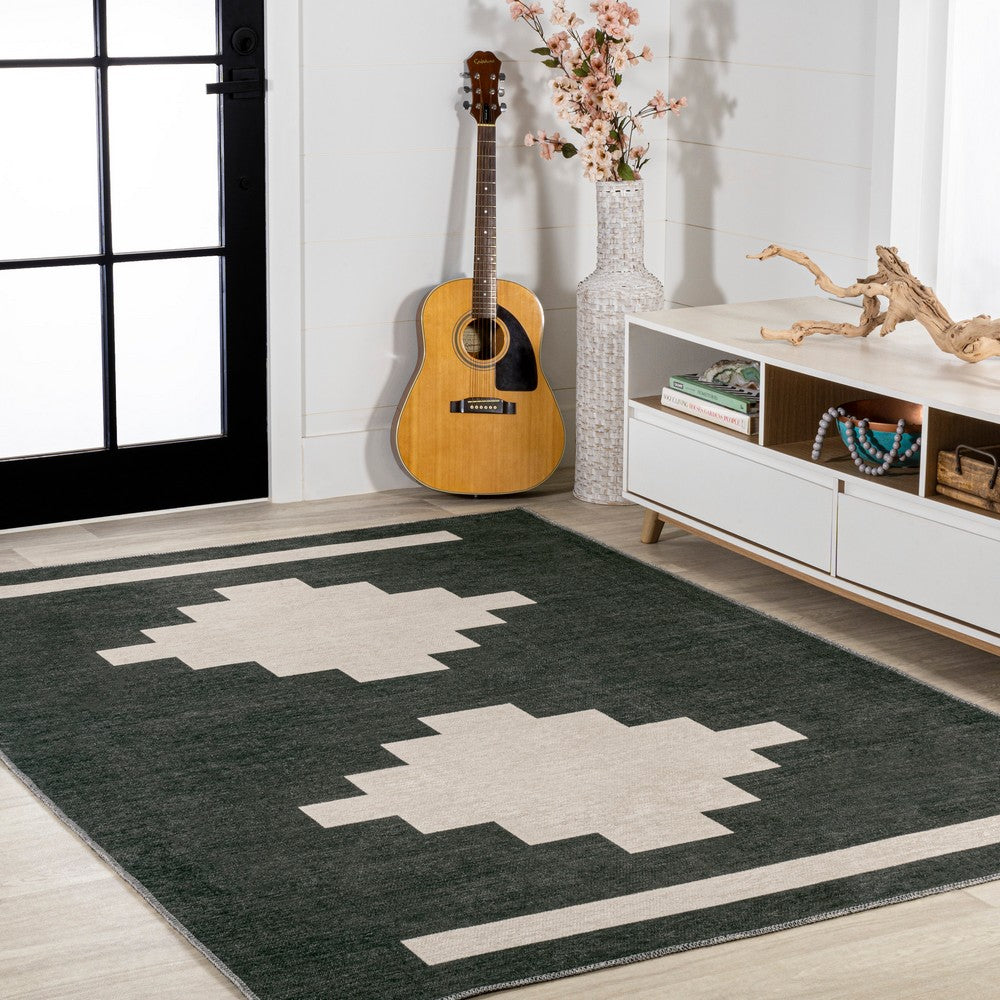 Inspired by moroccan designs, our machine washable geometric rug has minimalist simplicity. The double medallion pattern is woven in a modern, two-tone color palette. Add graphic punch to your living room, dining room, entry, or bedroom with this easy-care rug.