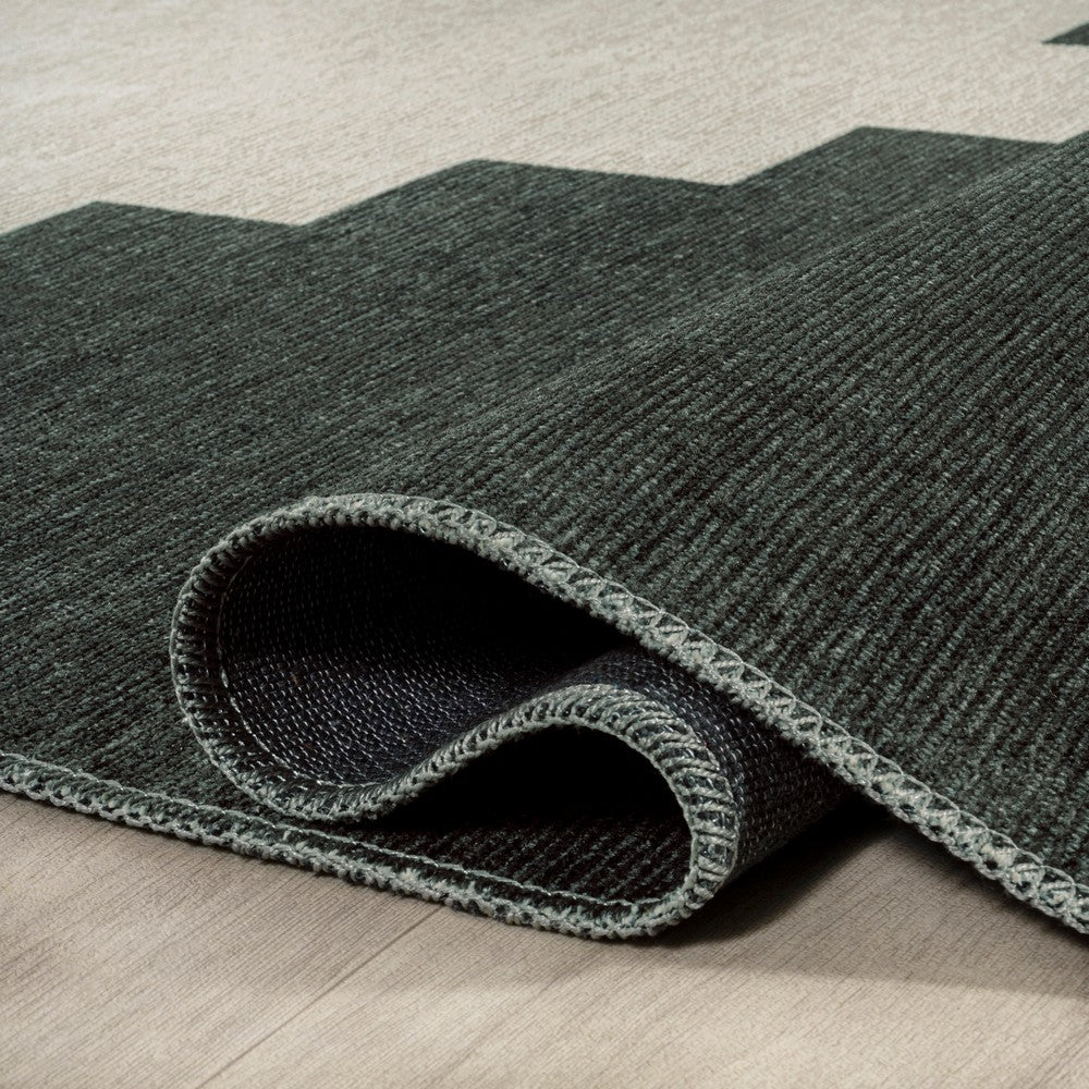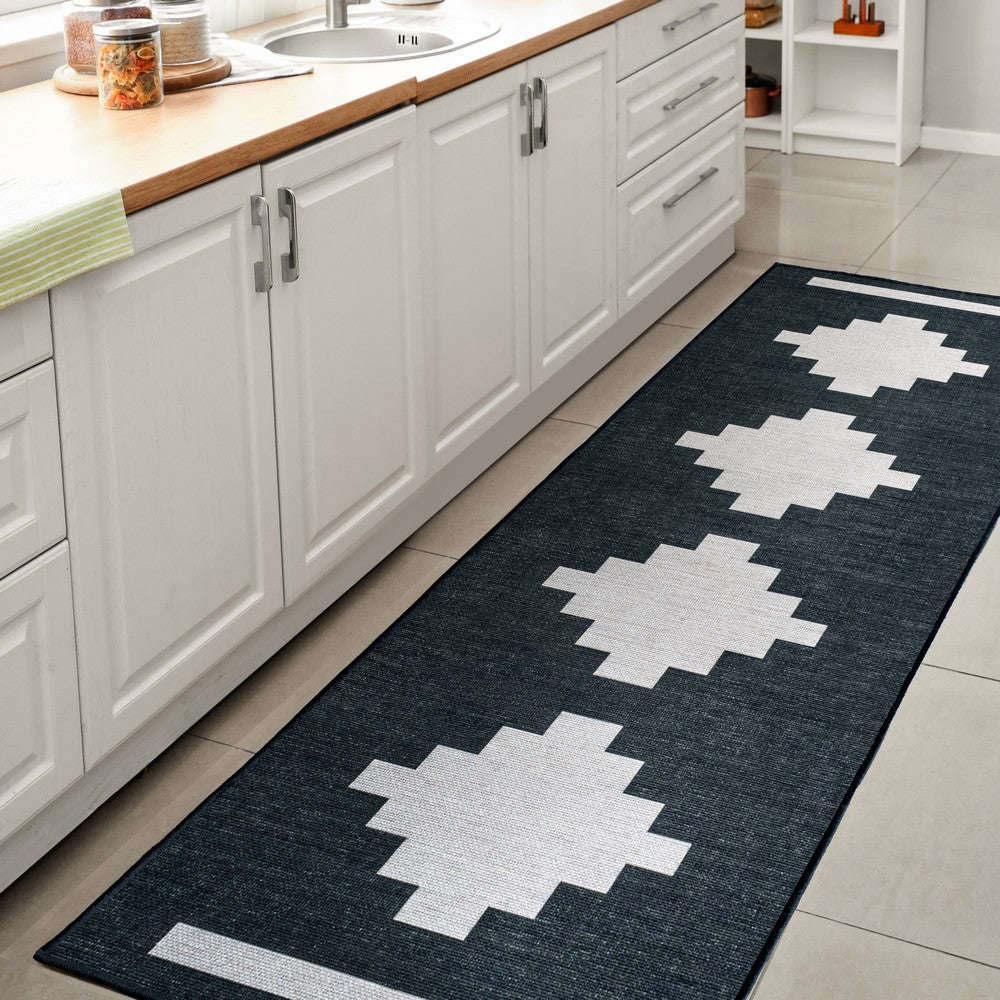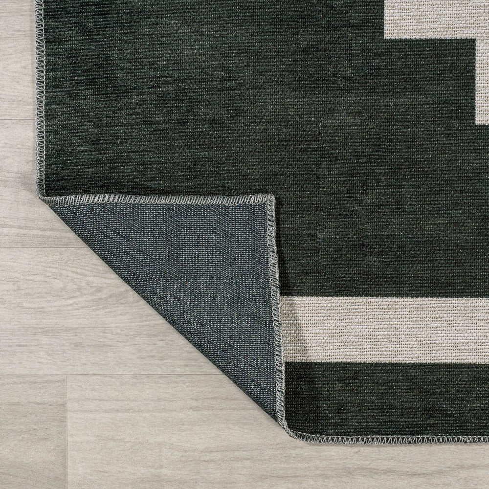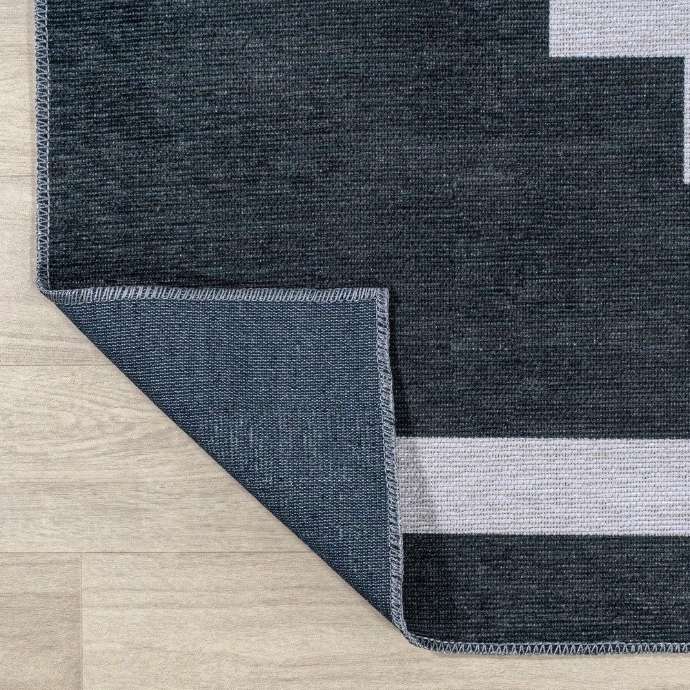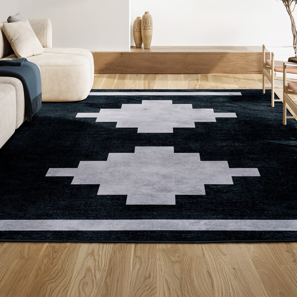 - The deep black and cream color scheme is a modern take on neutral geometric rugs