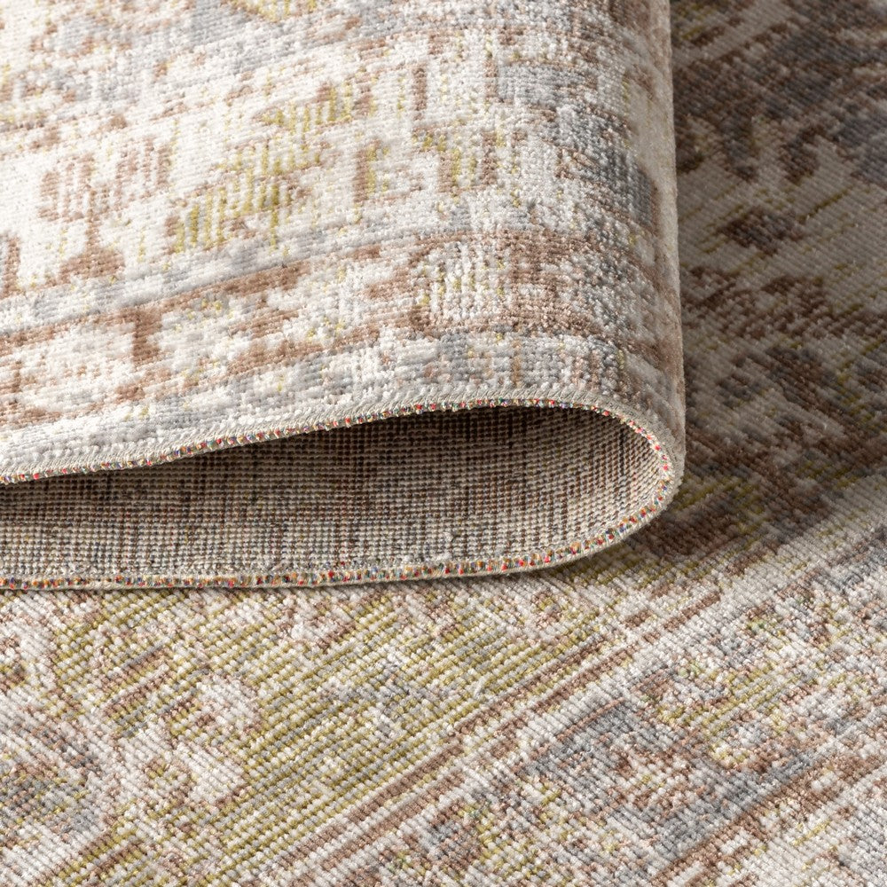 - Mingled shades of gray and gray-brown with sand and ivory create a distressed effect in the geometric design