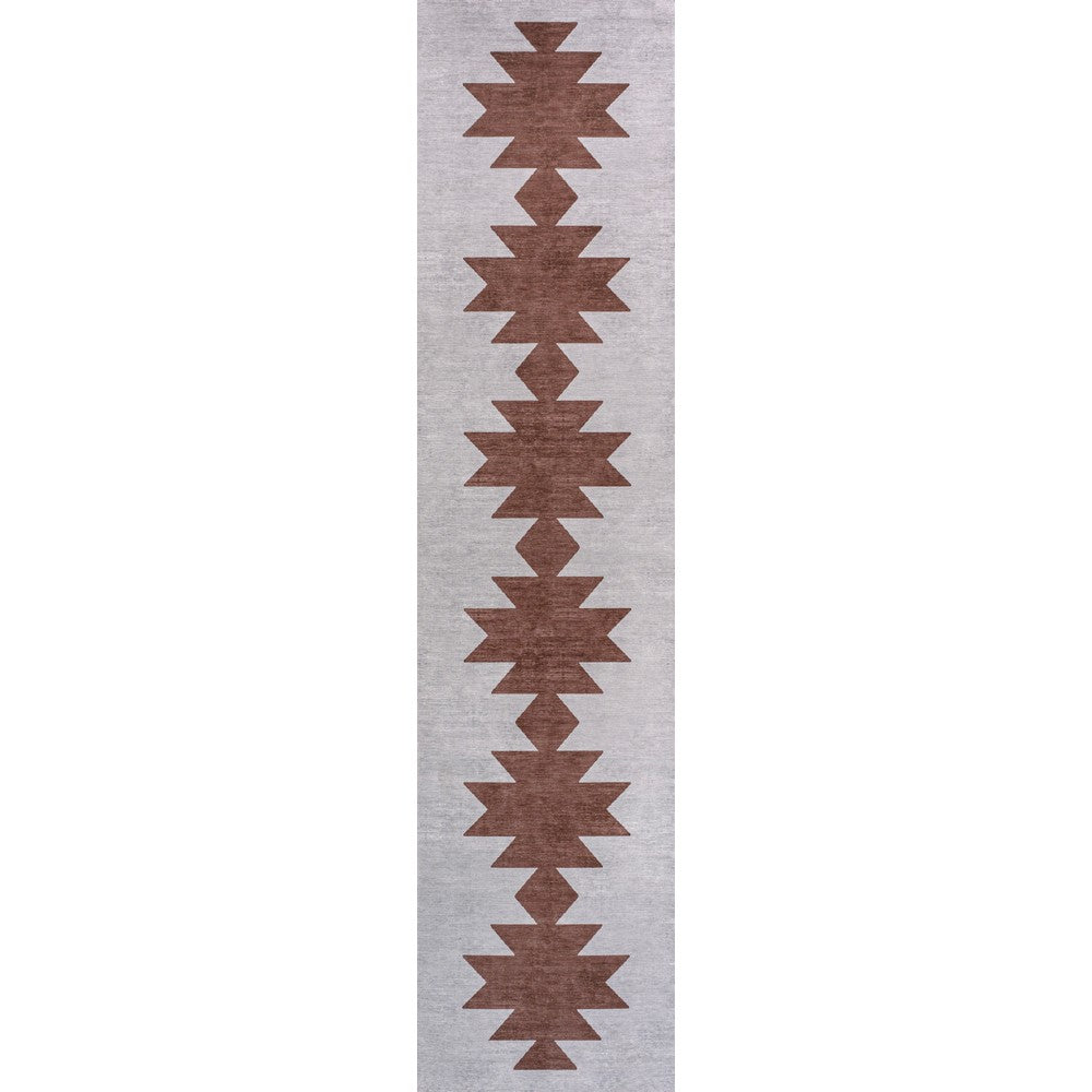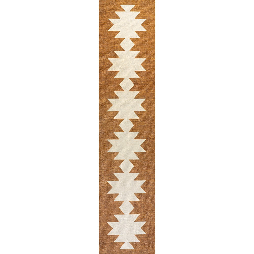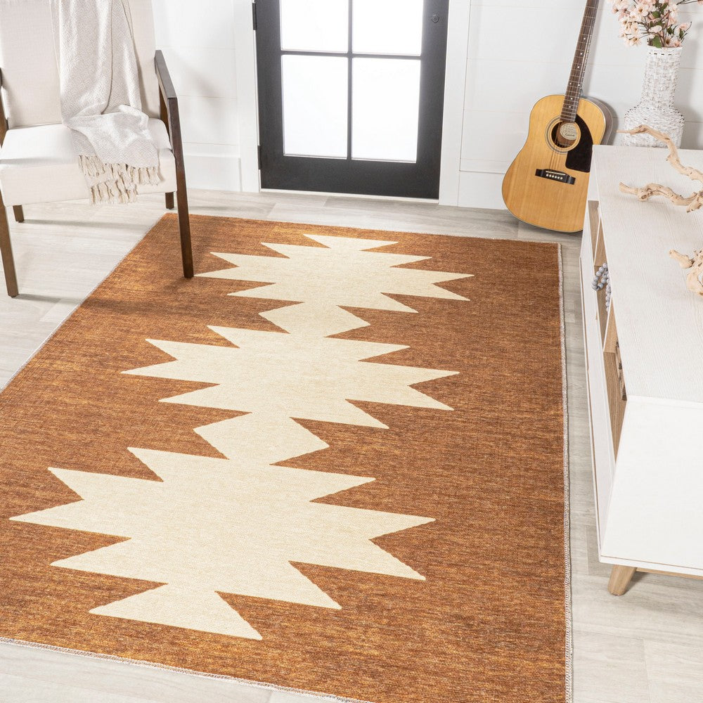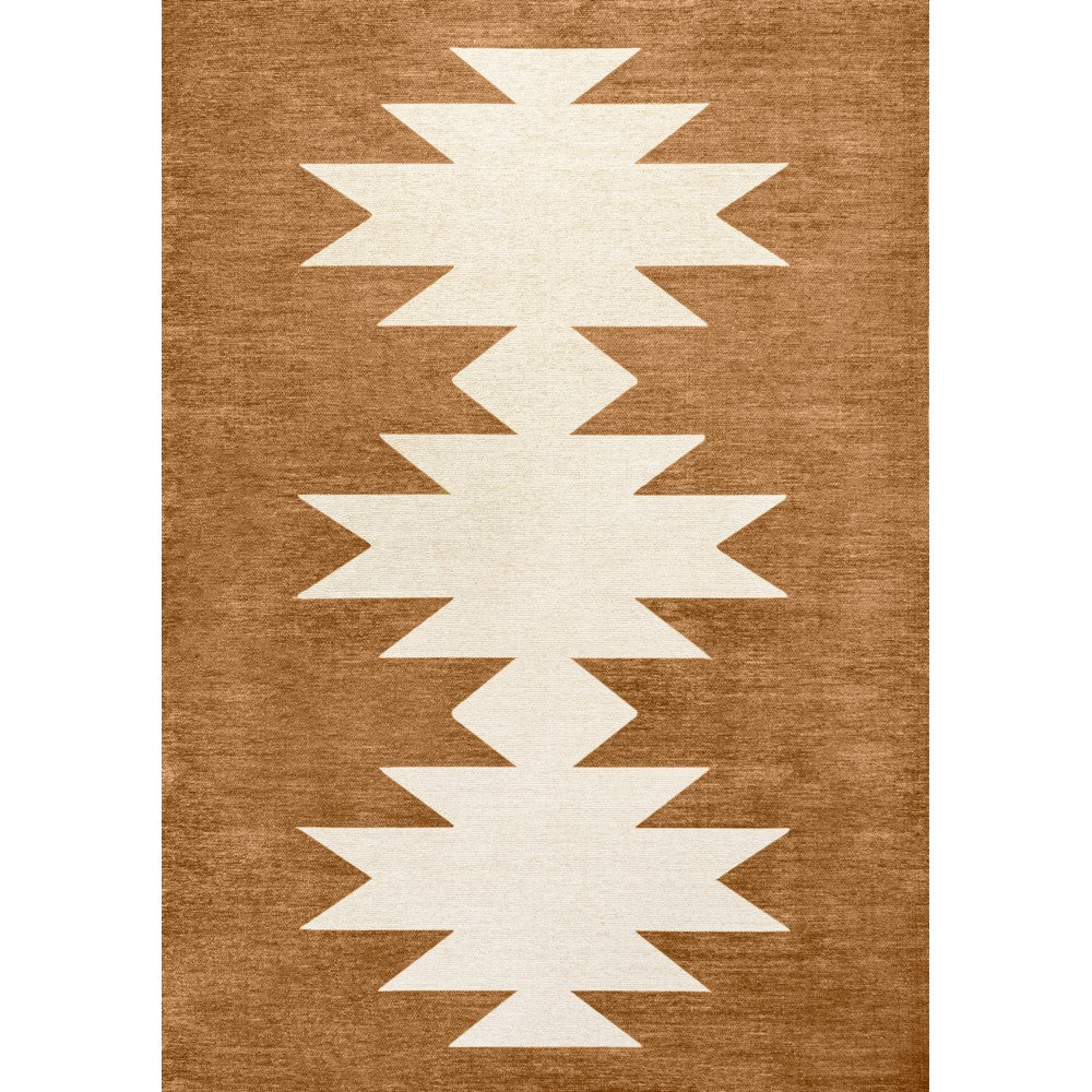 - The crisp design is woven with cream fibers on a soft terracotta background