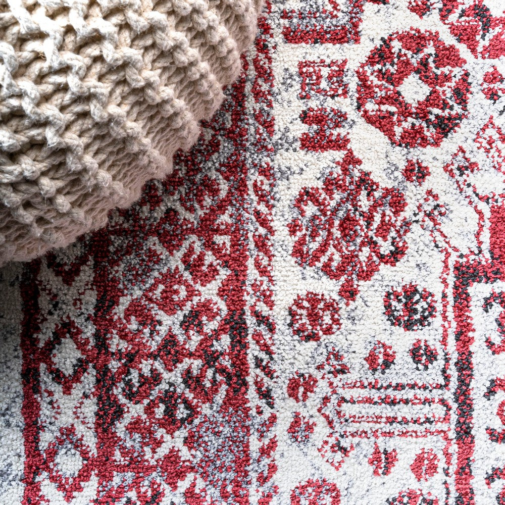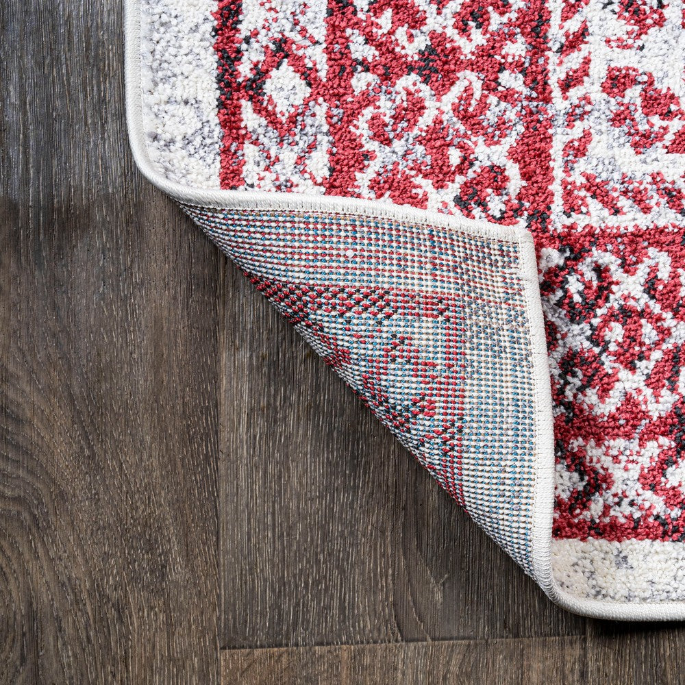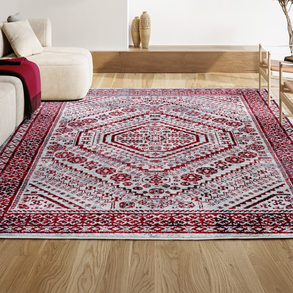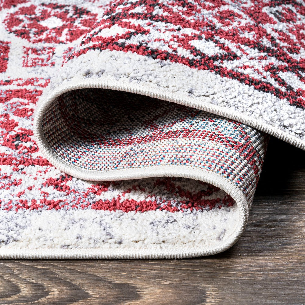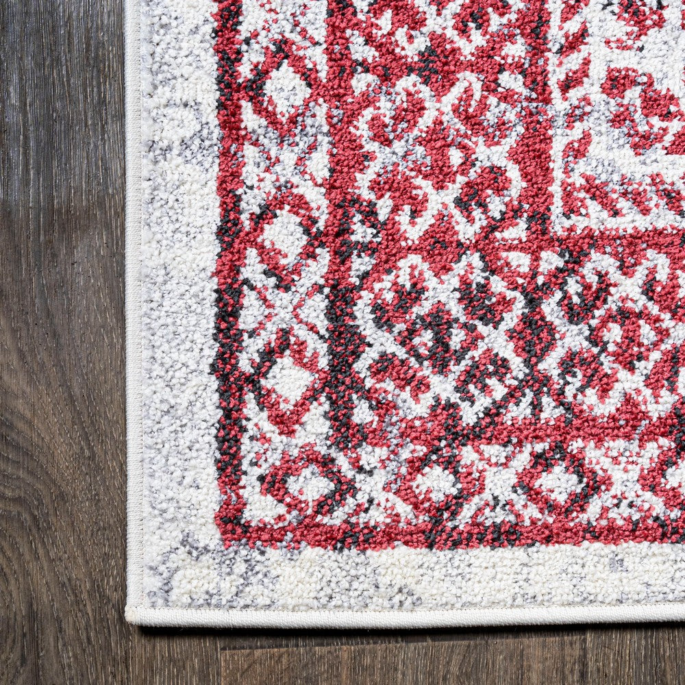 This ornate medallion rug has a geometric pattern that adds modern Bohemian style to a living room, bedroom, entry or kitchen. Varied tones of red mingled with a gray and ivory background give this rug a hand-woven, vintage vibe. The busy allover pattern is pet-friendly and great for kids too.