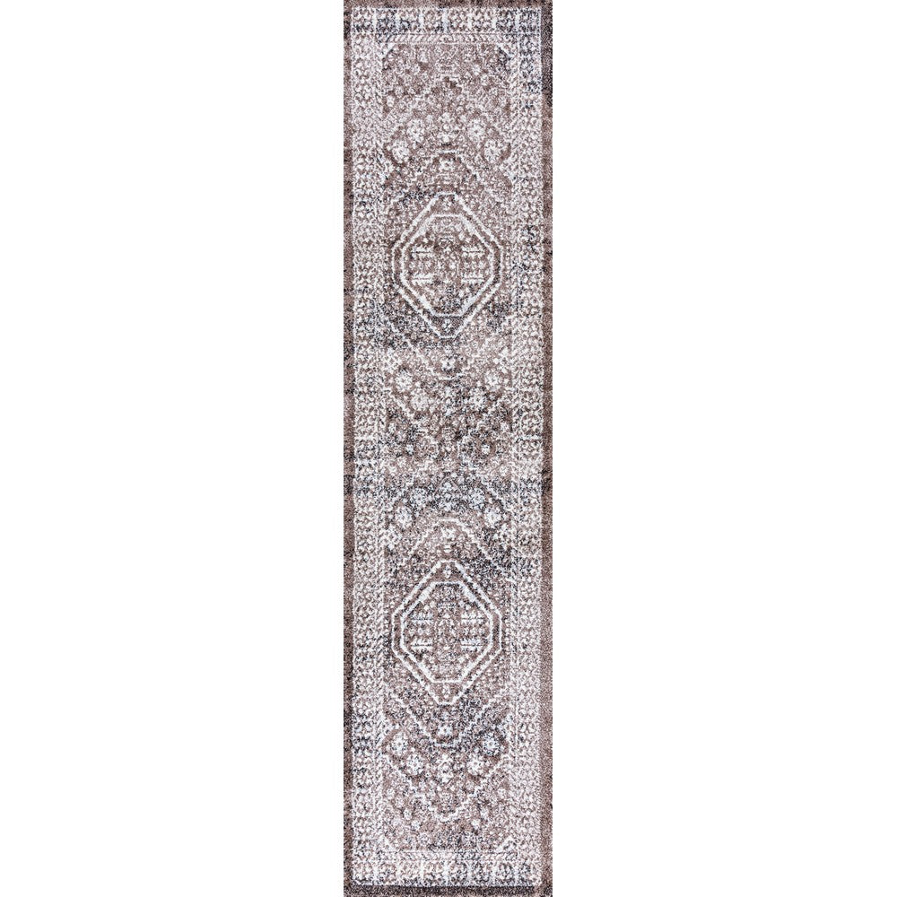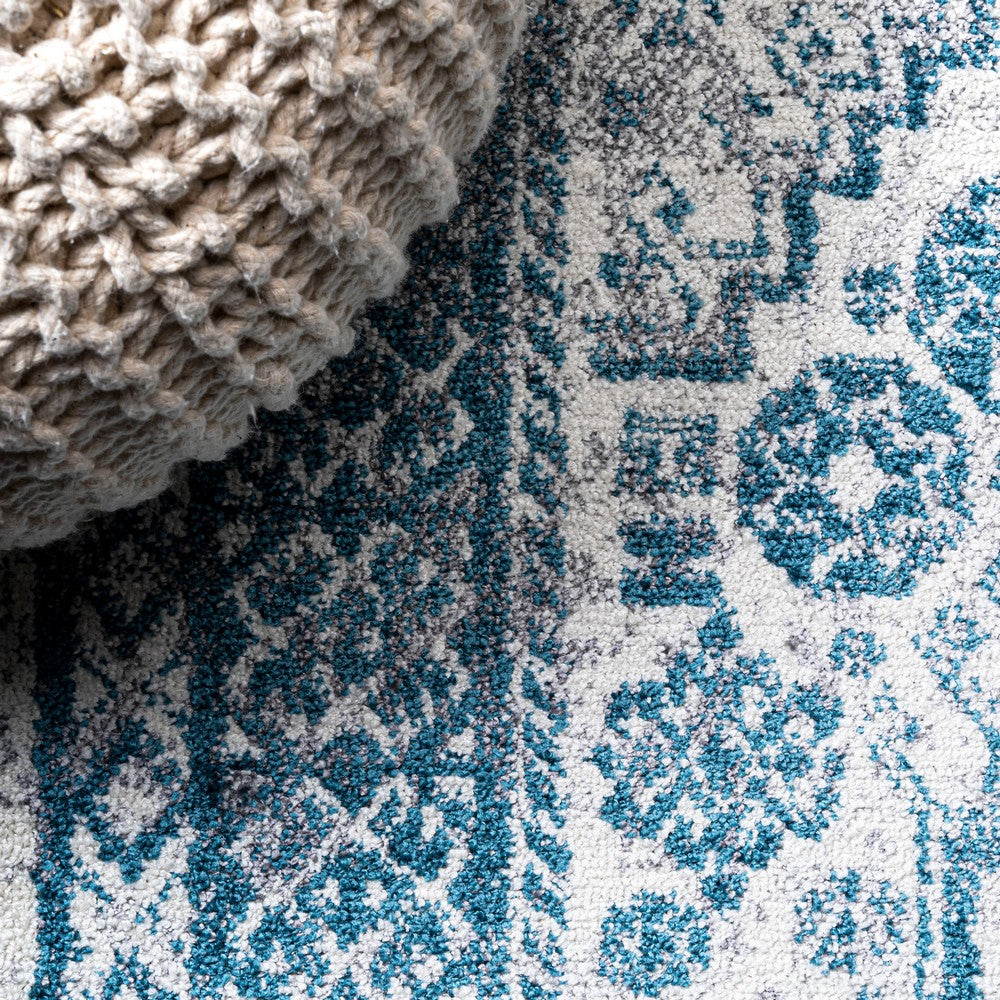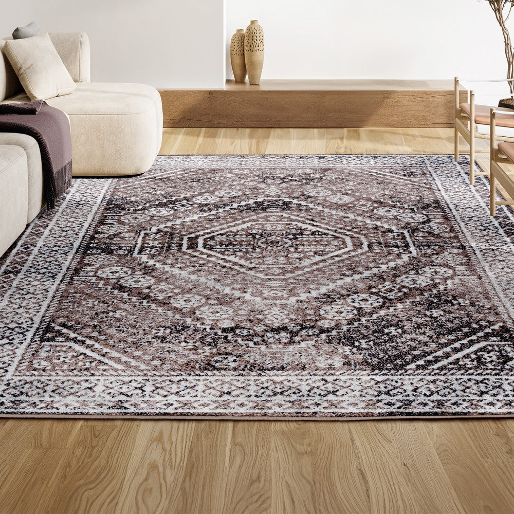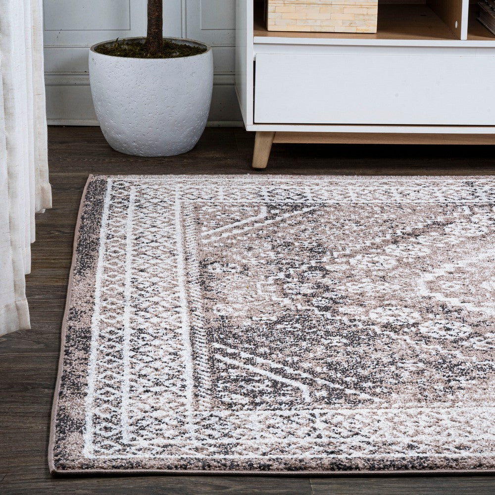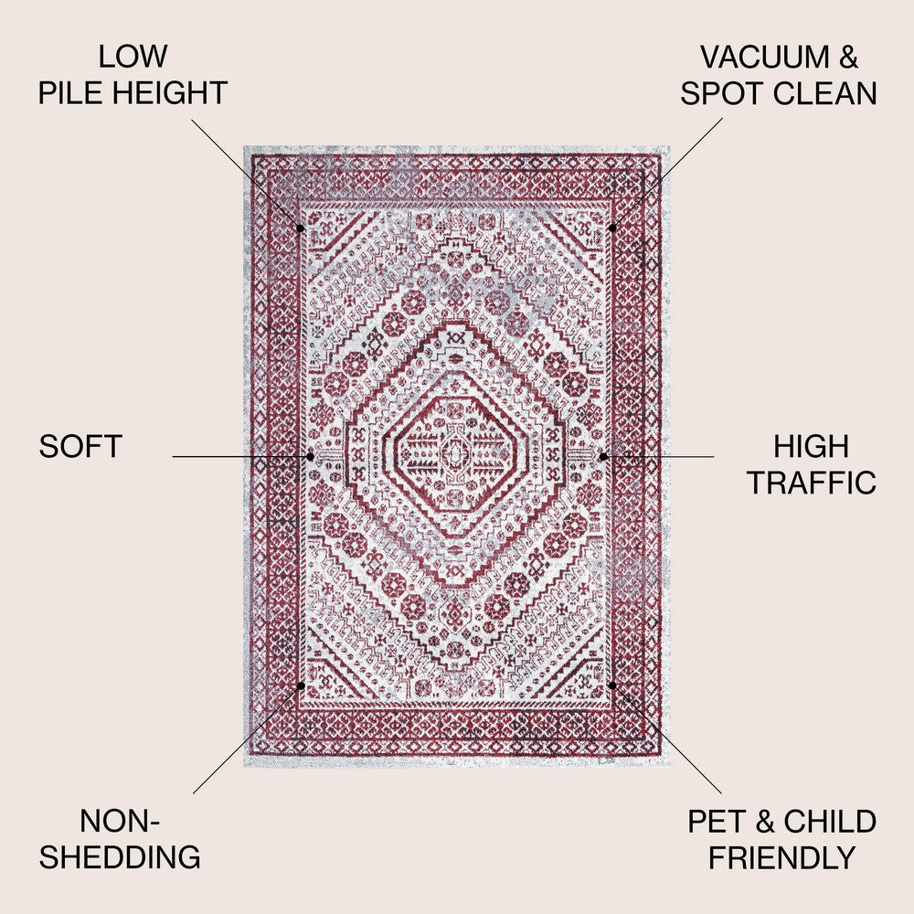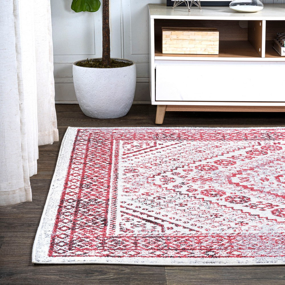 This ornate medallion rug has a geometric pattern that adds modern Bohemian style to a living room, bedroom, entry or kitchen. Varied tones of red mingled with a gray and ivory background give this rug a hand-woven, vintage vibe. The busy allover pattern is pet-friendly and great for kids too.
