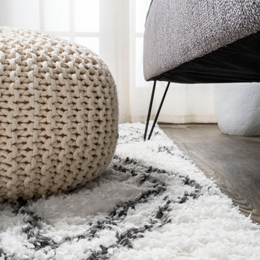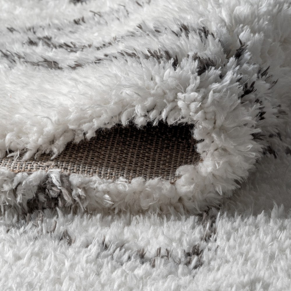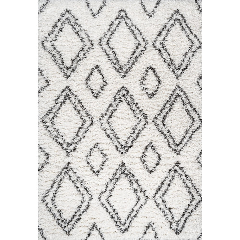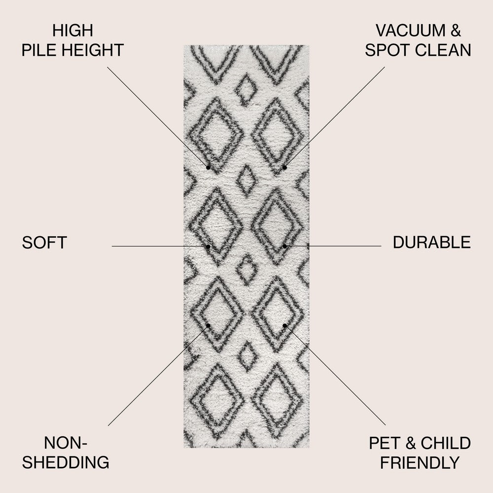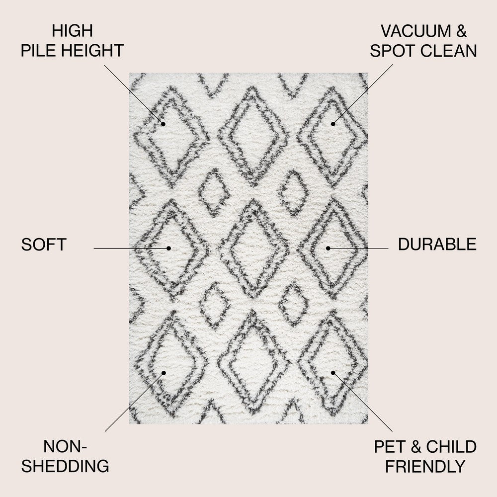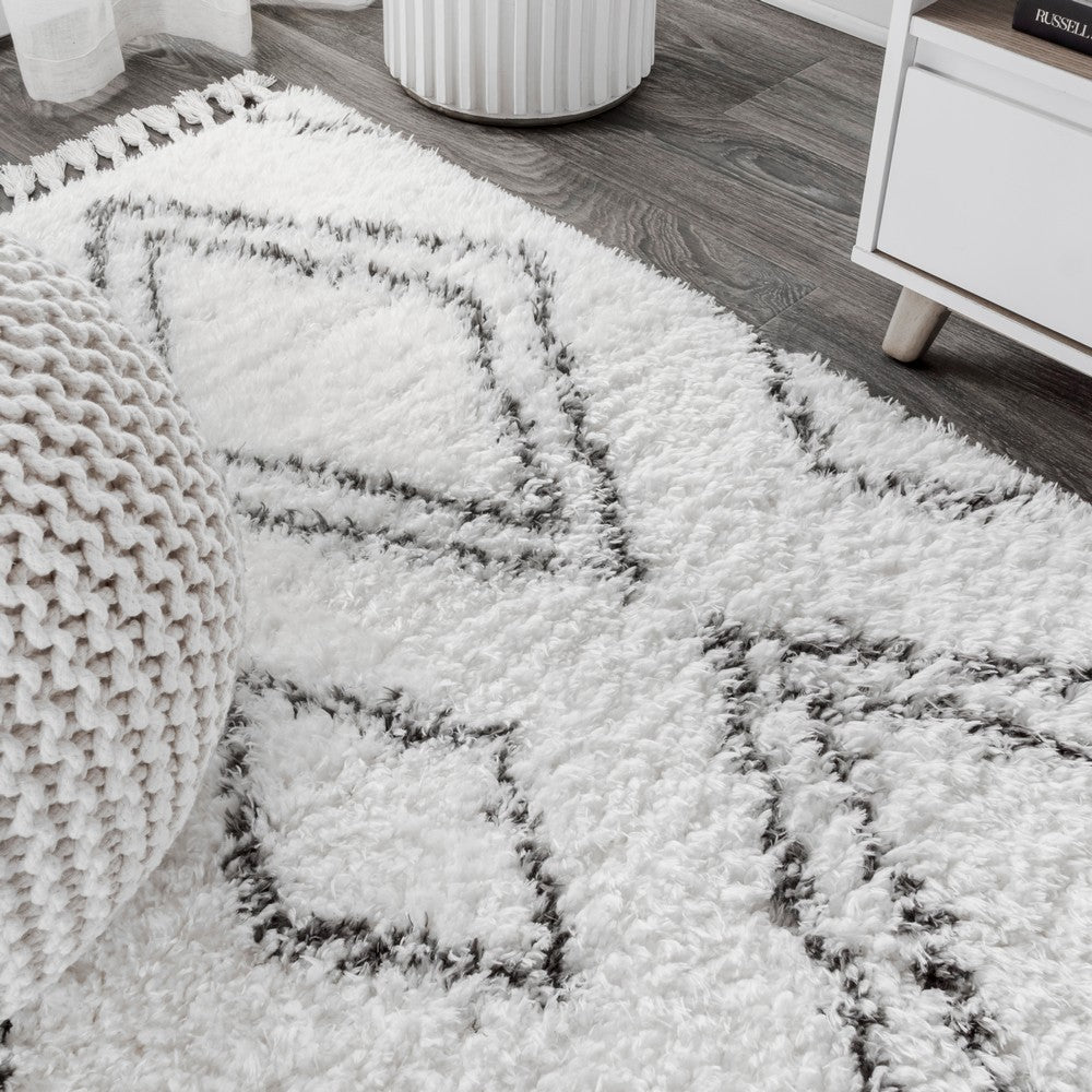 Inspired by vintage Beni Ourain Moroccan rugs, our Beni Shag rug has a repeating design of deep gray diamonds on a field of ivory. Tassel fringes at each end are braided in traditional style. Made of polyester yarns with a jute backing for durability. Add some Bohemian style to your home with our soft and shaggy Beni rug.