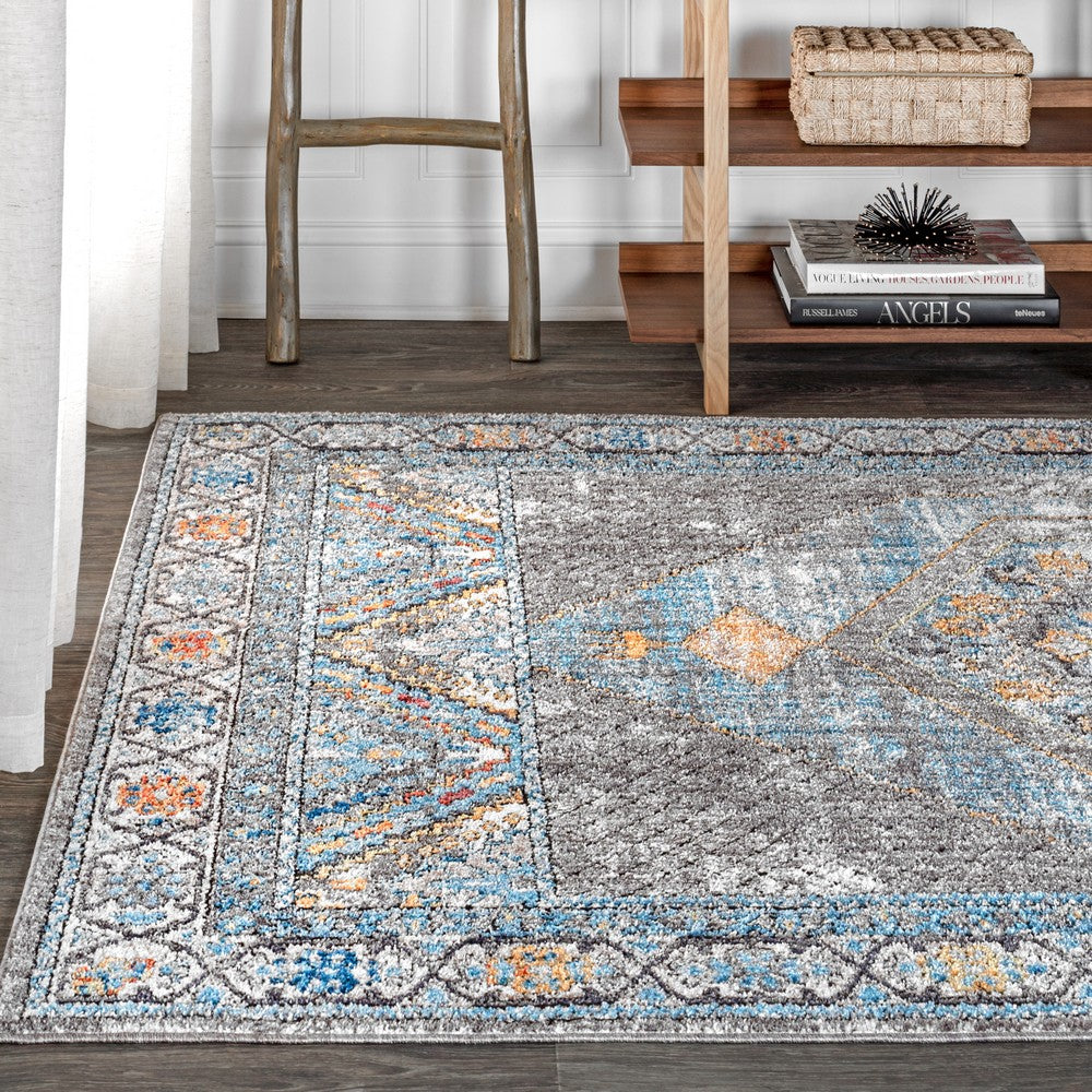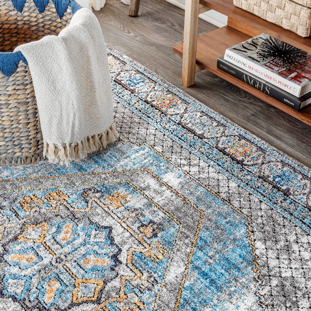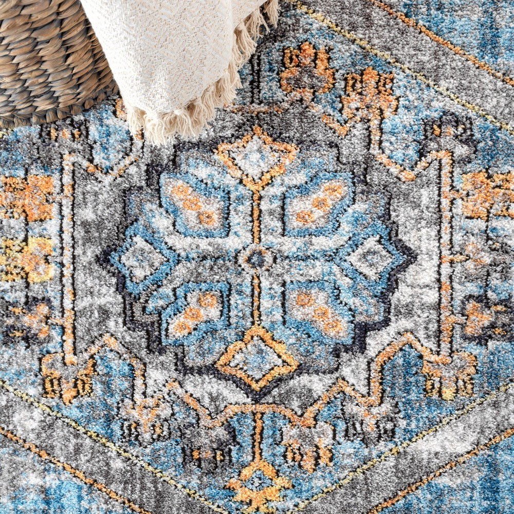 Vintage style meets a modern color scheme in our Izmit rug. A central medallion contains stylized floral and geometric elements in vibrant mustard yellow. The charcoal gray pattern is accented all over with turquoise and mustard, and varying shades of gray add to the vintage look.