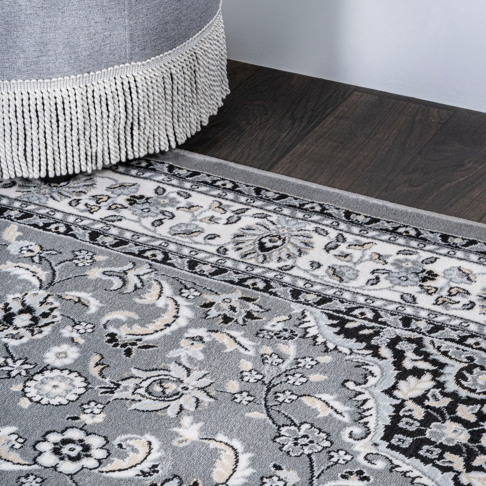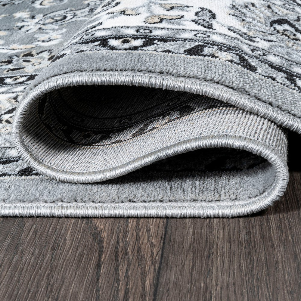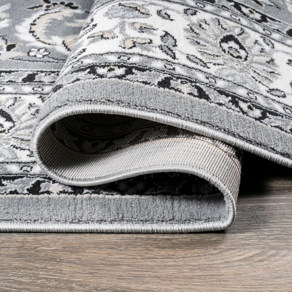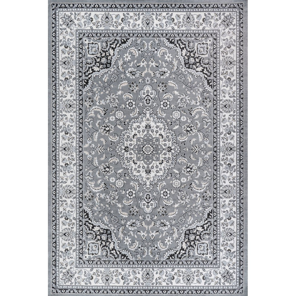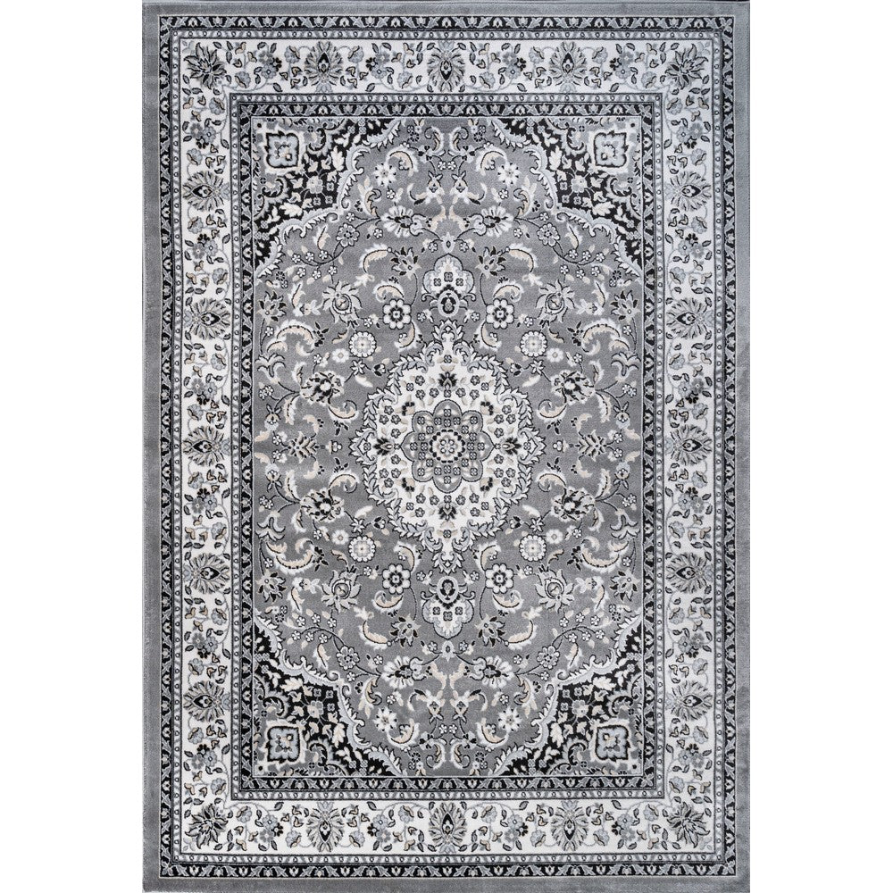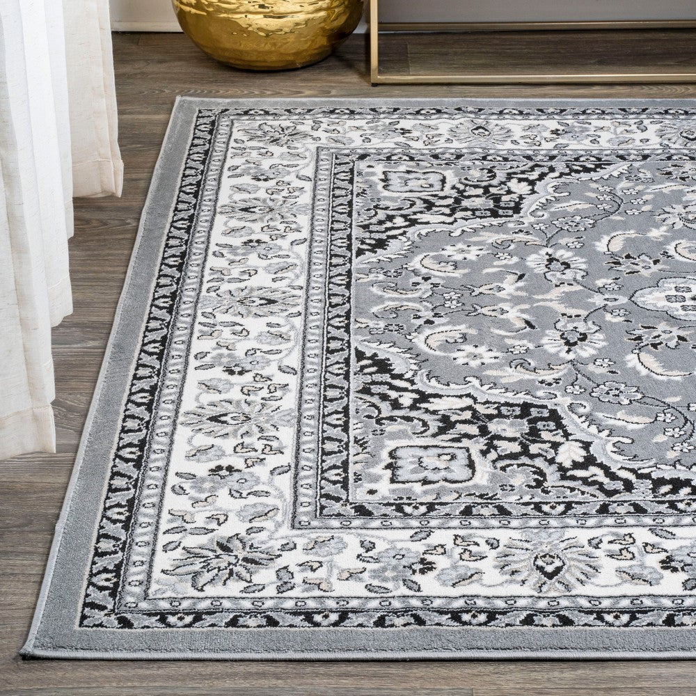 A classic medallion design gets a modern makeover in our Persian-style gray rug. The ornate pattern features a central field with traditional leaves and flowers, and an ivory palmette border. Add a neutral touch to your living room, family room, bedroom, dining room, or home office with this durable, family-friendly rug.