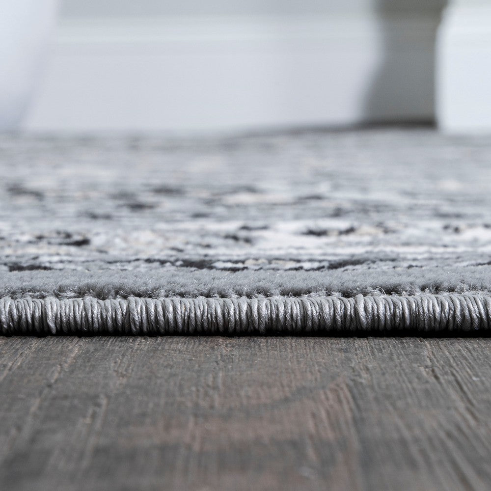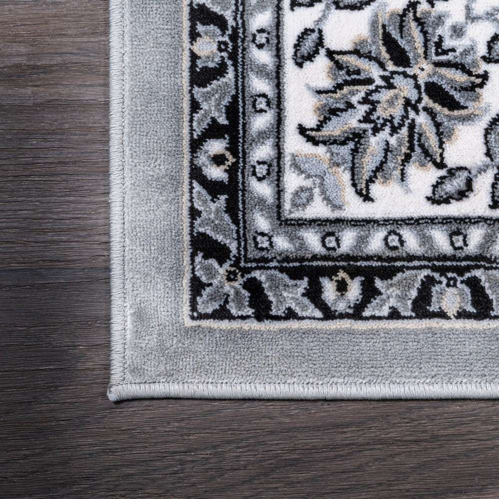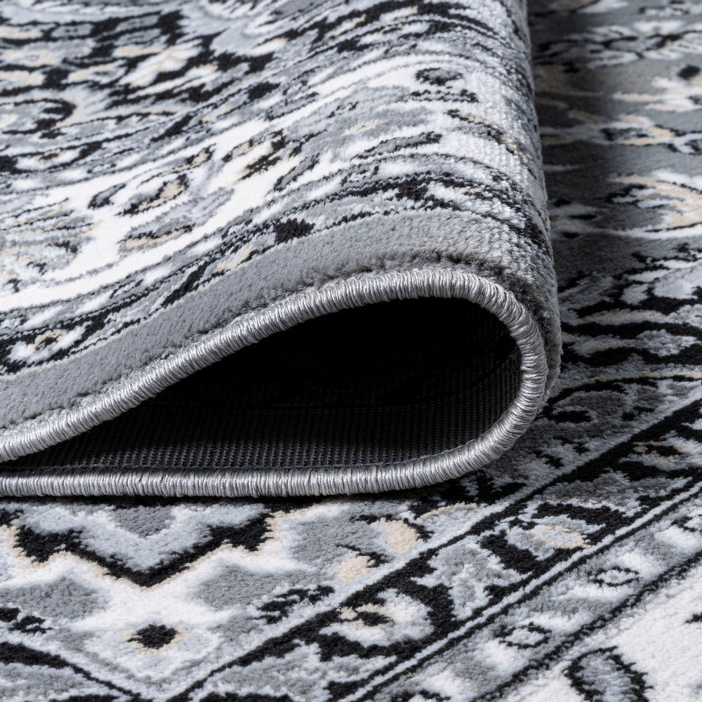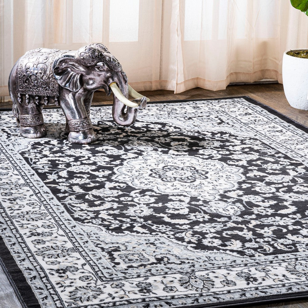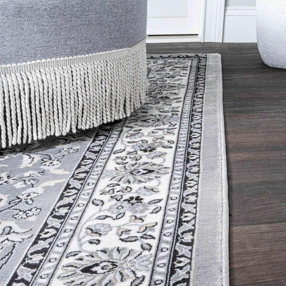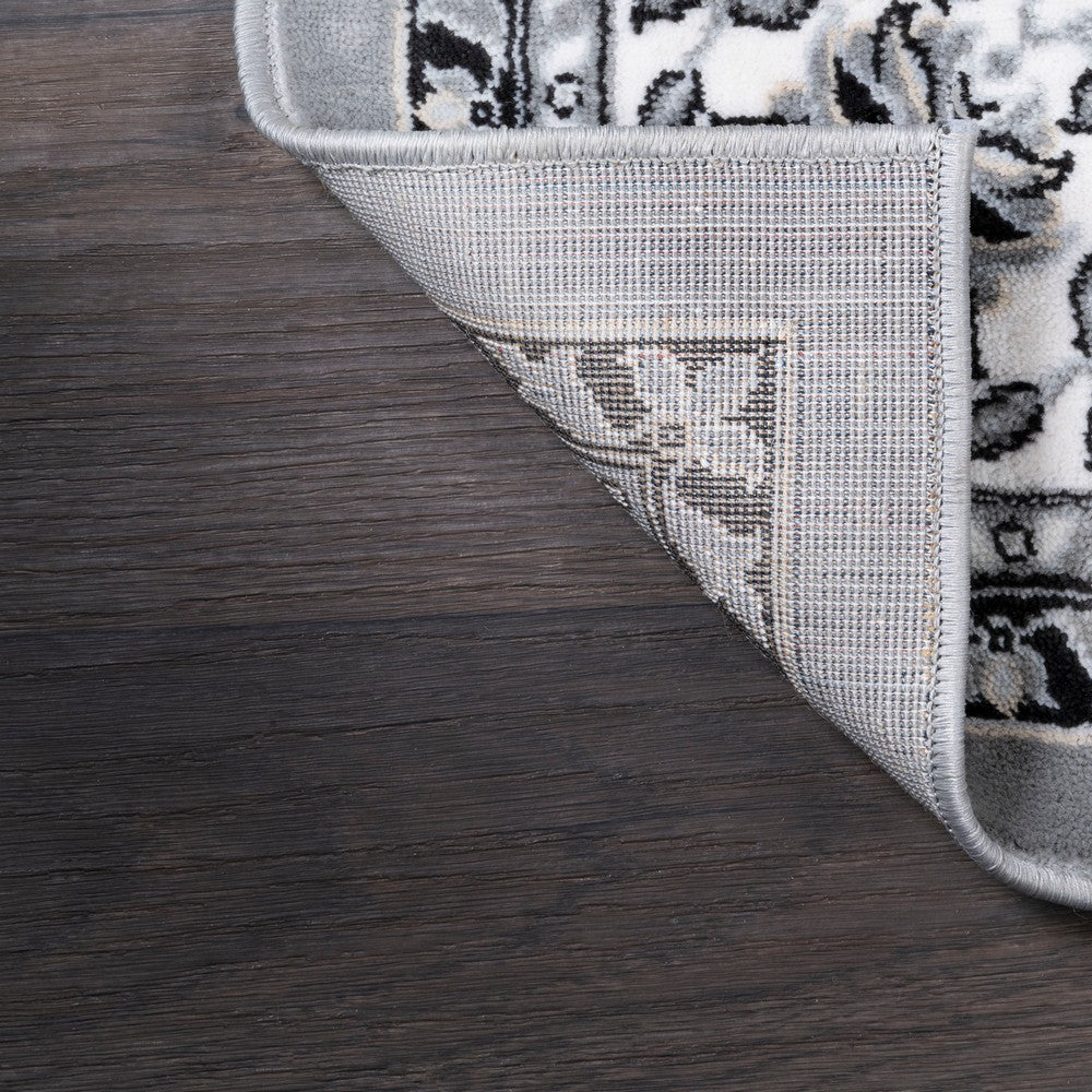 A classic medallion design gets a modern makeover in our Persian-style gray rug. The ornate pattern features a central field with traditional leaves and flowers, and an ivory palmette border. Add a neutral touch to your living room, family room, bedroom, dining room, or home office with this durable, family-friendly rug.