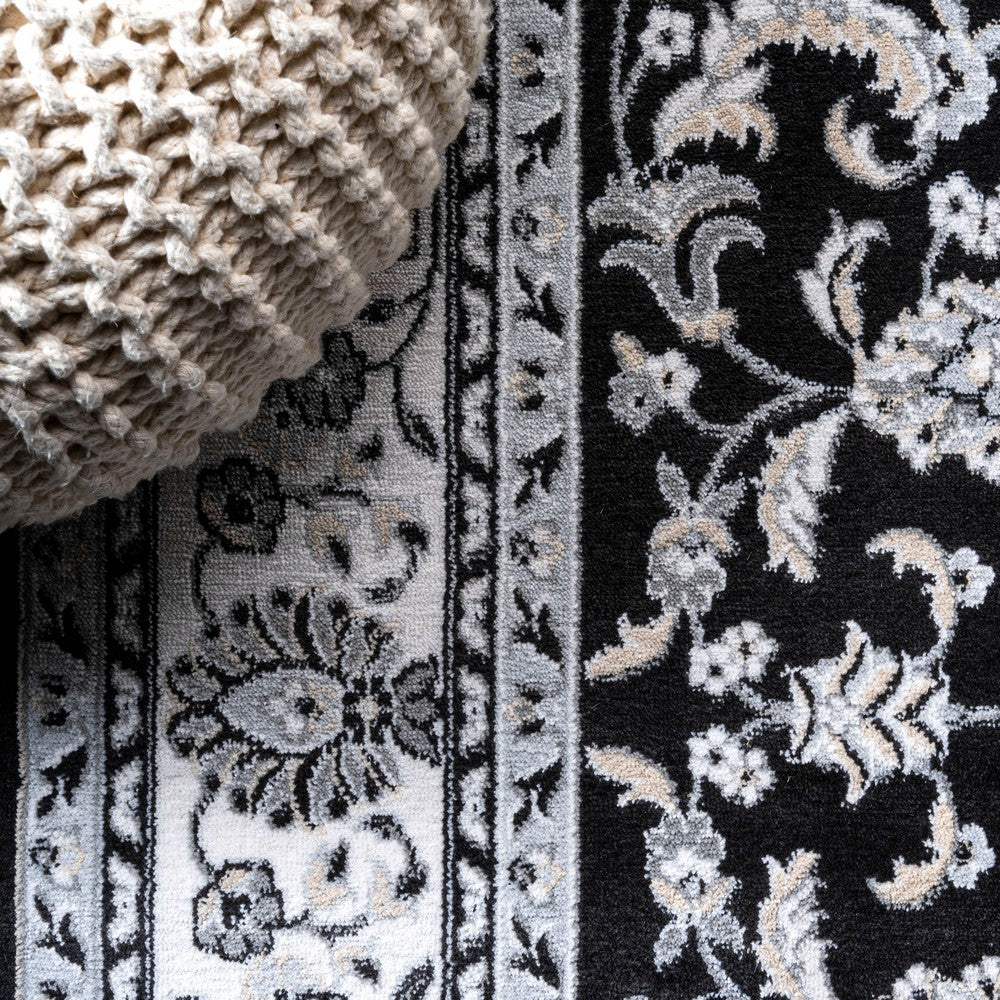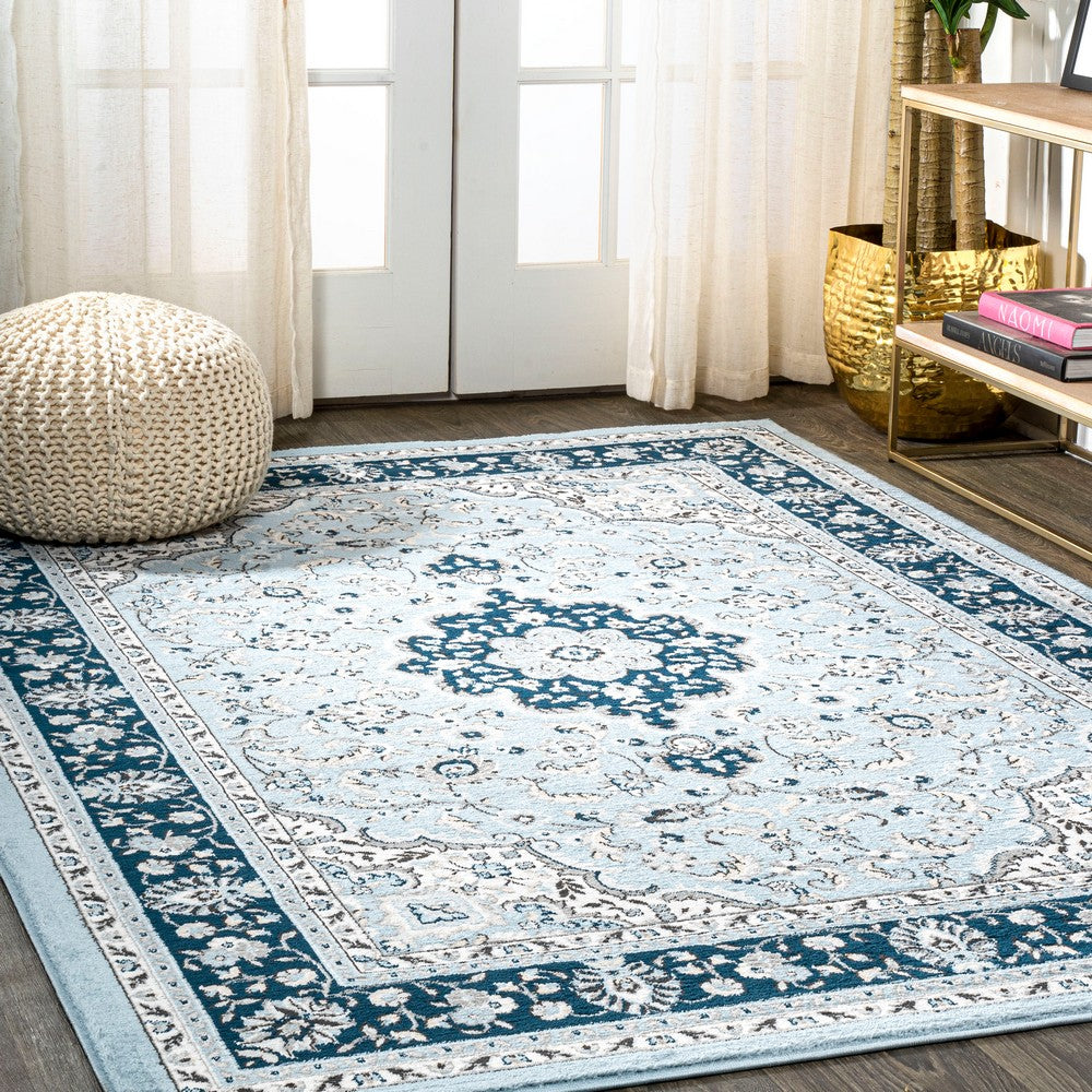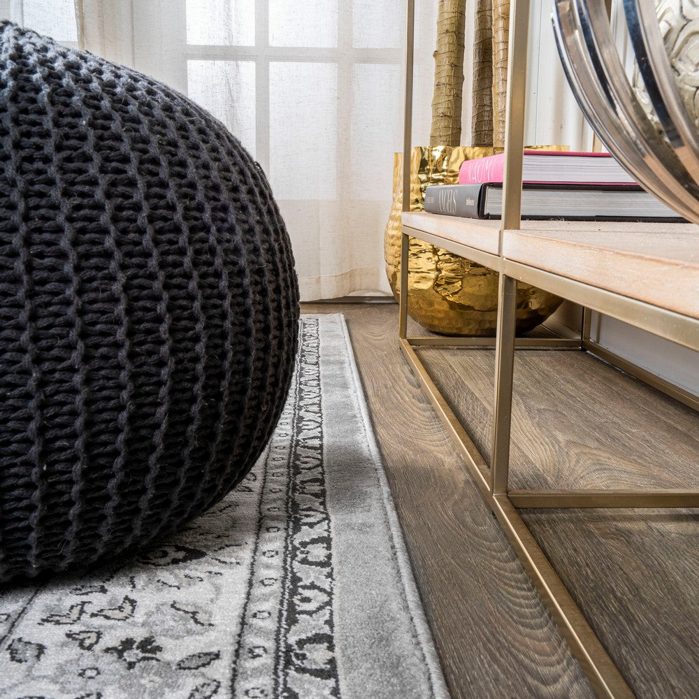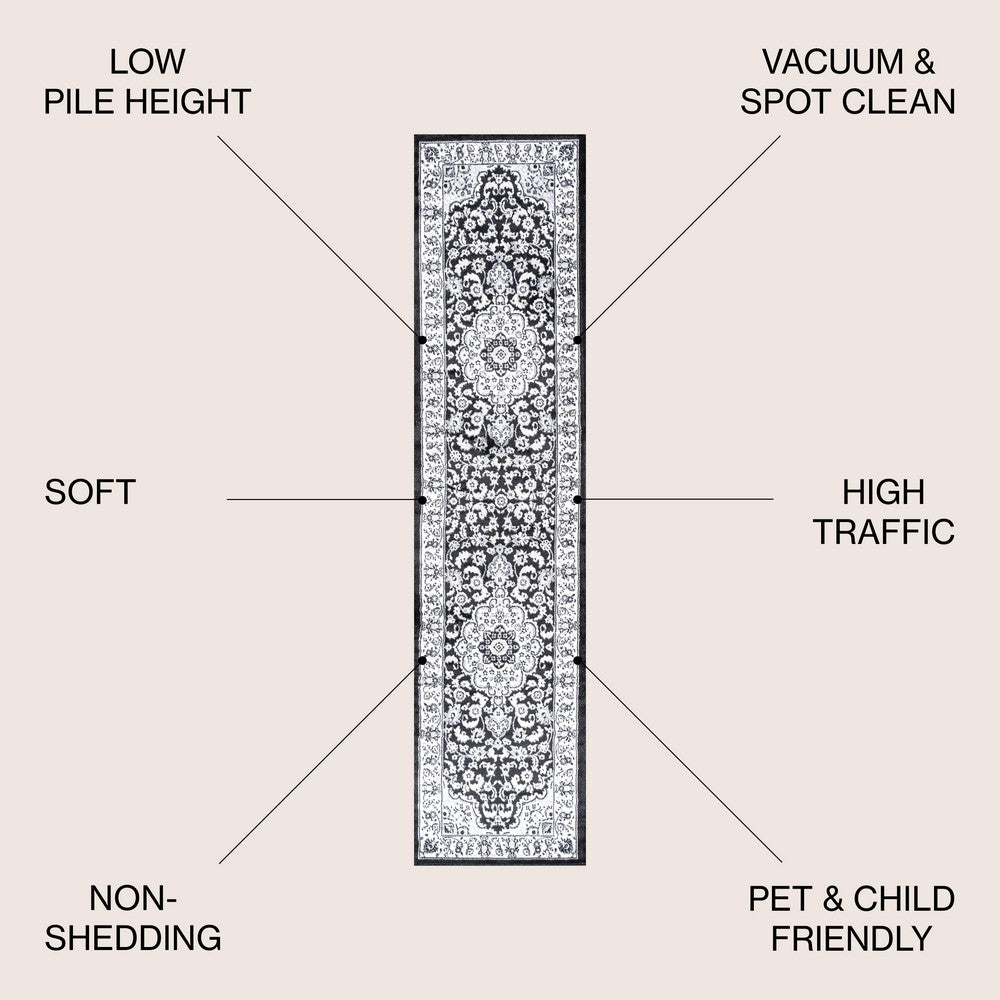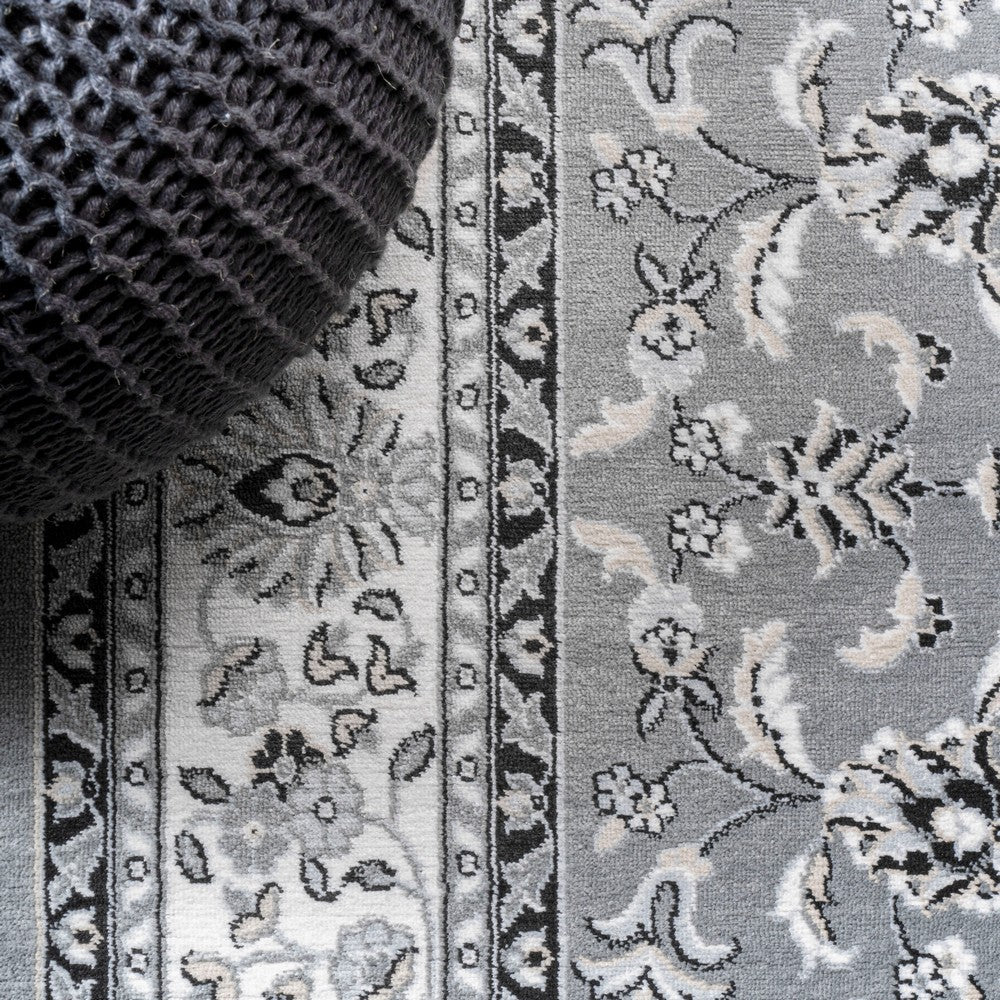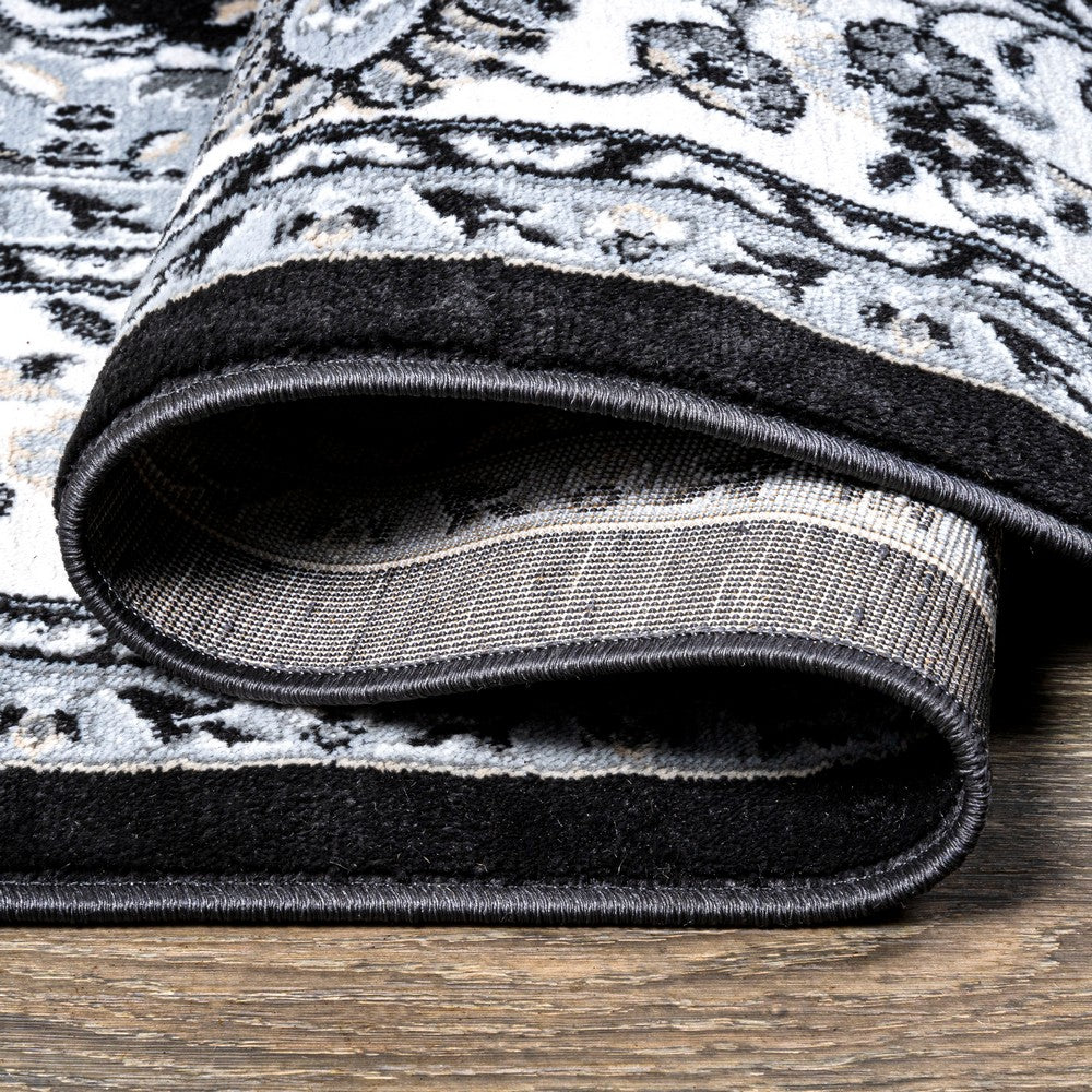 A classic medallion design gets a modern makeover in our Persian-style gray rug. The ornate pattern features a central field with traditional leaves and flowers, and an ivory palmette border. Add a neutral touch to your living room, family room, bedroom, dining room, or home office with this durable, family-friendly rug.