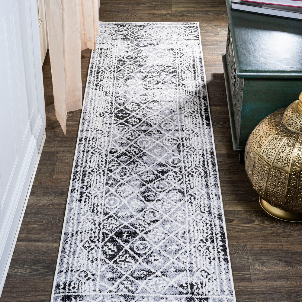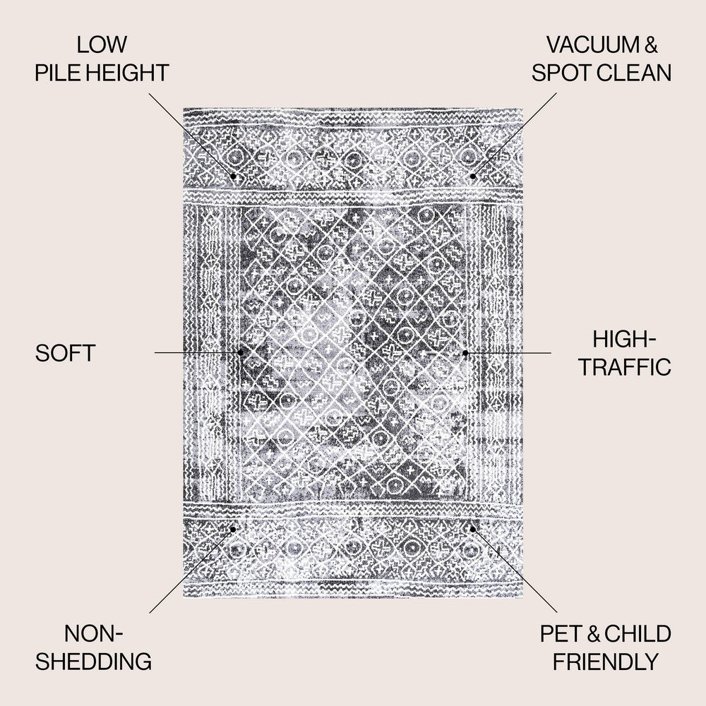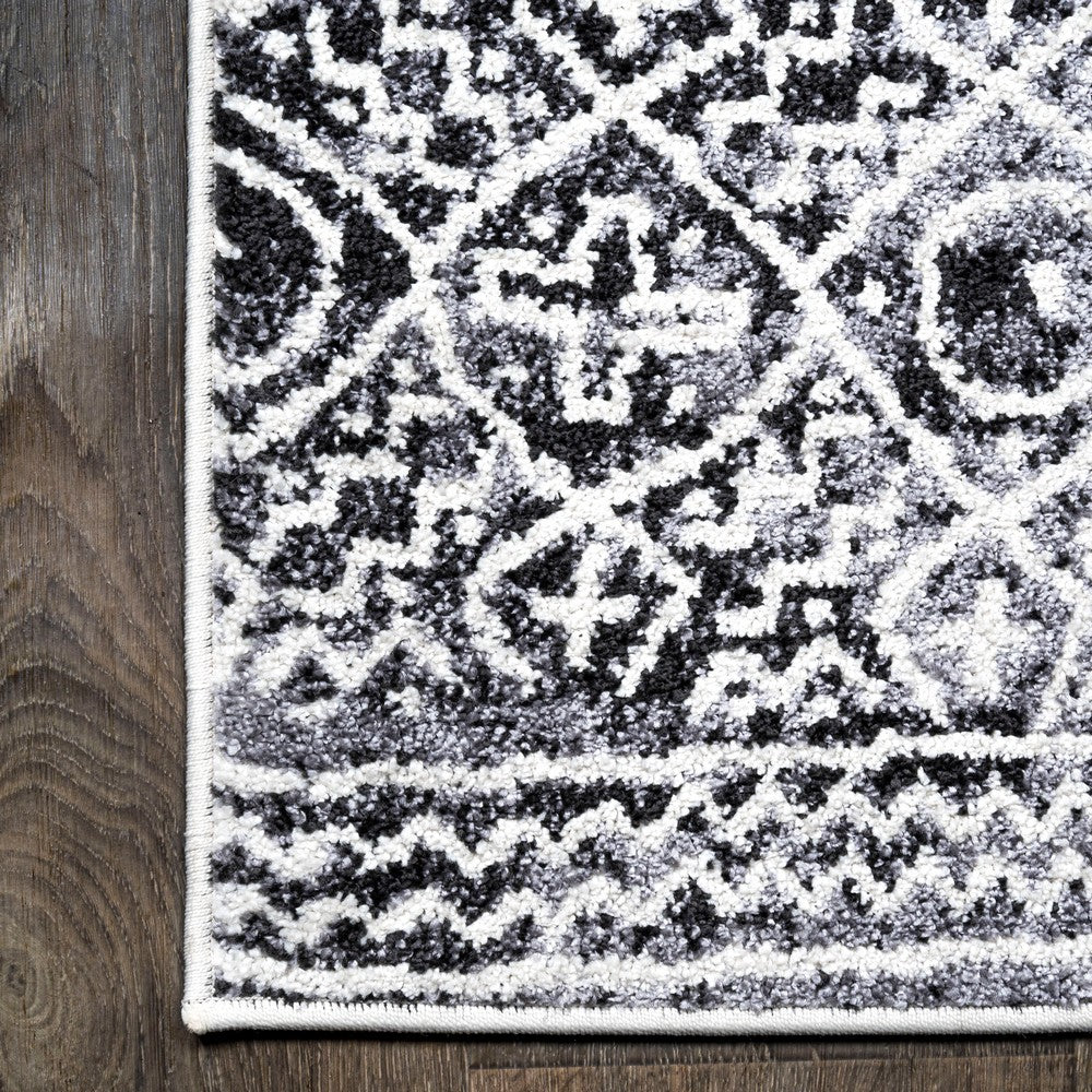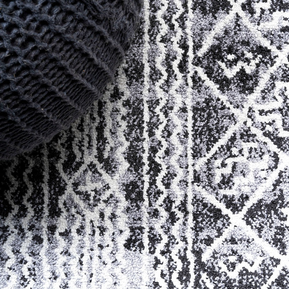 Inspired by vintage Moroccan rugs, our easy-care rug has a family-friendly short pile. The classic black and ivory pattern features geometric diamonds with a graphic border. Anchor your modern space; add minimalist flair to a bedroom, living room, dining room, kitchen or entry; this is a durable rug with timeless style.