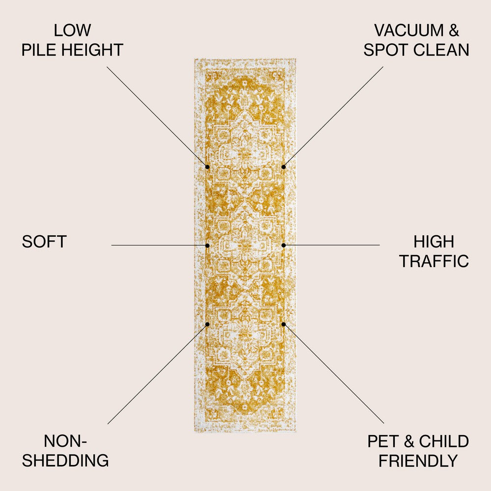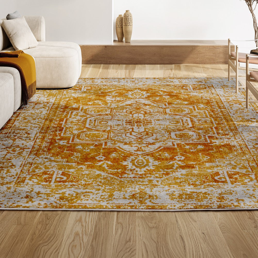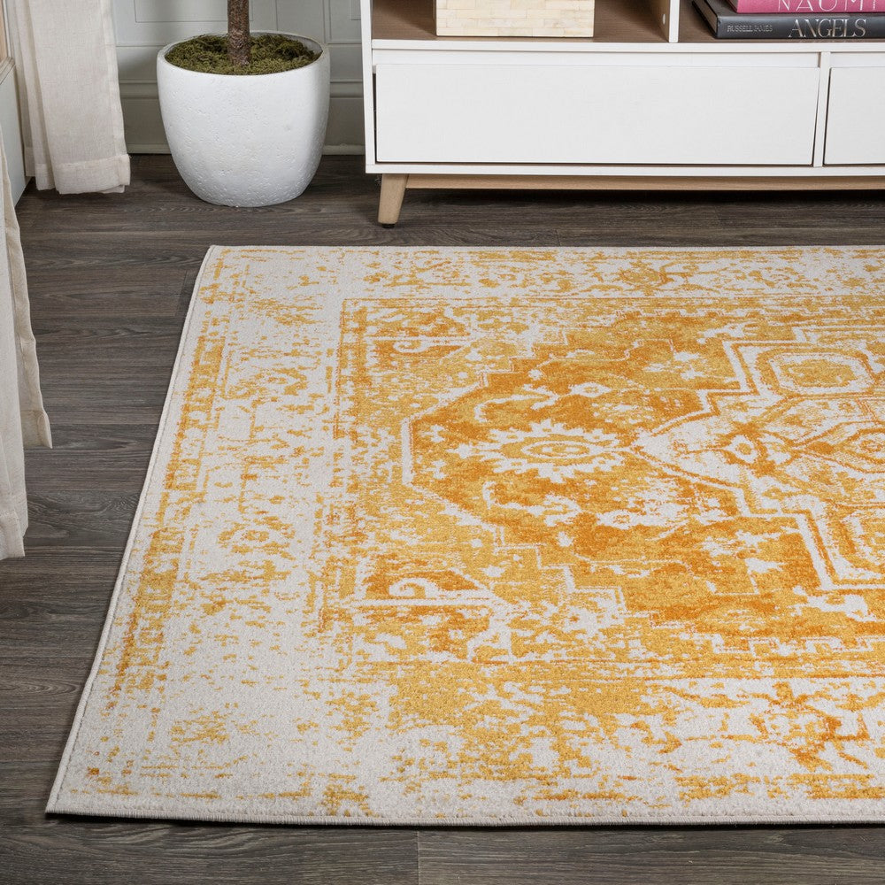 An ornate medallion in the center of this design recalls traditional Persian rugs, but the orange color palette has a mid-century, Bohemian vibe. Ivory mingled with shades of orange creates a vintage, distressed look. Use this stylish rug in a city apartment or coastal home, for a bedroom, living room, dining room or entry.