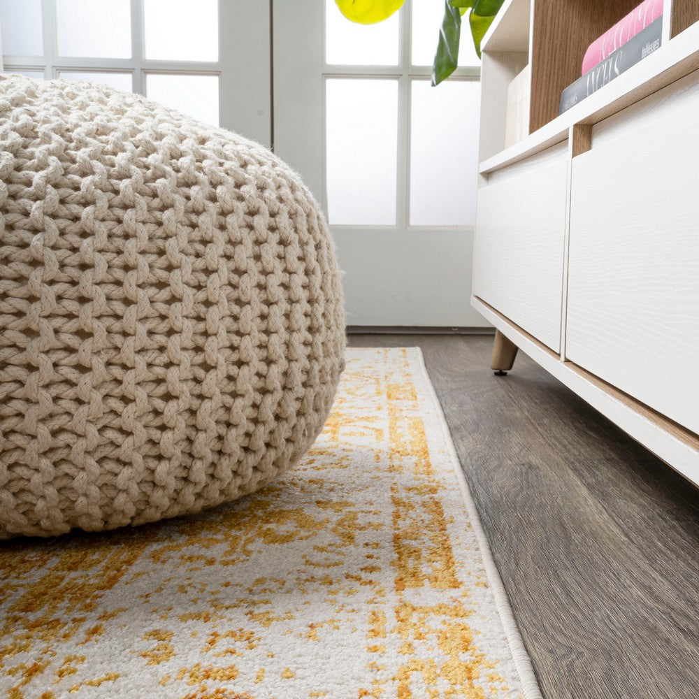 • The woven ivory and orange color scheme is a vibrant update to a traditional medallion rug pattern
