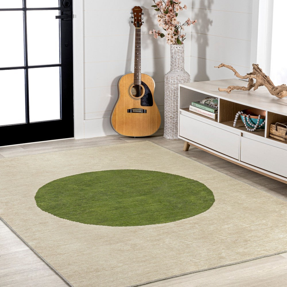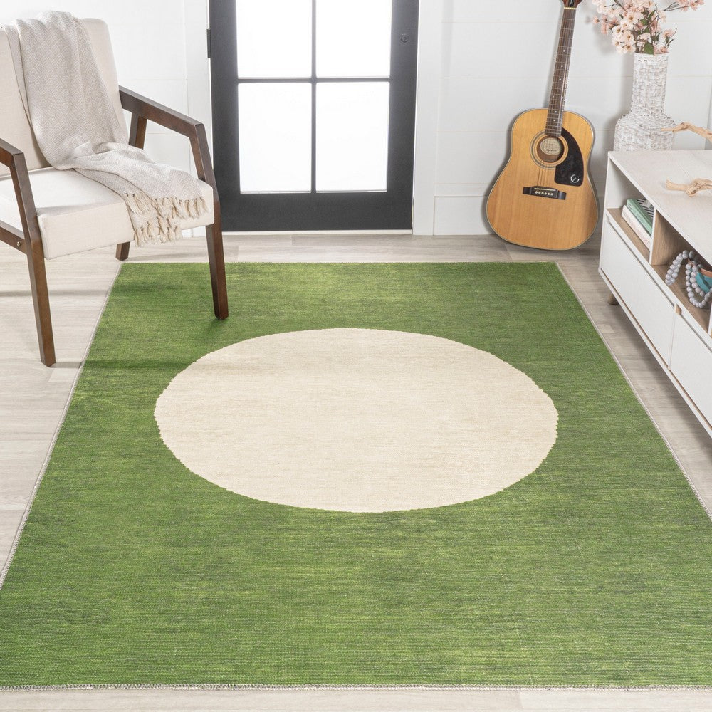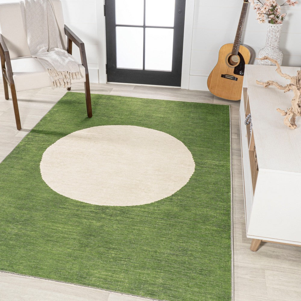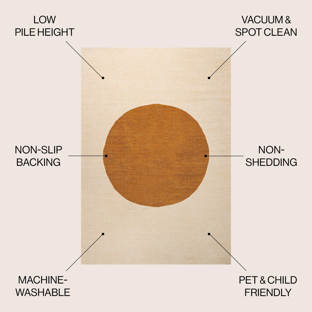 Inspired by Scandinavian design, our machine washable geometric rug has minimalist simplicity. The central circle design is woven in a modern, two-tone color palette. Add graphic punch to your living room, dining room, entry, or bedroom with this easy-care rug.