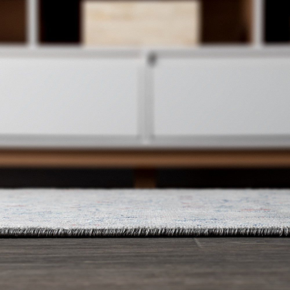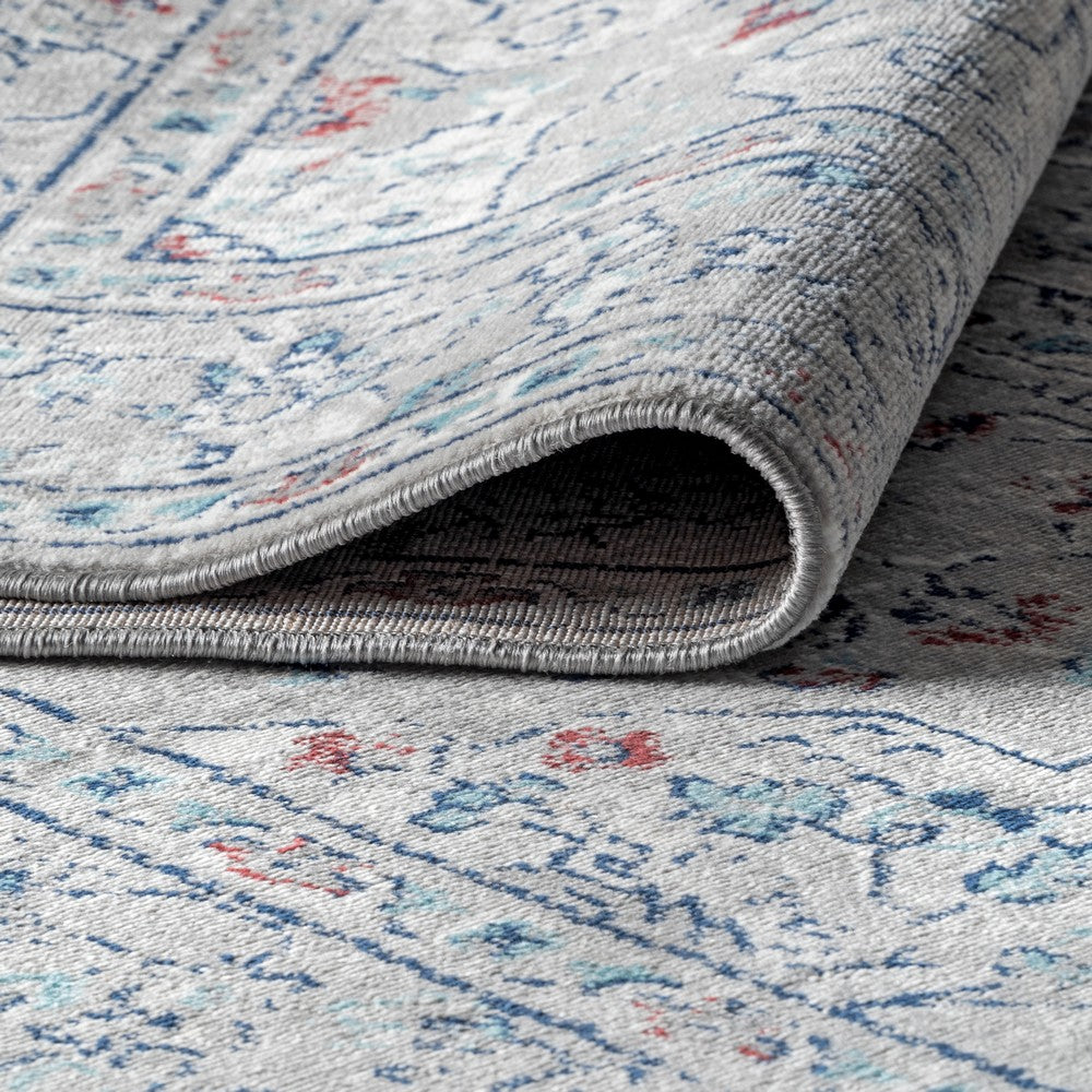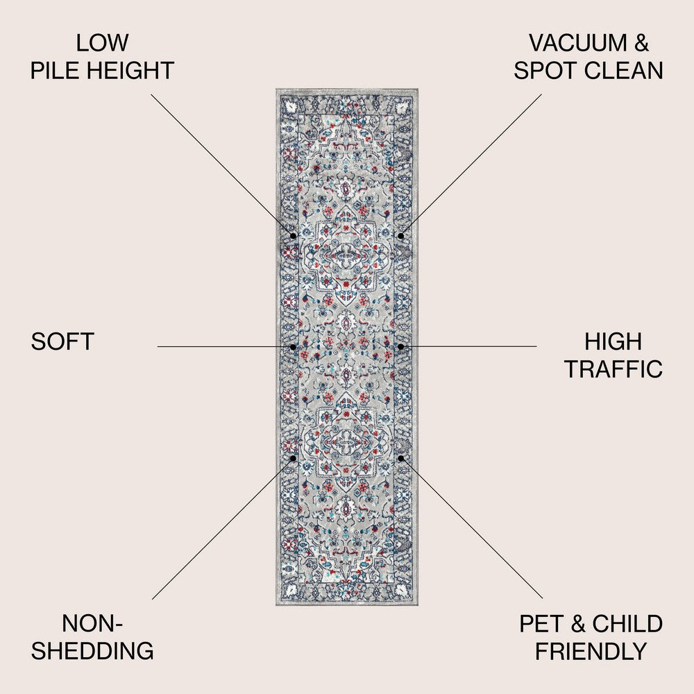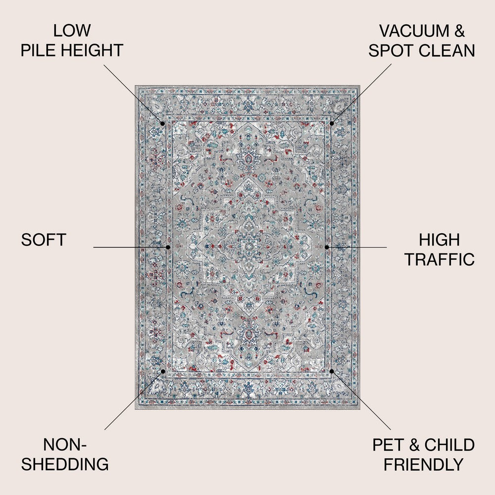Featuring an ornate ivory medallion design on a light gray base, our area rug boasts an exceptionally plush underfoot feel. Accented with blues and reds, it has the look of a tradition Persian style, but in the modern materials of today. The synthetic fiber is easy to clean, unlikely to shed, and pet-friendly; this versatile rug is perfect for high-traffic areas.