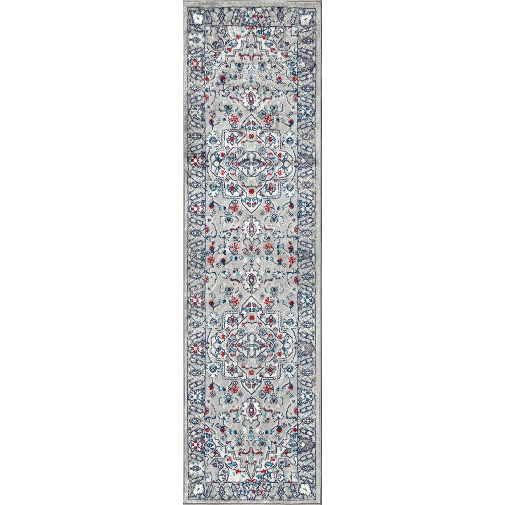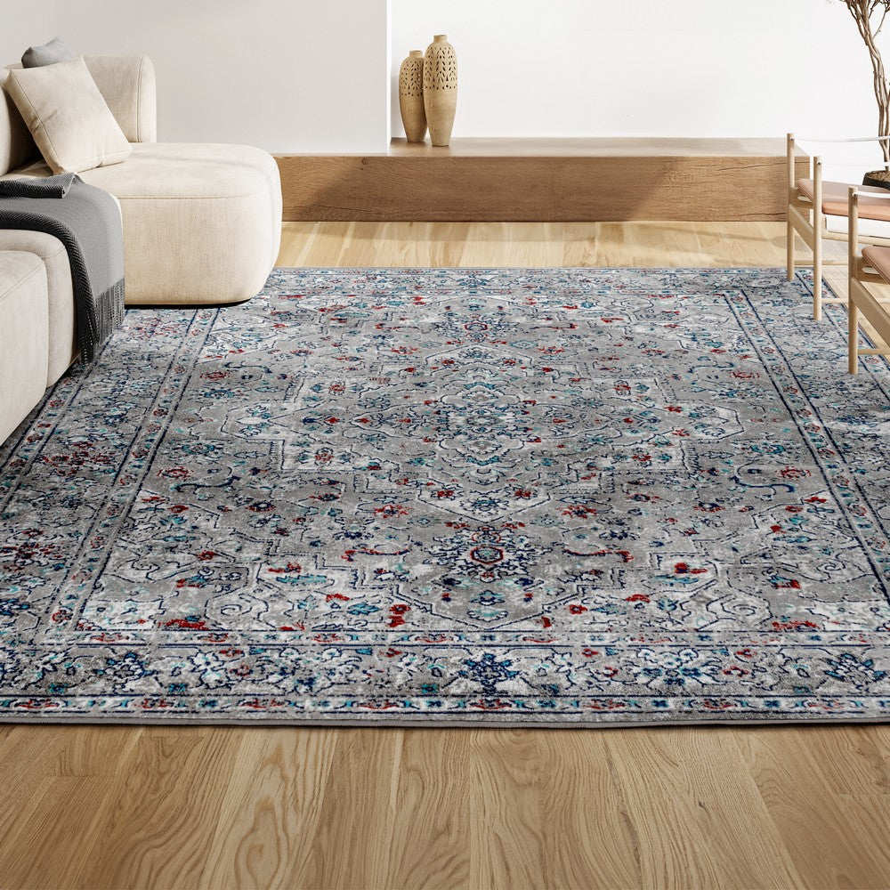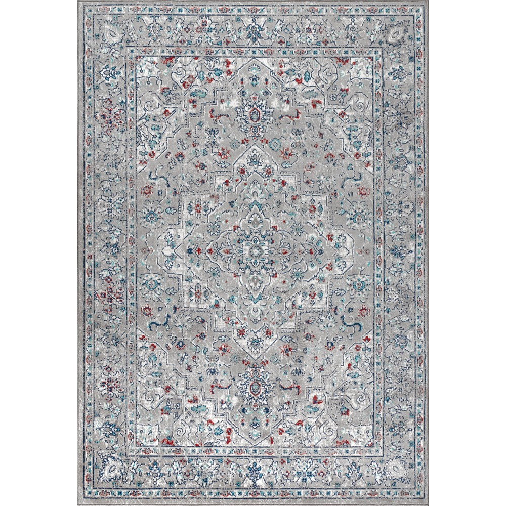 - The gray base is accented with red and blue florals and an ivory medallion motif