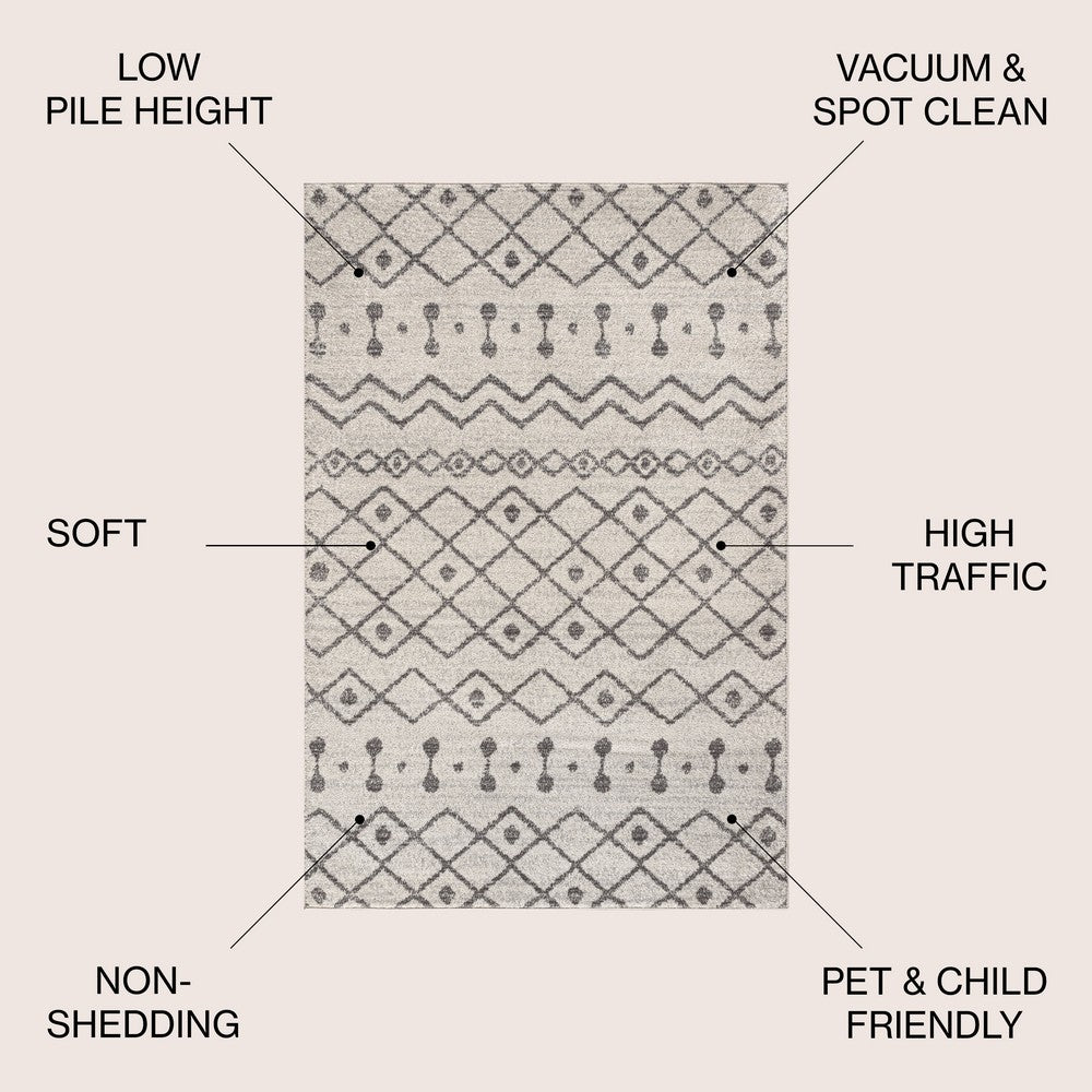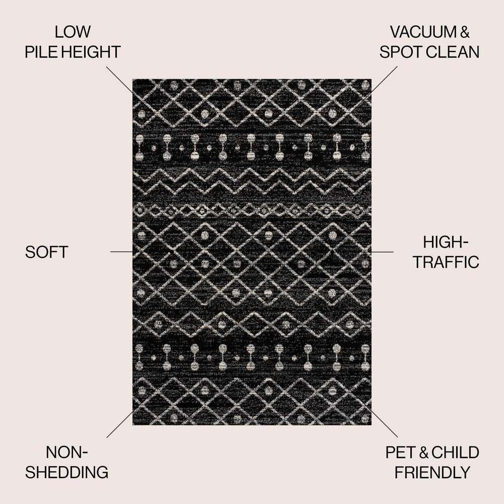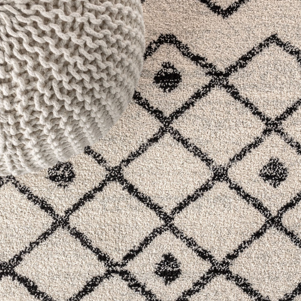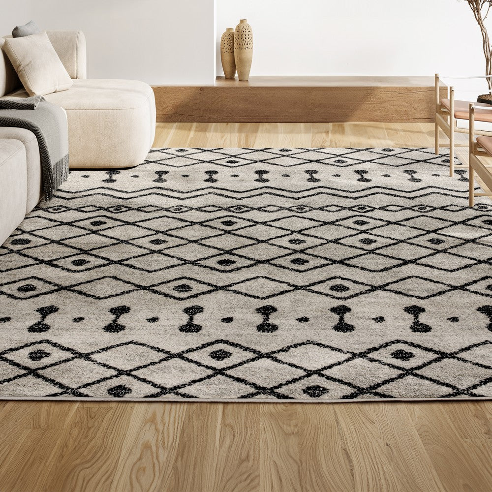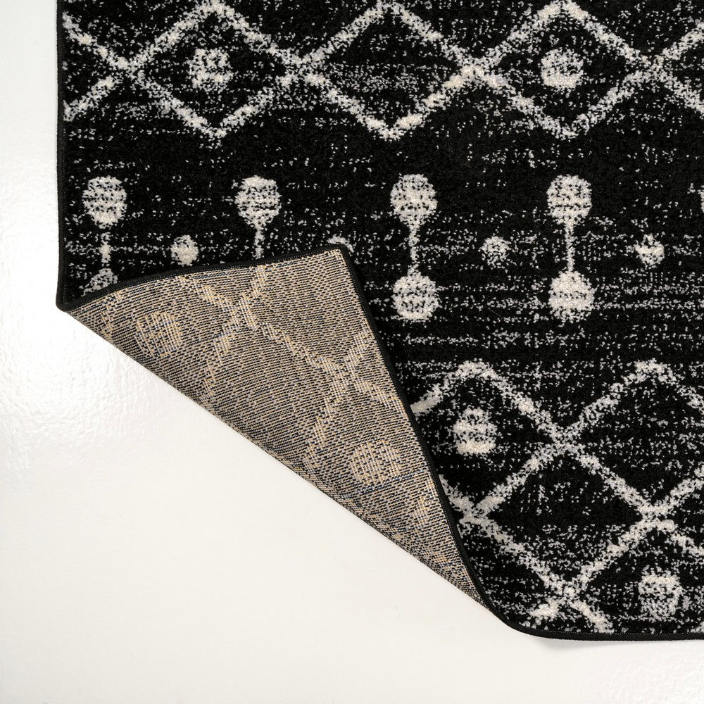 Inspired by vintage Moroccan tribal rugs, our modern version is power-loomed with a short pile. Berber diamond and circle symbols are woven in black on a field of ivory; the mingled threads recall traditional handwoven rugs. Add some Bohemian style to your home with this easy-care rug.