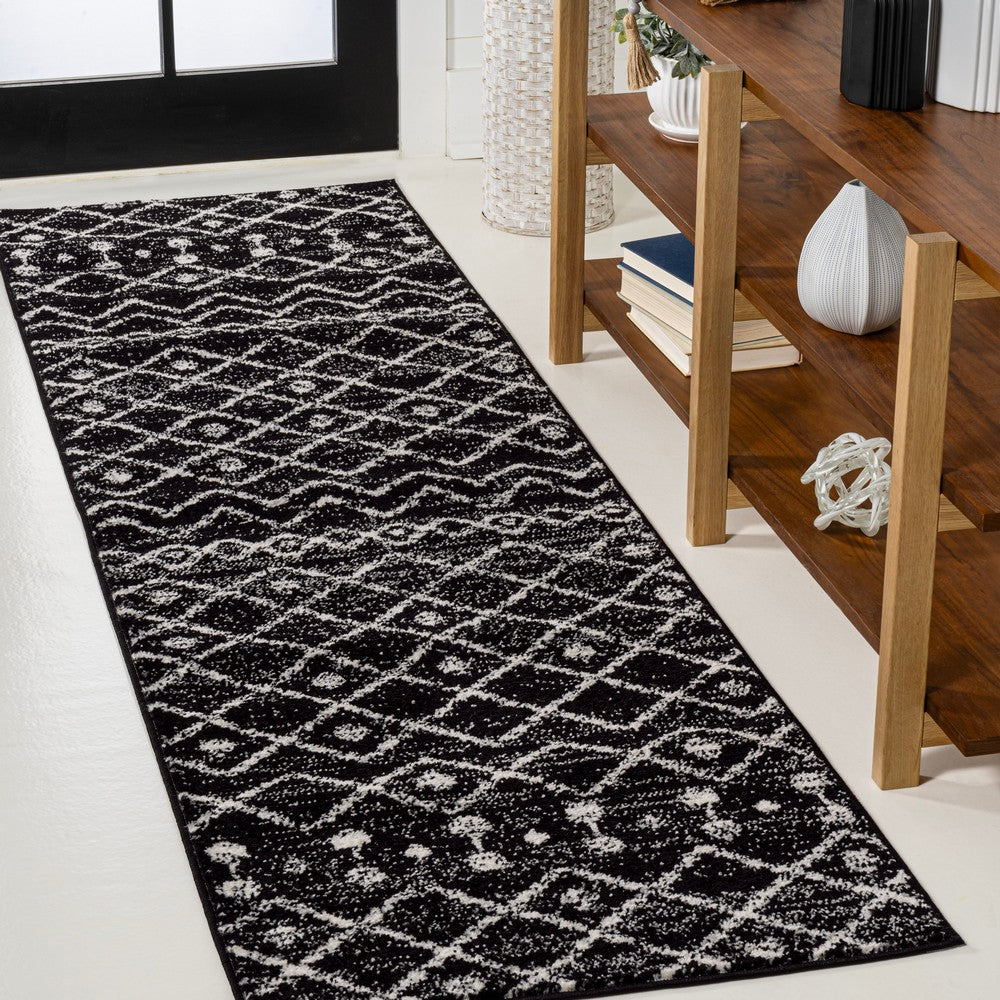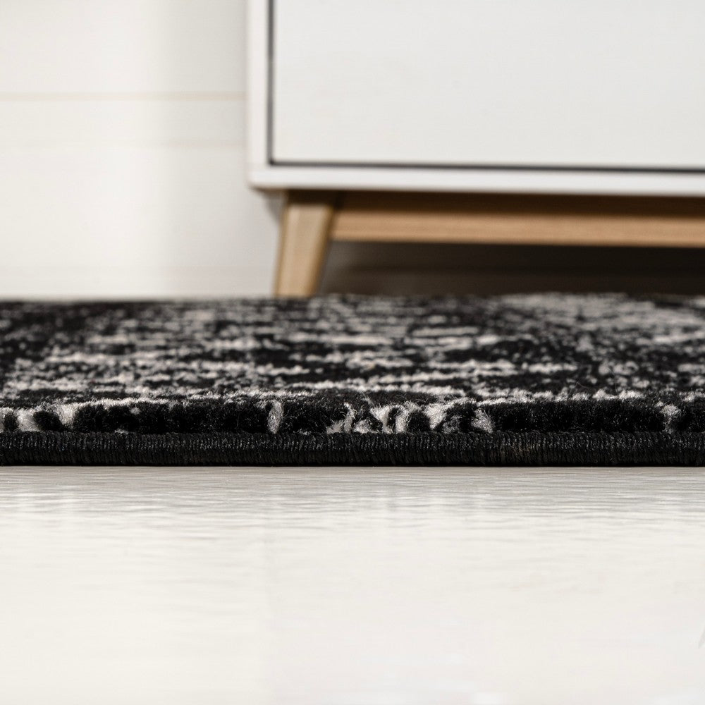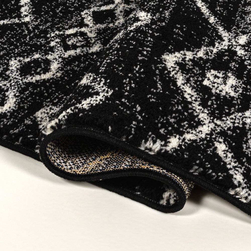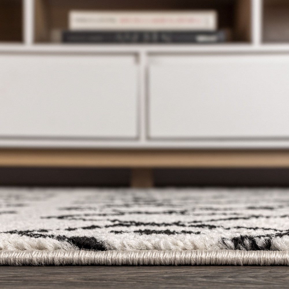- The ivory and black color scheme reproduces the look of neutral, mid-century tribal rugs