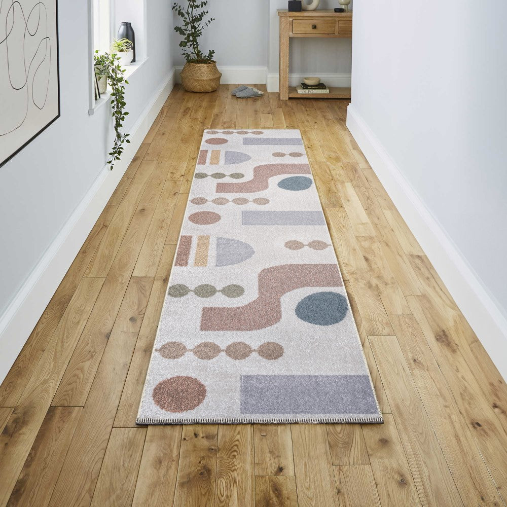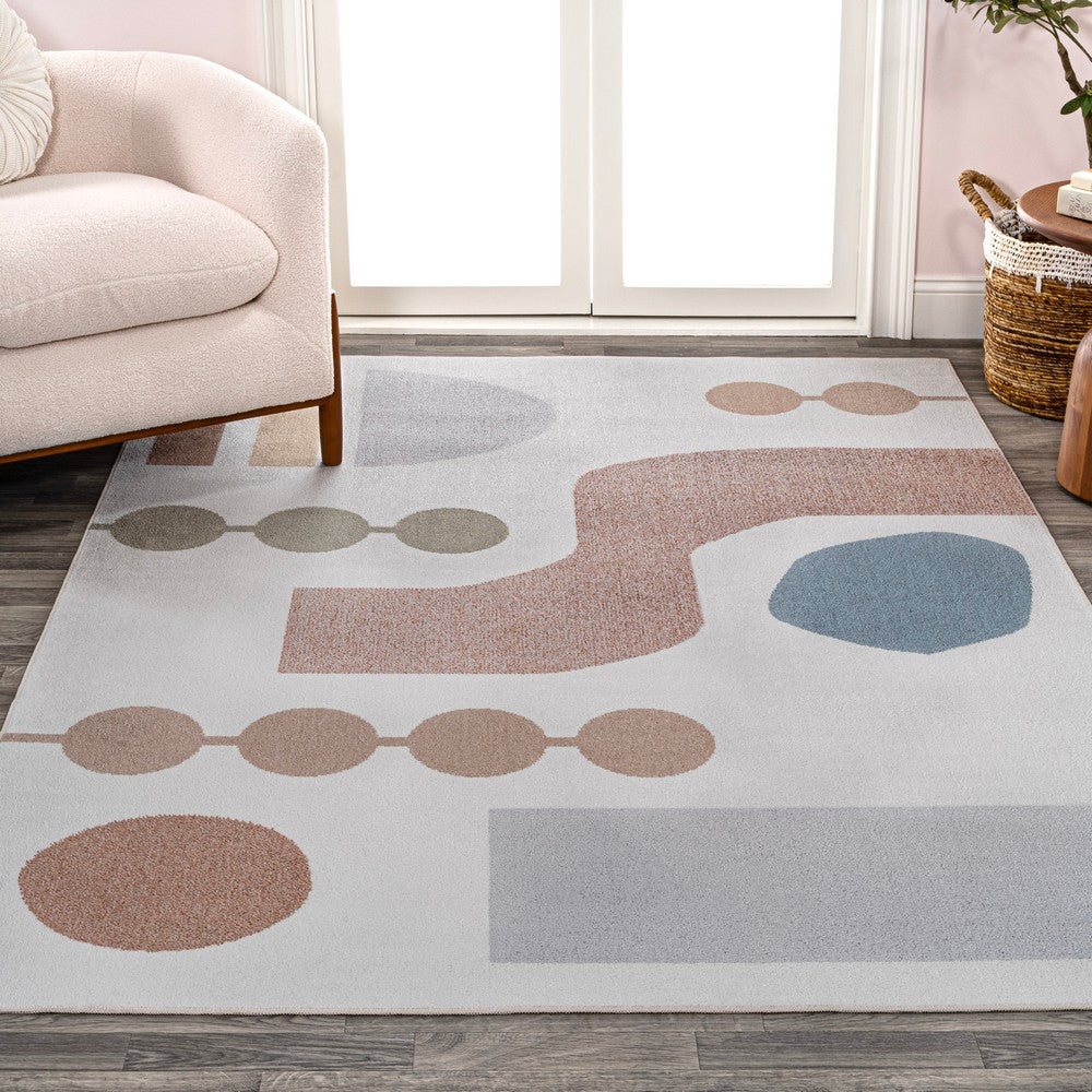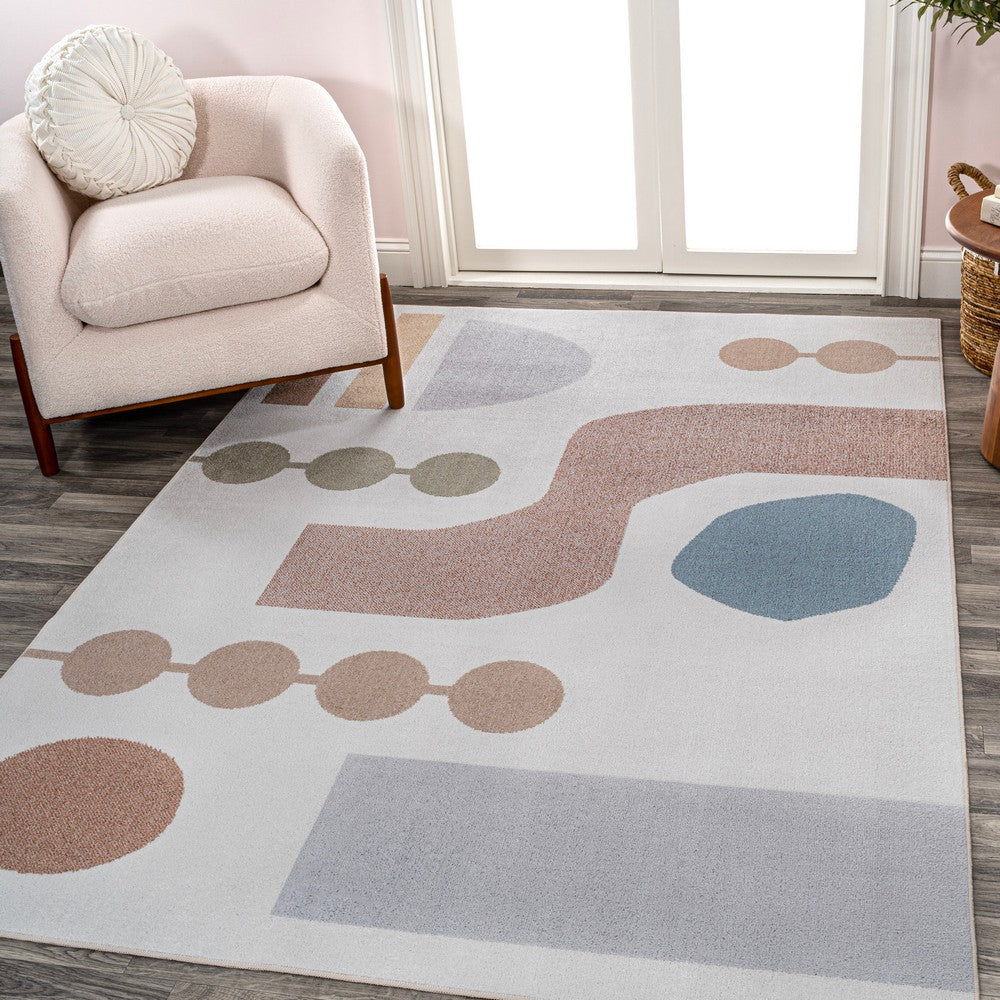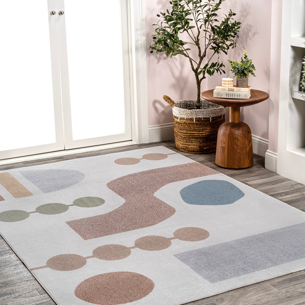 This kid-friendly, washable rug features a modern color palette and abstract shapes. With its contemporary pattern, our rug is ideal for any kids room, family room, or playroom. The pet-friendly synthetic fibers are easy to clean, making this rug the perfect choice for busy families.