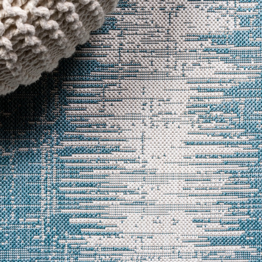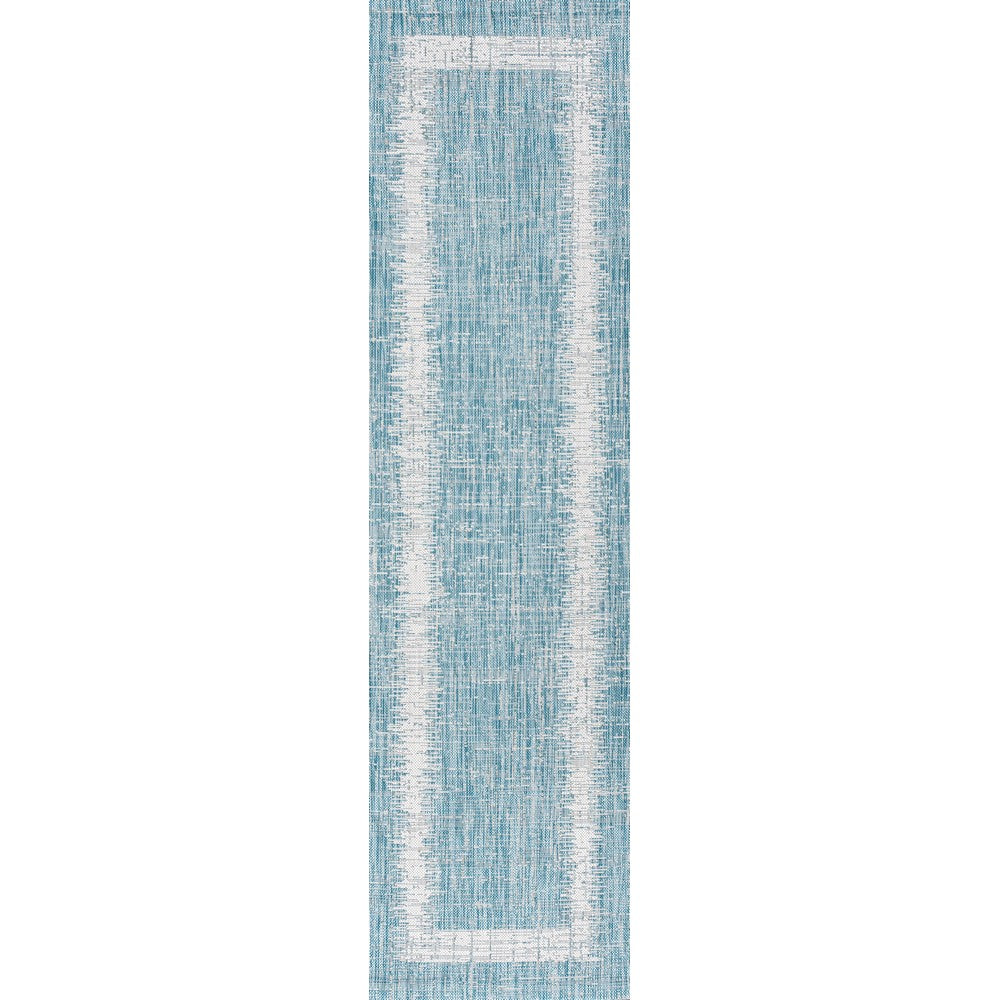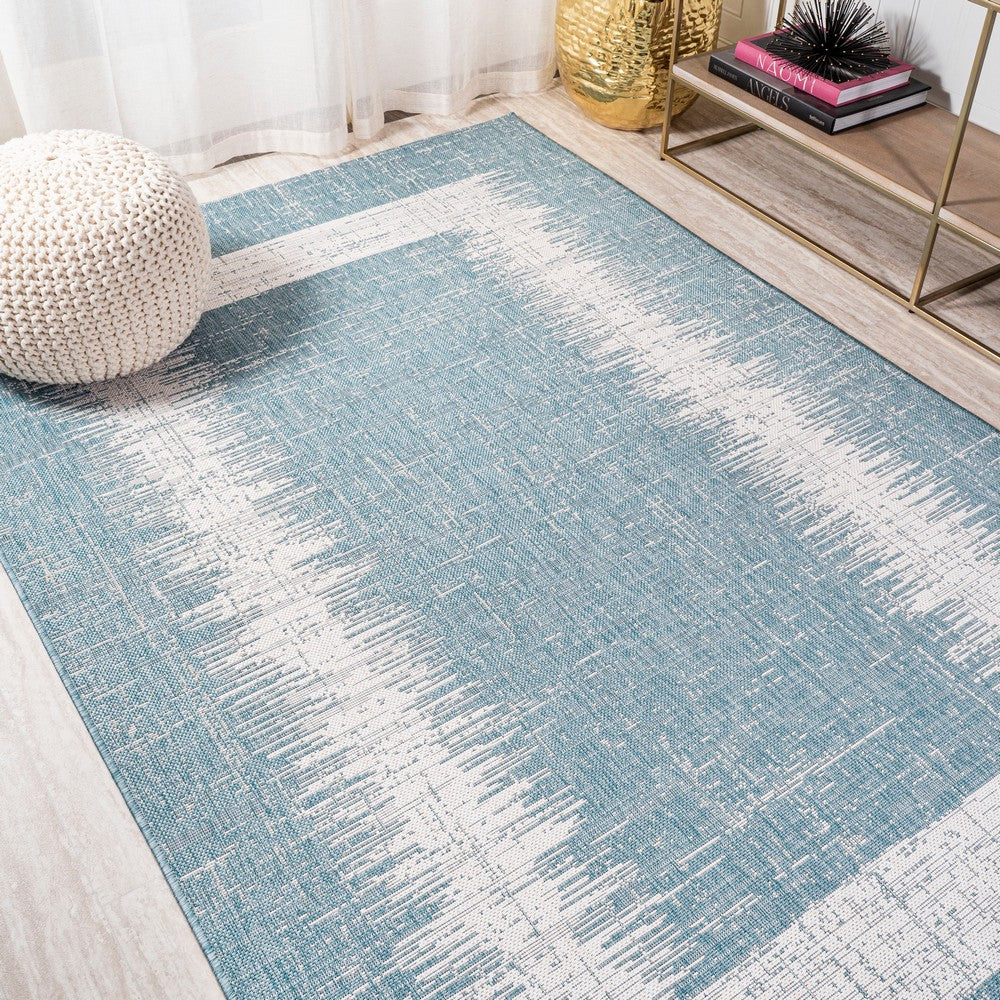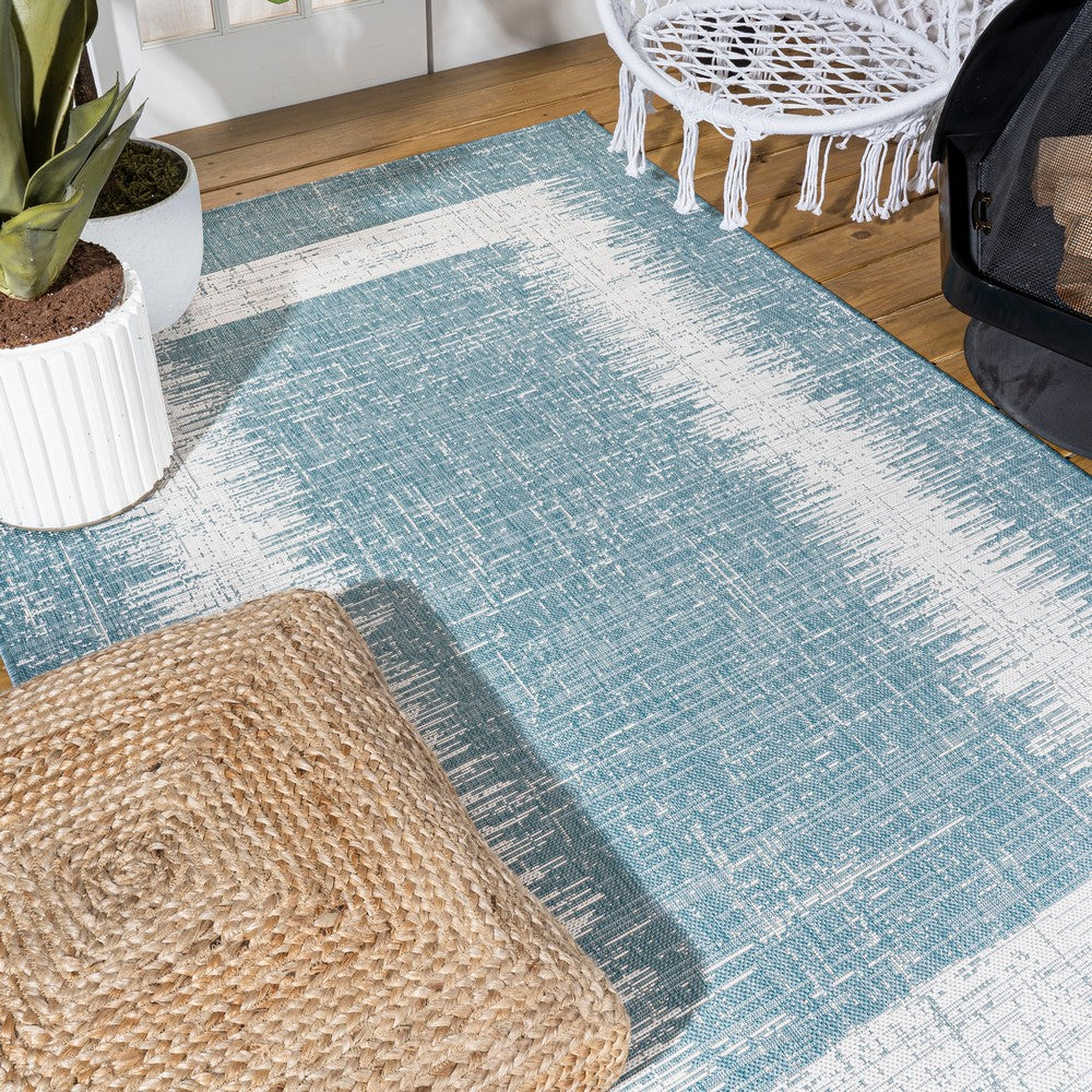 A simple ivory border is woven with a strie' effect on this seafoam aqua geometric rug. This versatile rug's minimalist look is perfect for a coastal cottage or modern outdoor patio. The solid, plain design is a family-friendly solution for a Scandinavian style living room, modern bedroom, kitchen hallway, entry or kids bedroom. The pet-friendly and kid-proof flatweave design makes it easy to clean, and perfect for the beach house.