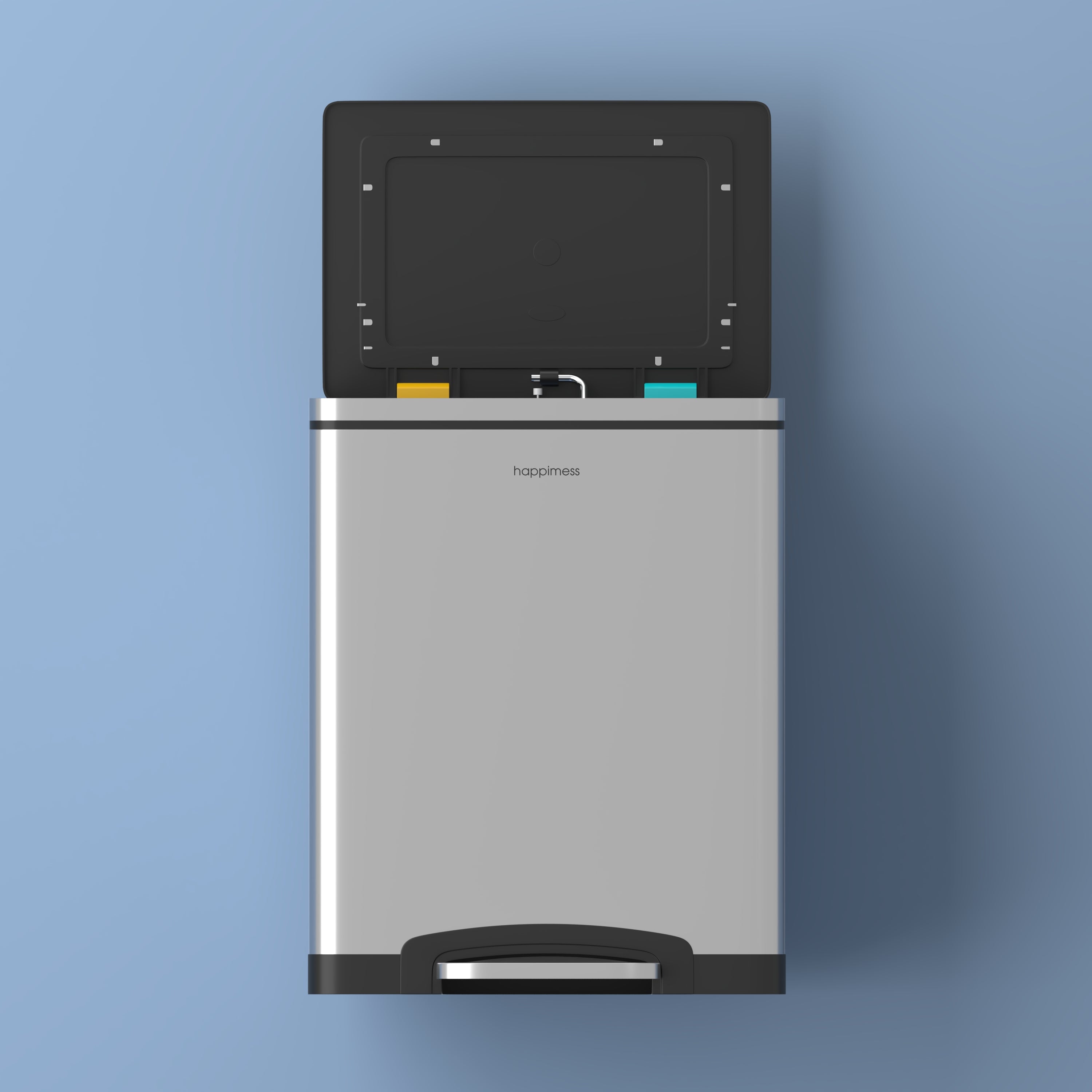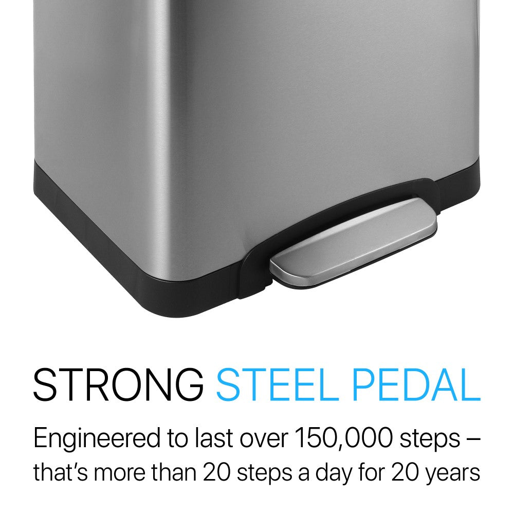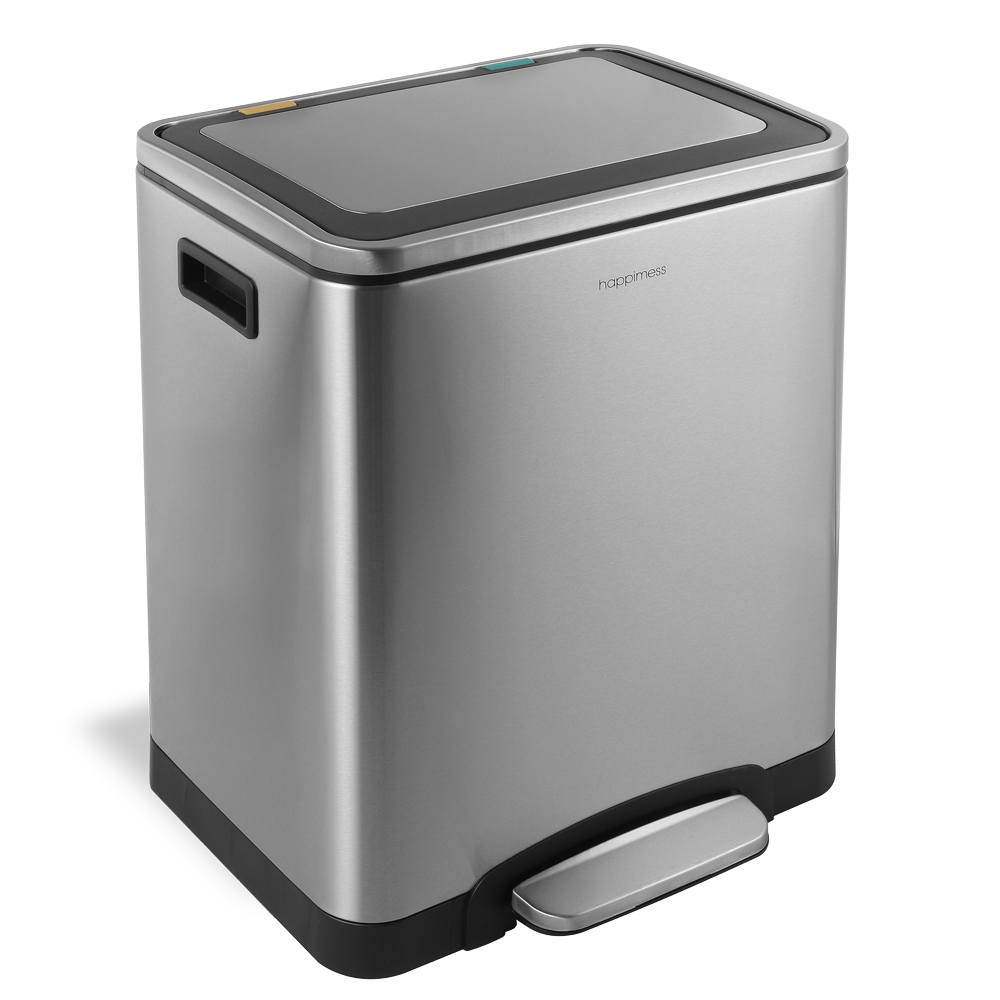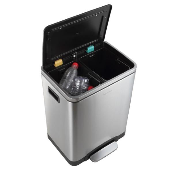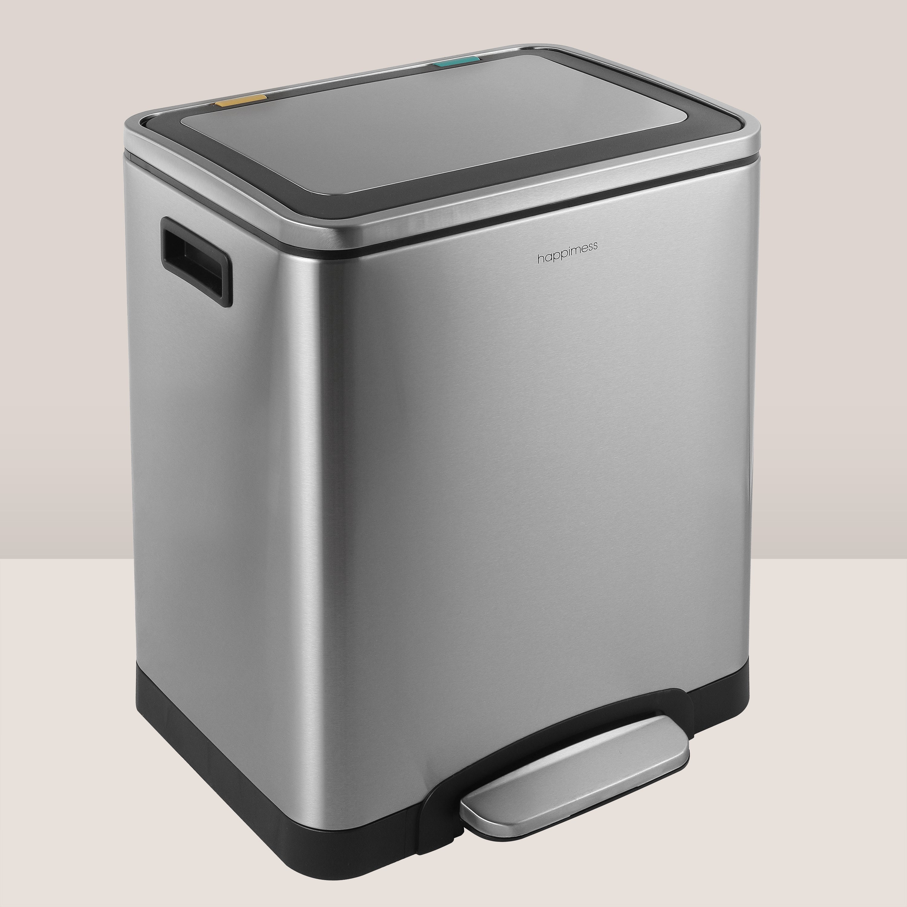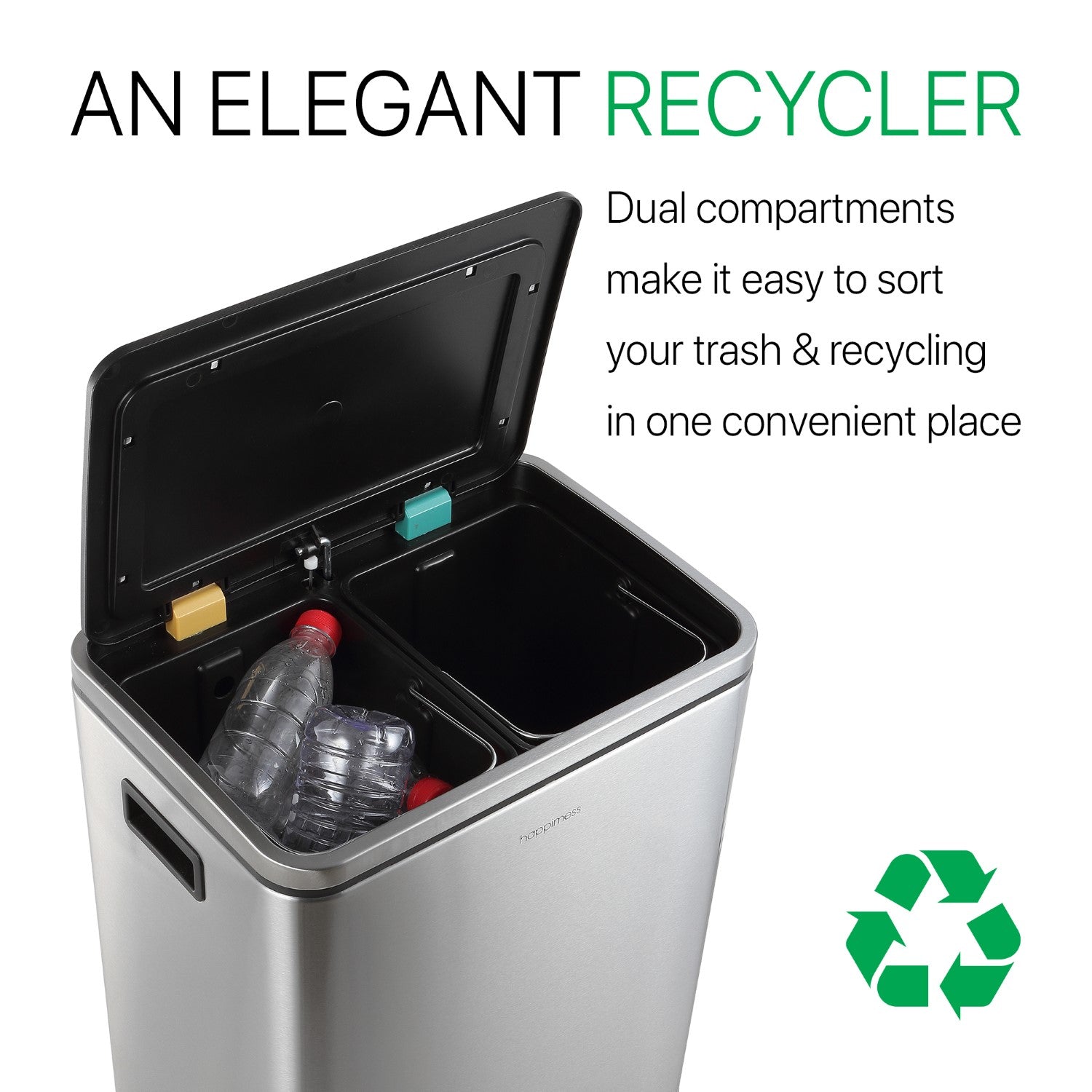 Maximize space, minimize waste with a step can that serves as both trash and recycle bin in one. Its slim design features a durable steel step and soft-closing lid. A double bucket interior houses separate bins for recyclables and for trash. Easy-lift handles on each side, and easily removable liners means each bin is always clean, fuss-free and convenient to empty. Compatible with most kitchen-sized trash bags.