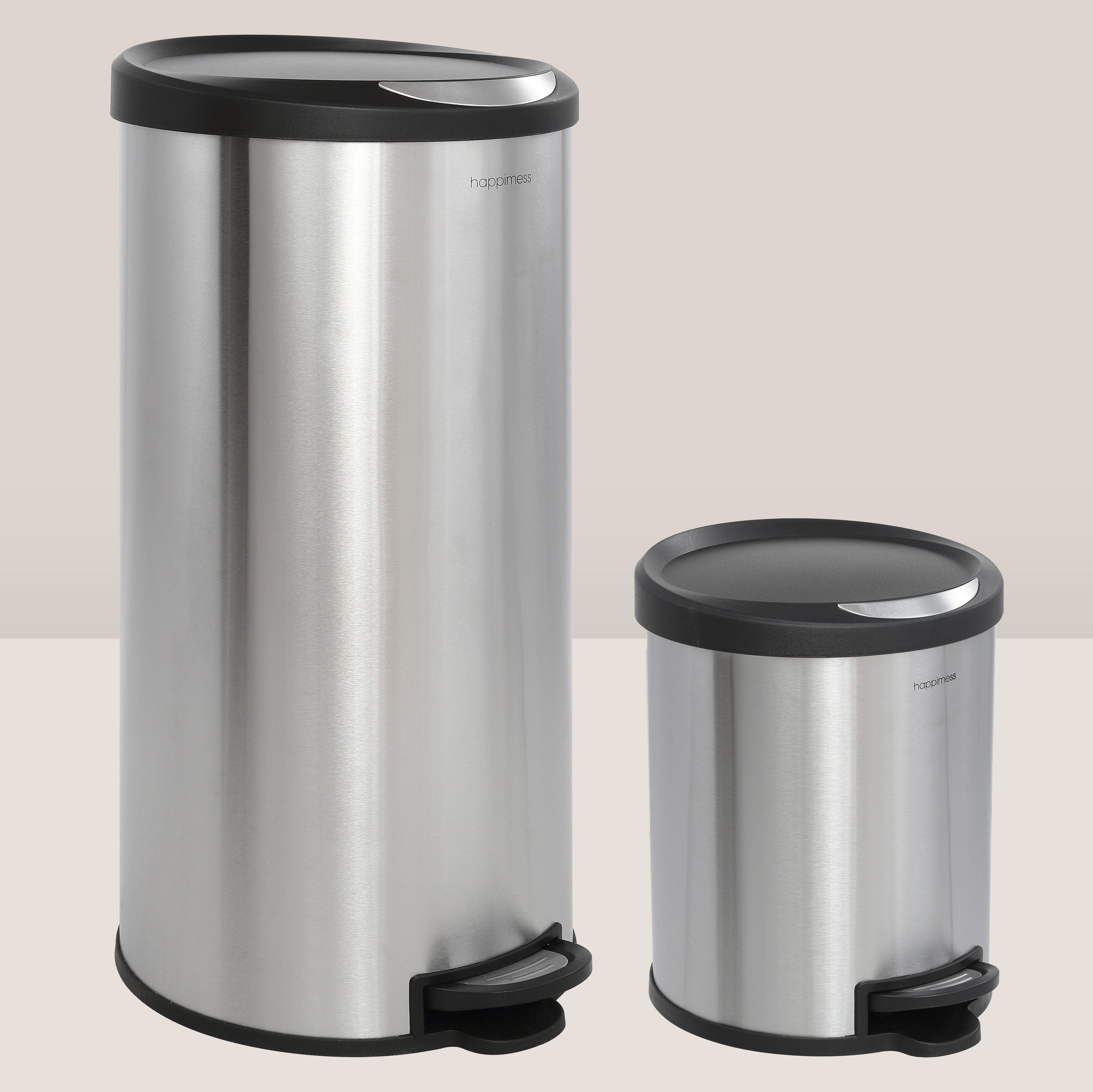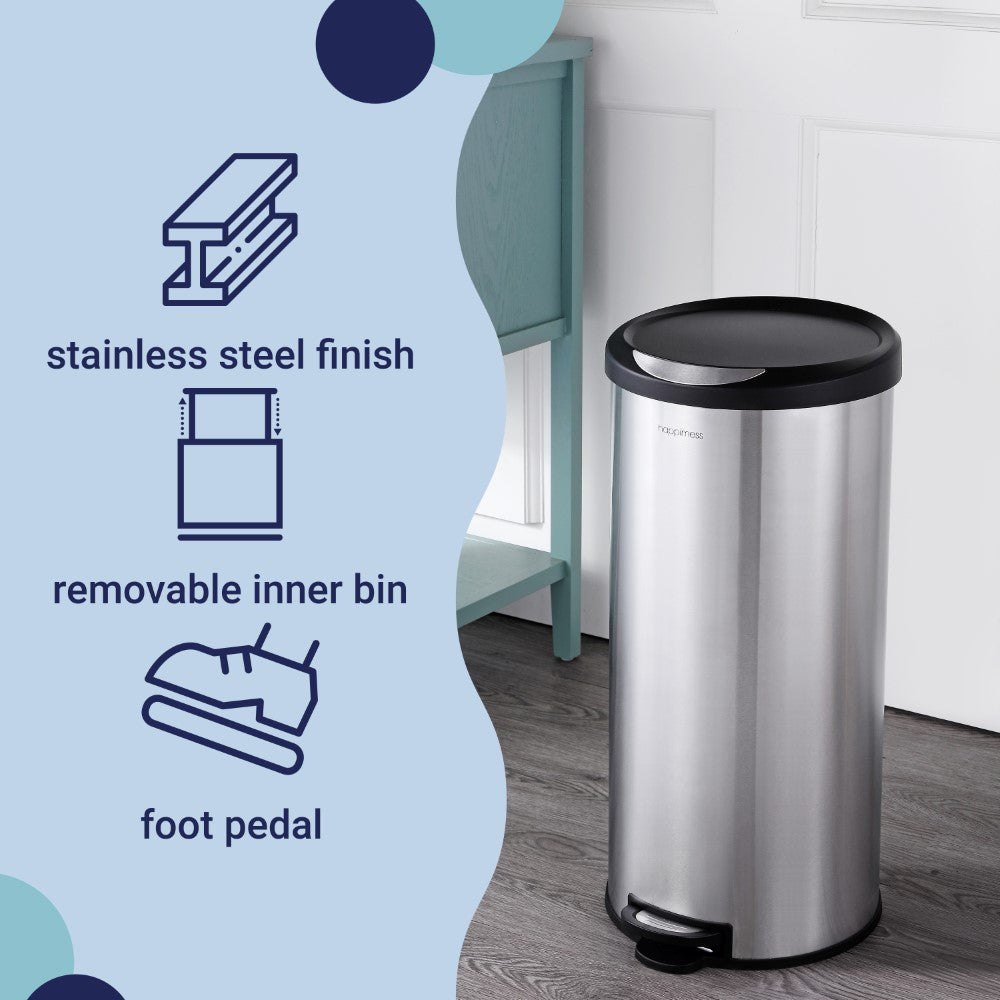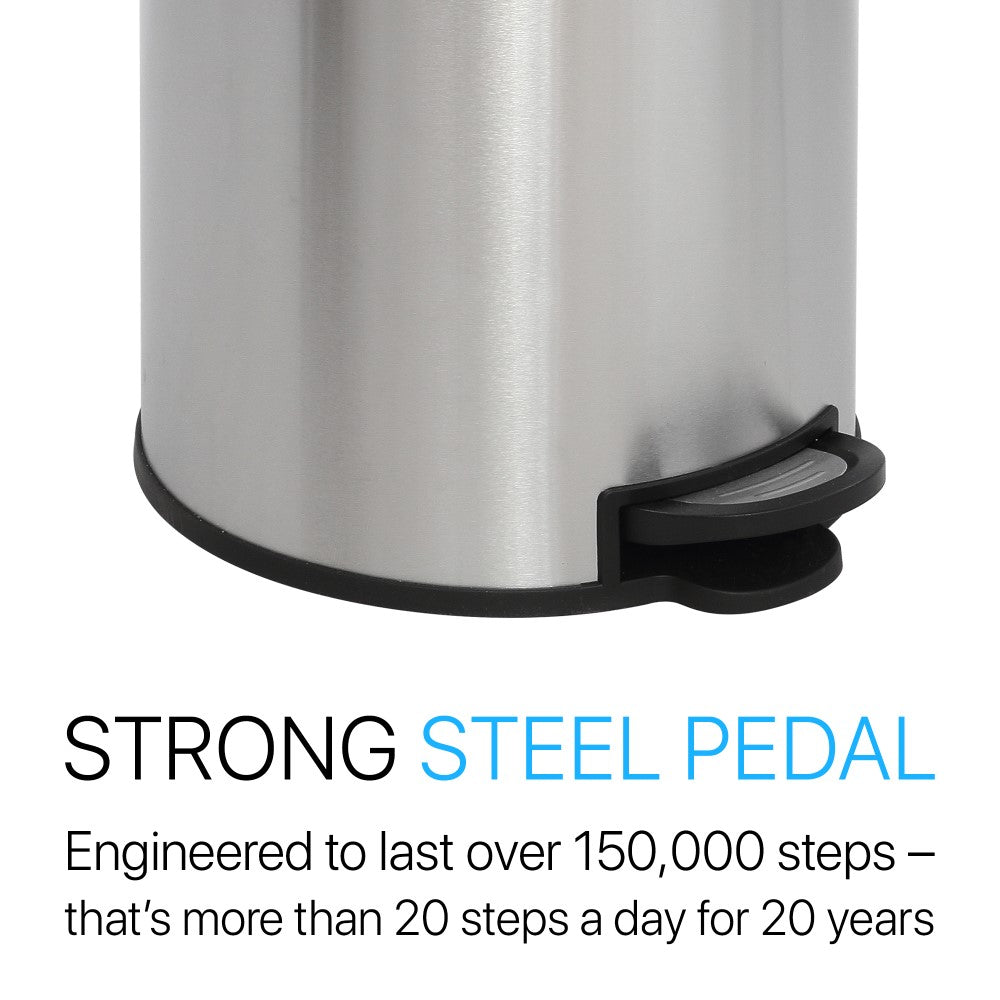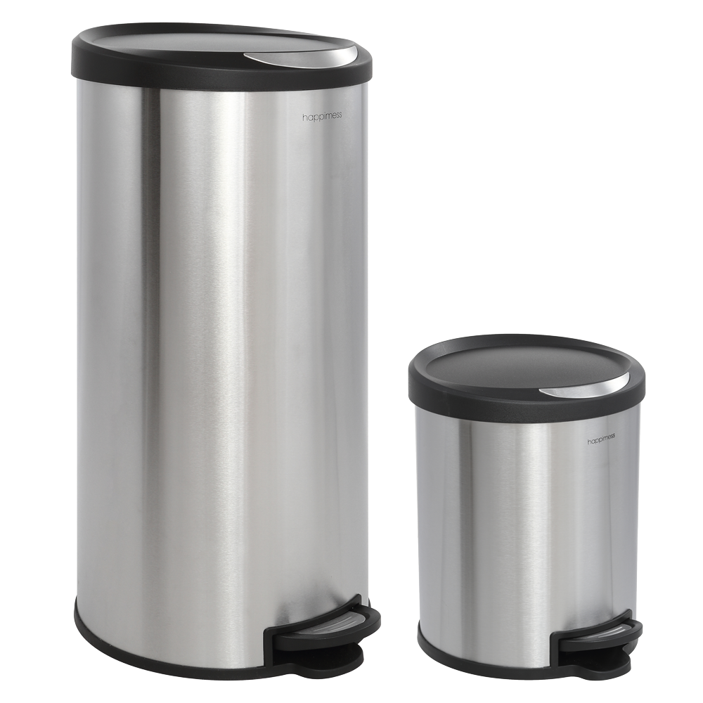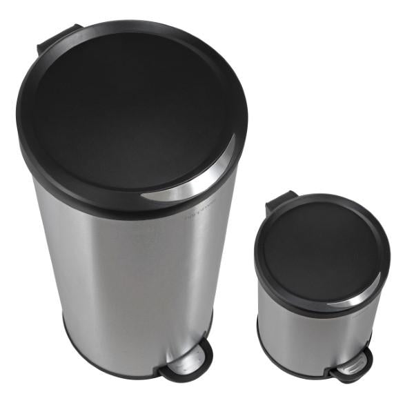 Our round 8-gallon trash cans are an excellent addition to any home or office. Featuring a profile hinge that allows it to sit close to a wall or cabinet, it's finished in brushed stainless, a fingerprint resistant surface. As good as it looks, it's just as functional -- the step-on mechanism allows for a smooth opening and the removable plastic liner makes bag changes a cinch. For a limited time, get a matching, smaller 1.3-gallon step-pedal trash bin FREE with your purchase of this style.