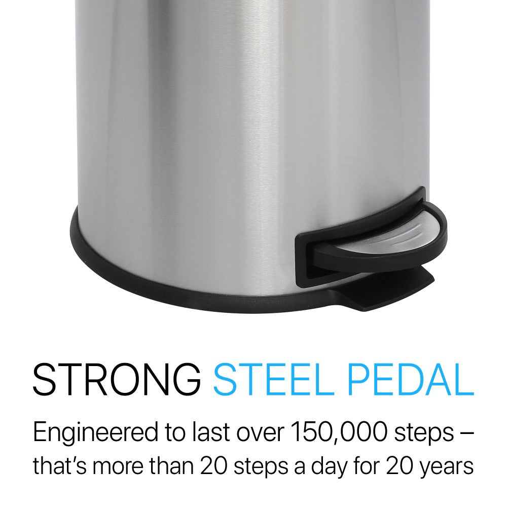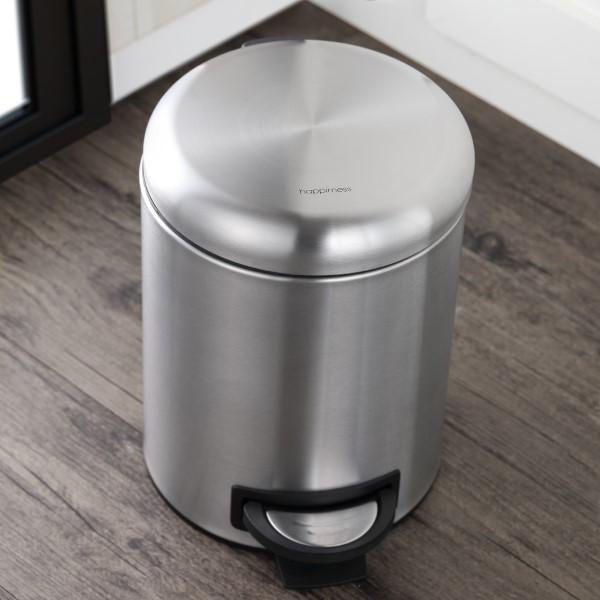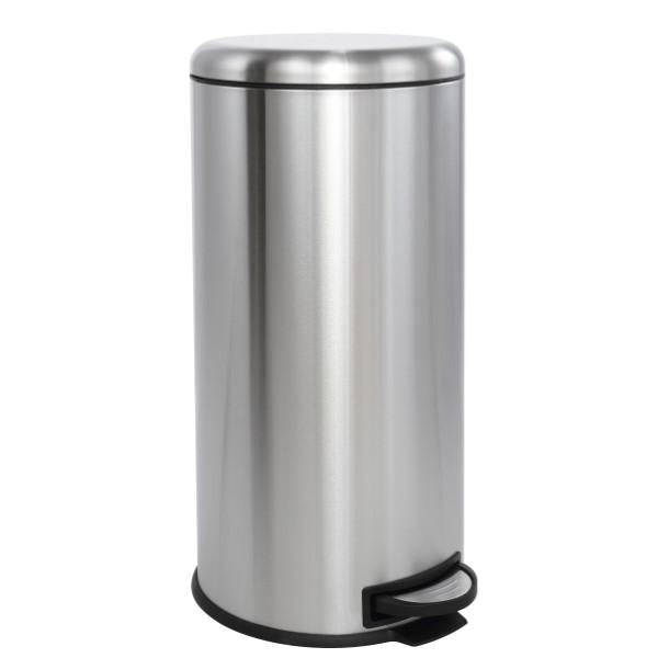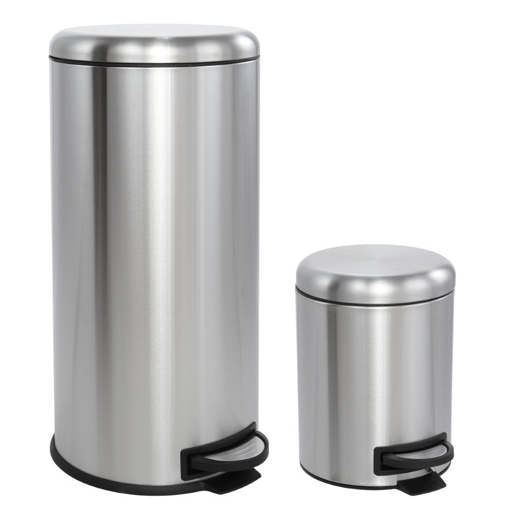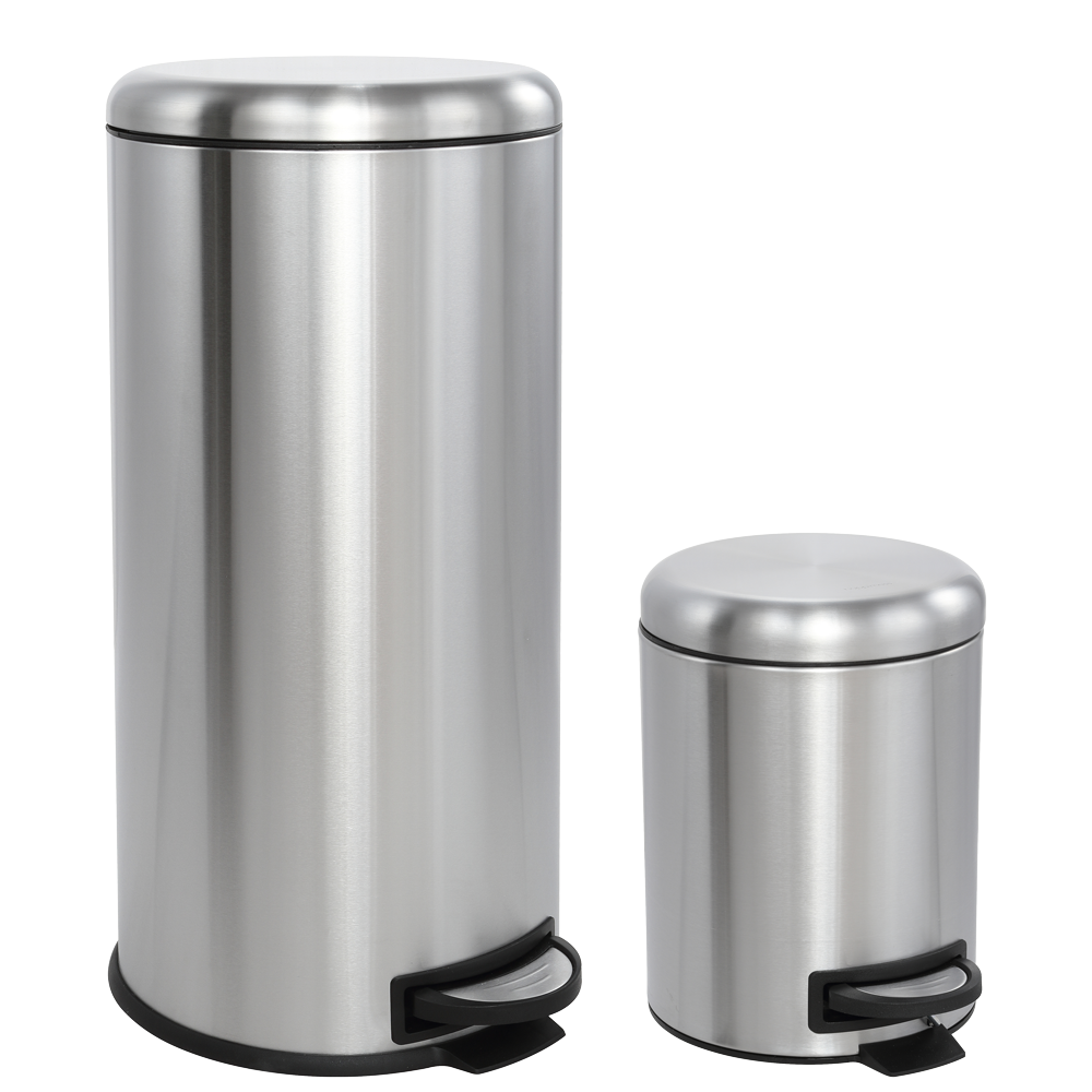 Our round 8-gallon trash cans are an excellent addition to any home or office. Featuring a profile hinge that allows it to sit close to a wall or cabinet, it's finished in brushed stainless, a fingerprint resistant surface. As good as it looks, it's just as functional -- the step-on mechanism allows for a smooth opening and the removable plastic liner makes bag changes a cinch. For a limited time, get a matching, smaller 1.3-gallon step-pedal trash bin FREE with your purchase of this style.