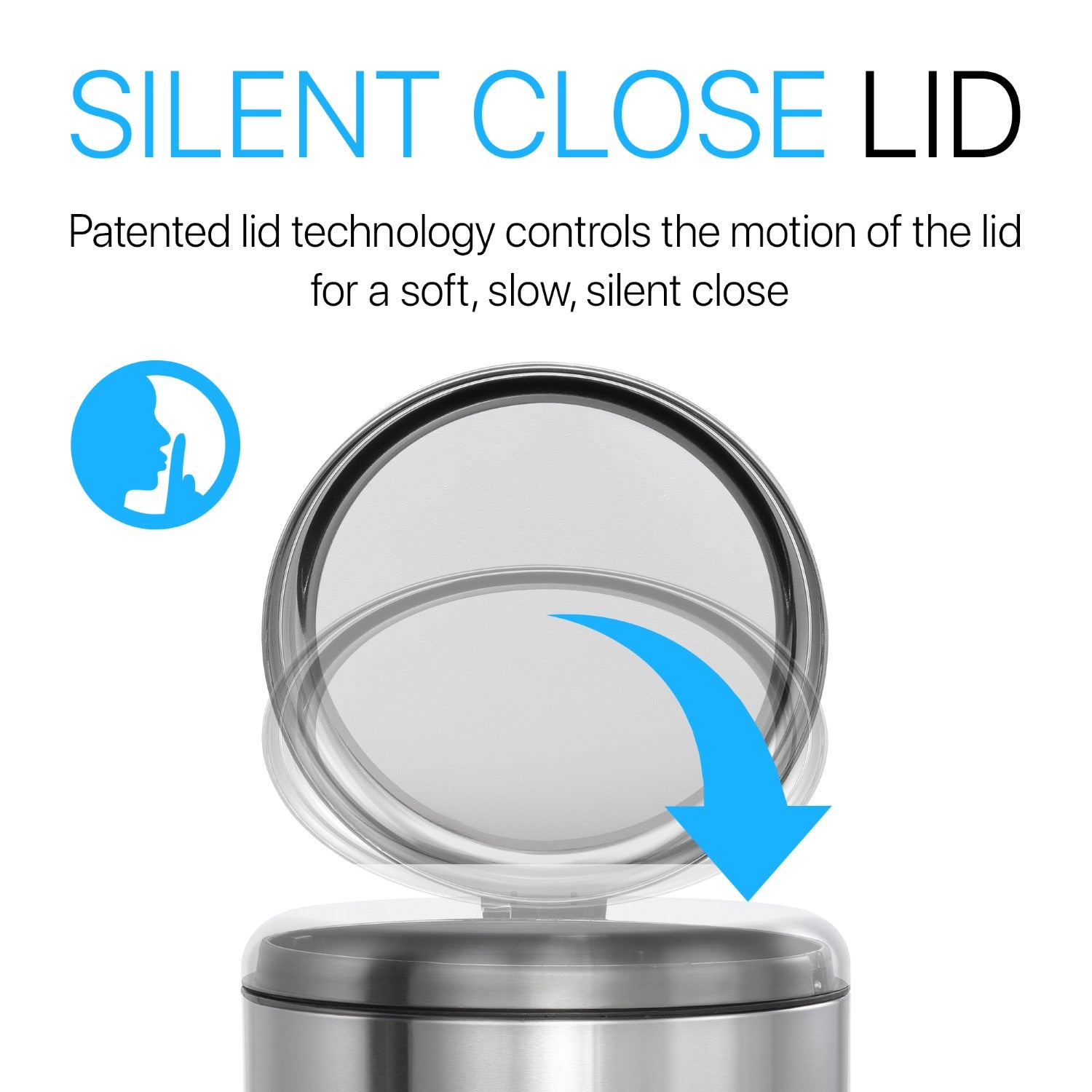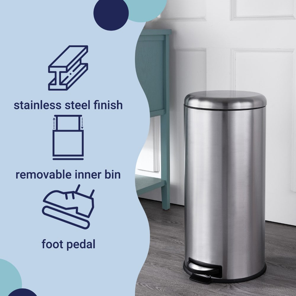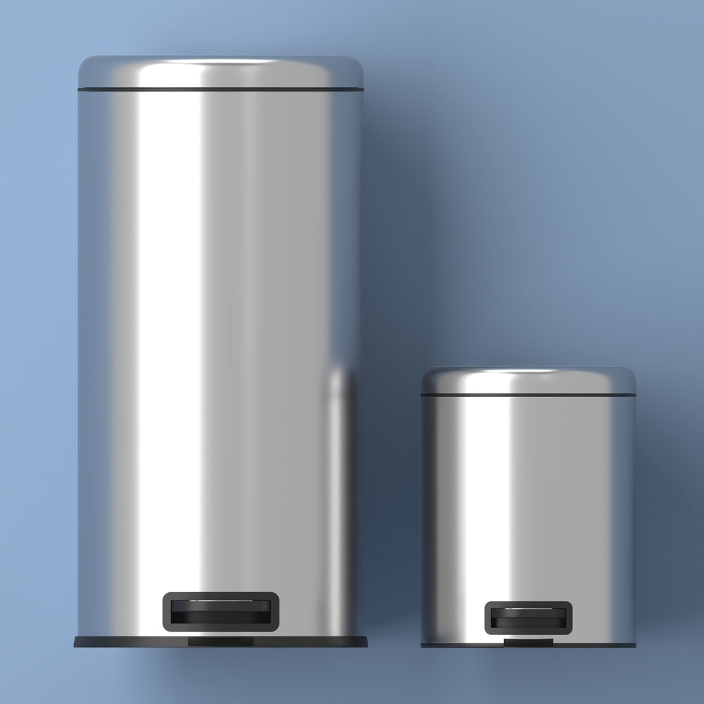 Our round 8-gallon trash cans are an excellent addition to any home or office. Featuring a profile hinge that allows it to sit close to a wall or cabinet, it's finished in brushed stainless, a fingerprint resistant surface. As good as it looks, it's just as functional -- the step-on mechanism allows for a smooth opening and the removable plastic liner makes bag changes a cinch. For a limited time, get a matching, smaller 1.3-gallon step-pedal trash bin FREE with your purchase of this style.