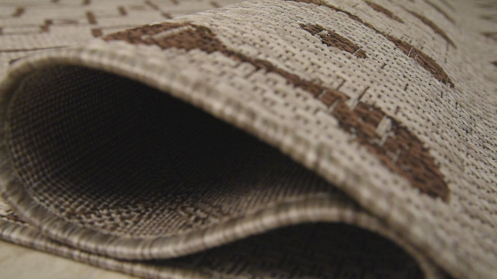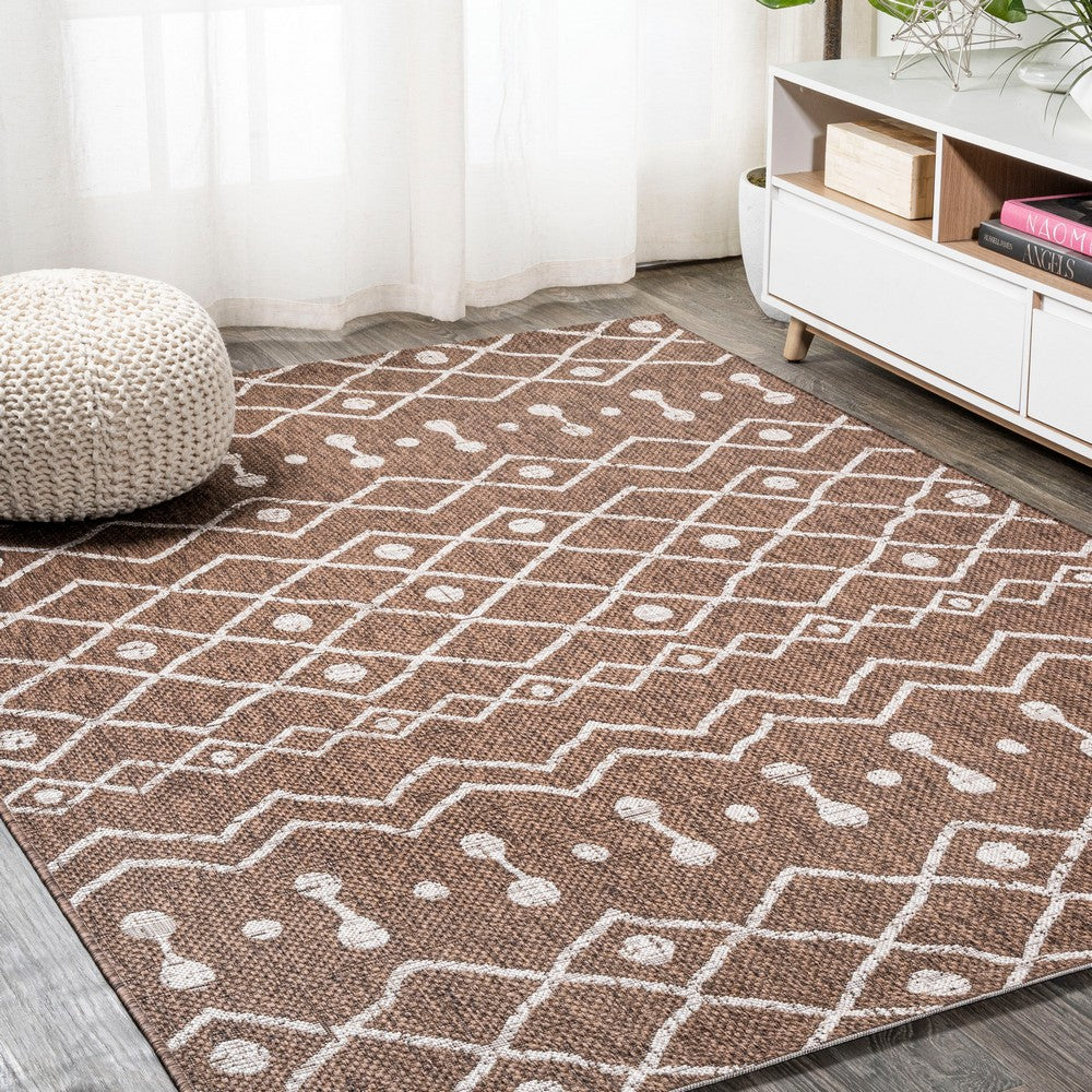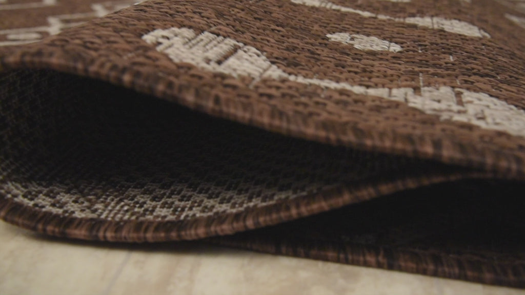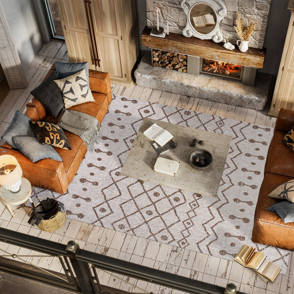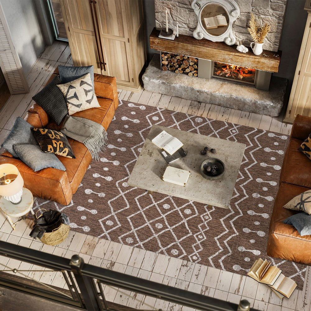 • The rich brown and beige color scheme adds mid-century modern flair to this tribal design
