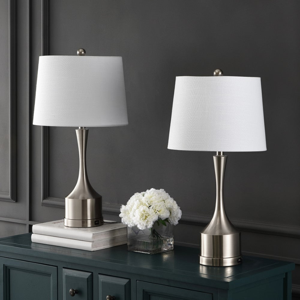 A sleek metal finish and classic drum shade give this pair of lamps a clean, modern look. While perfect for resort and office interiors, these lamps include energy-saving LED bulbs for bright, warm light. A pair of these can add understated style to a bedroom, living room, or entry console.