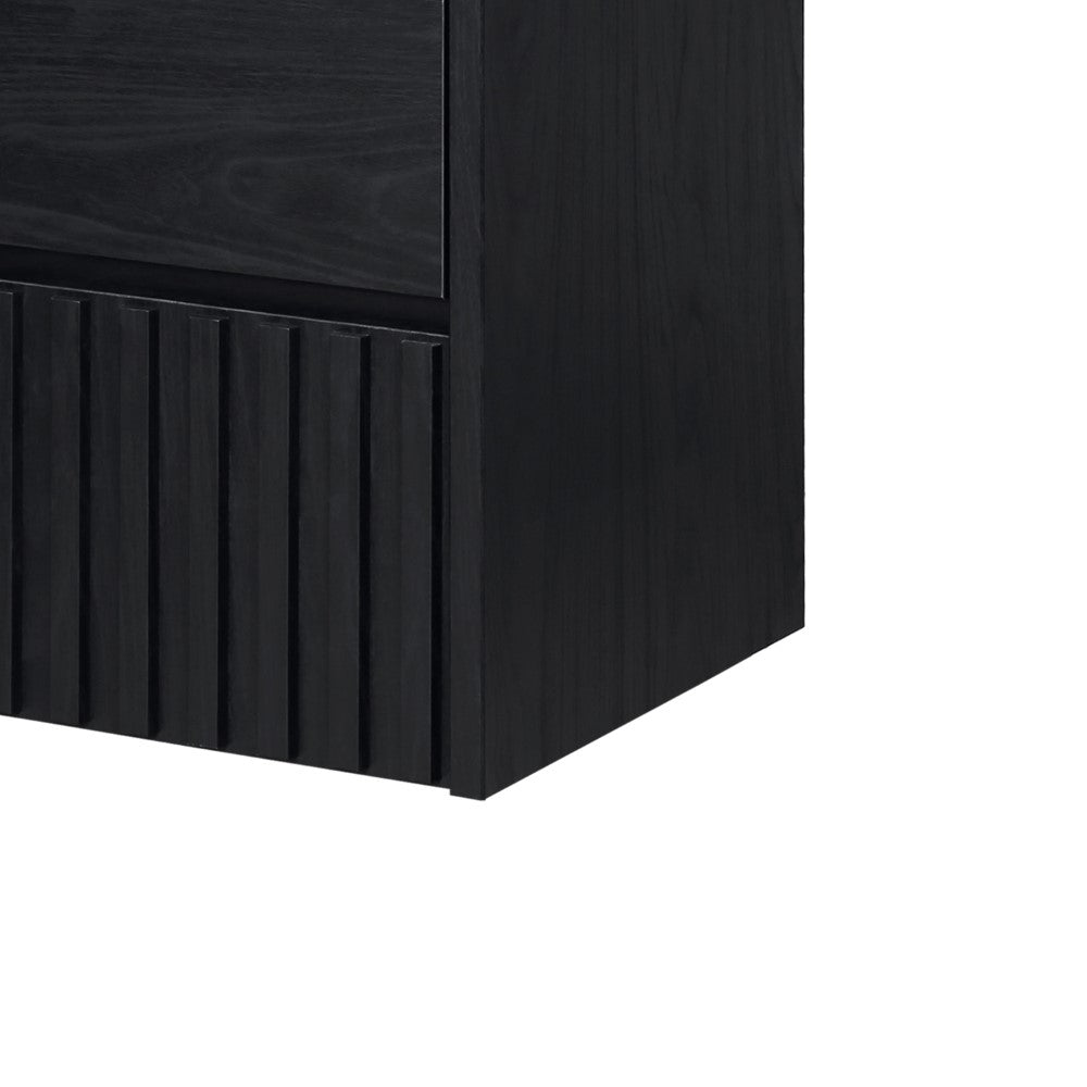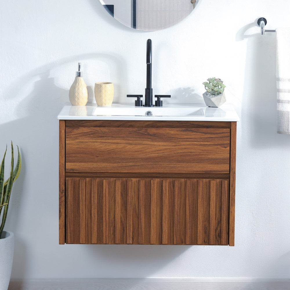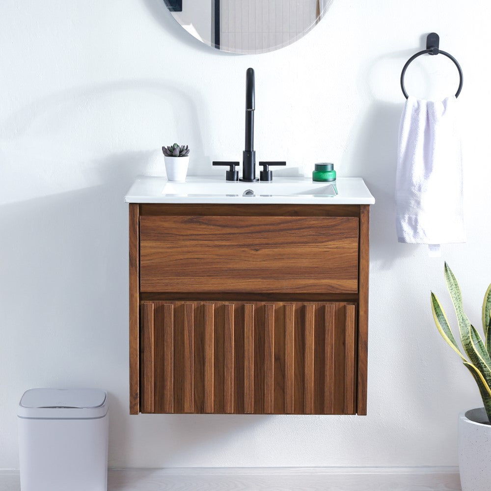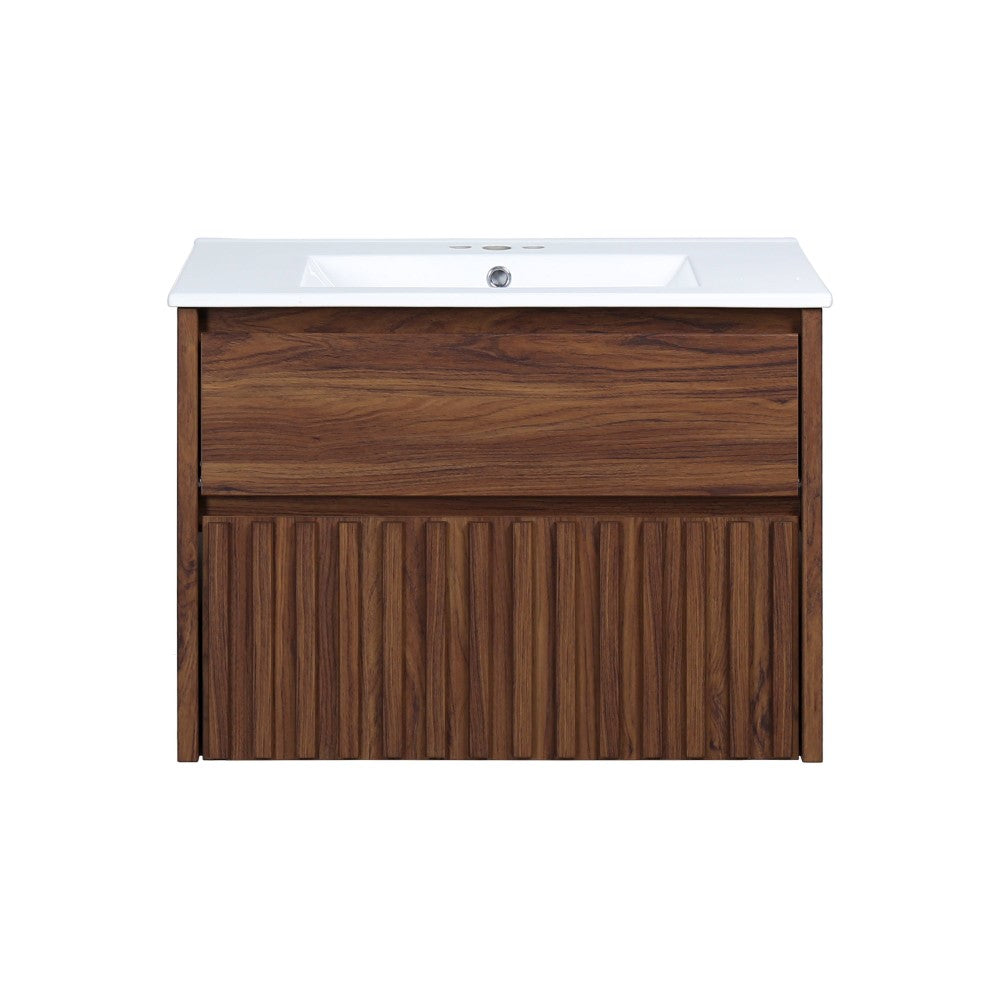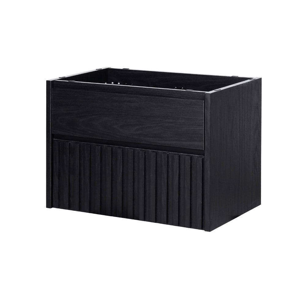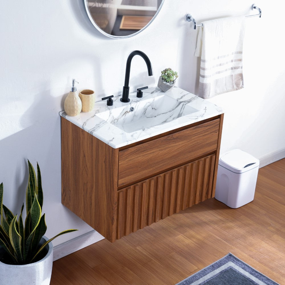 Upgrade any bathroom to a minimalist design with this modern wall-mounted vanity. Made from durable MDF with a wood-grain finish, this space-saving vanity features a chic fluted pattern on the front. Two large drawers offer plenty of storage; sink is not included.