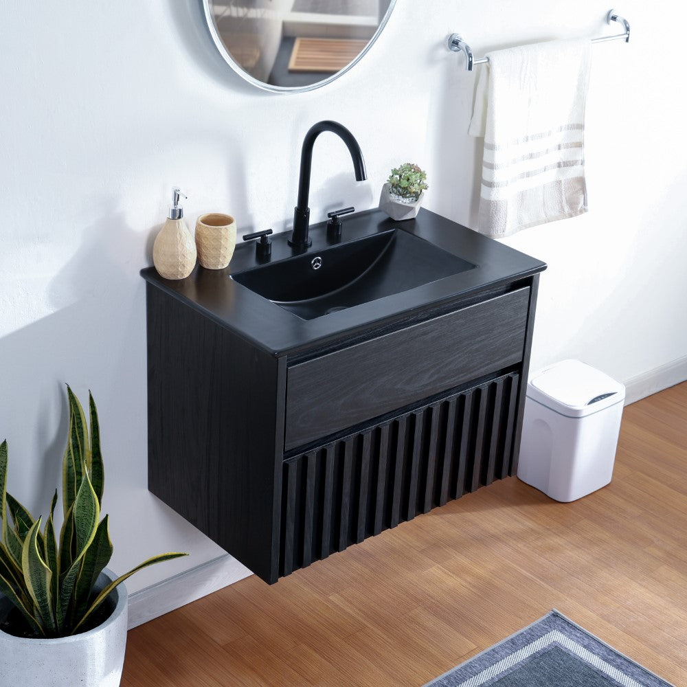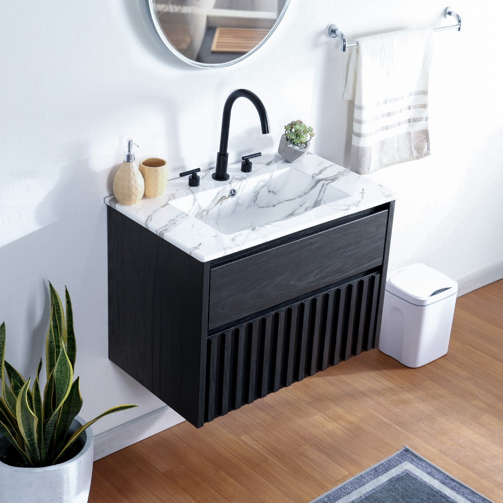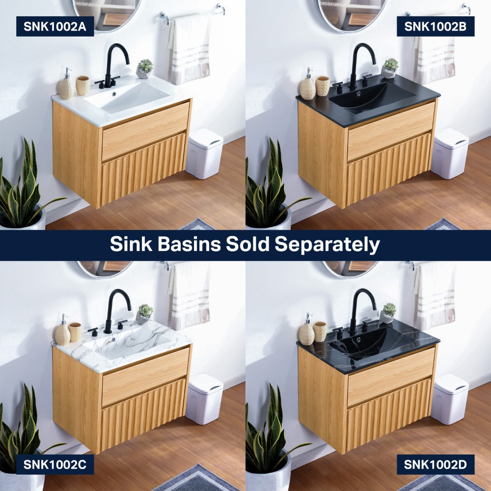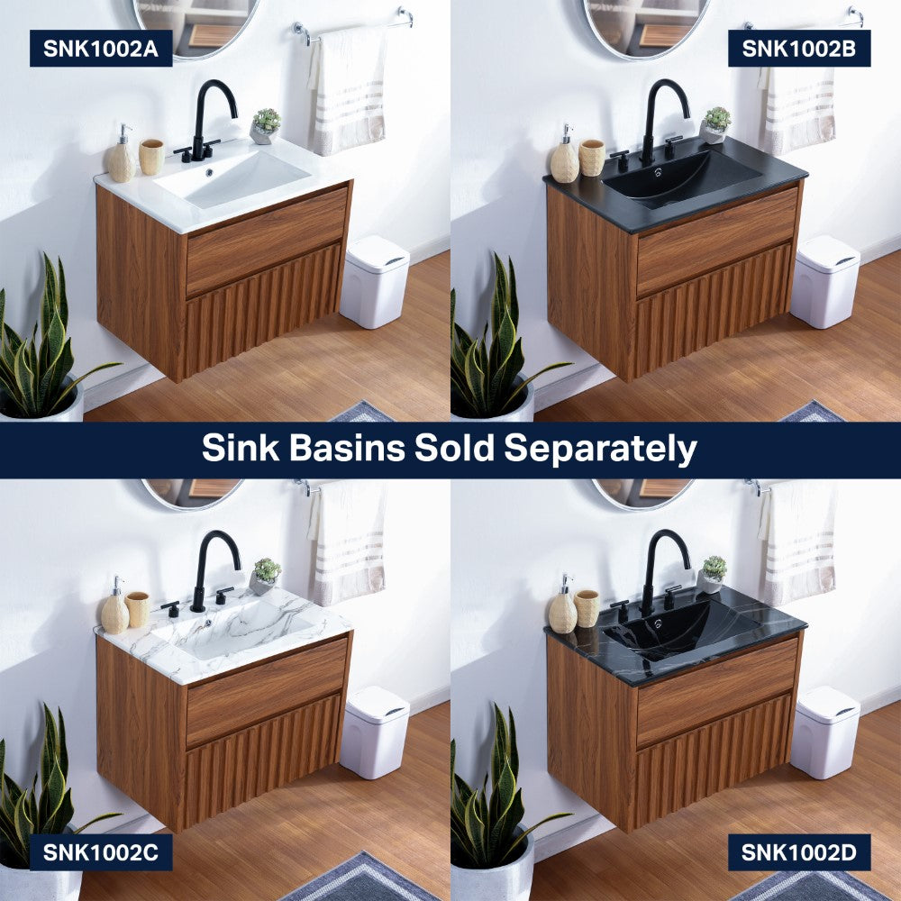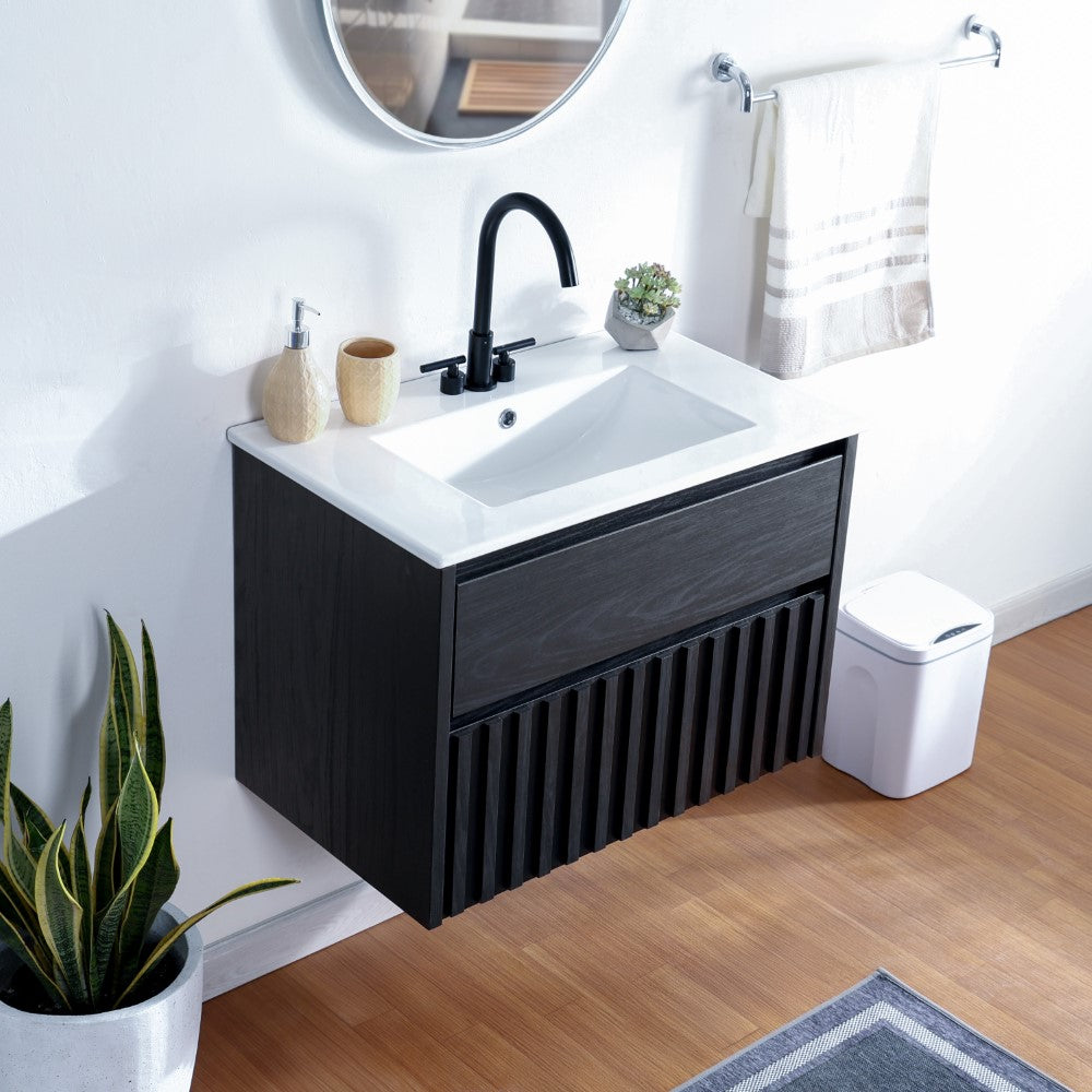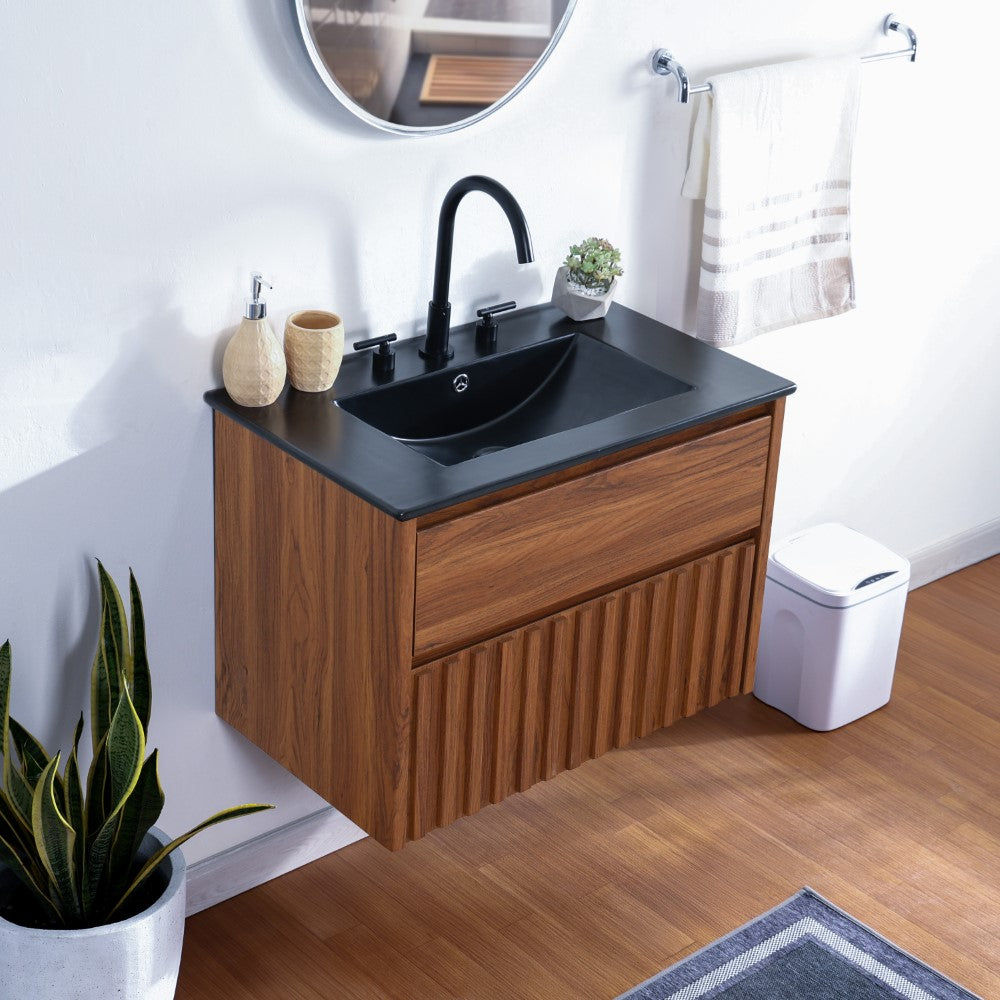 Upgrade any bathroom to a minimalist design with this modern wall-mounted vanity. Made from durable MDF with a wood-grain finish, this space-saving vanity features a chic fluted pattern on the front. Two large drawers offer plenty of storage; sink is not included.