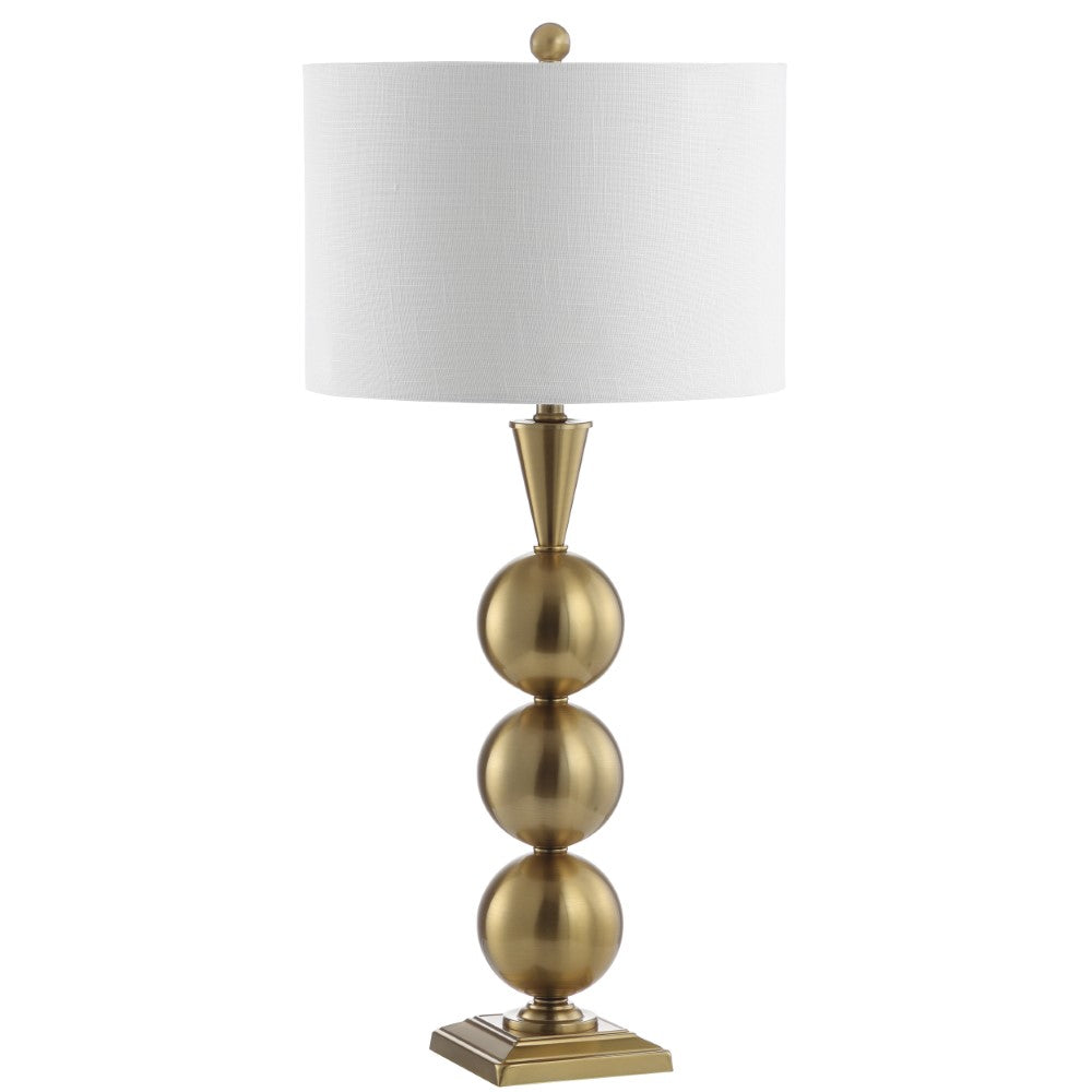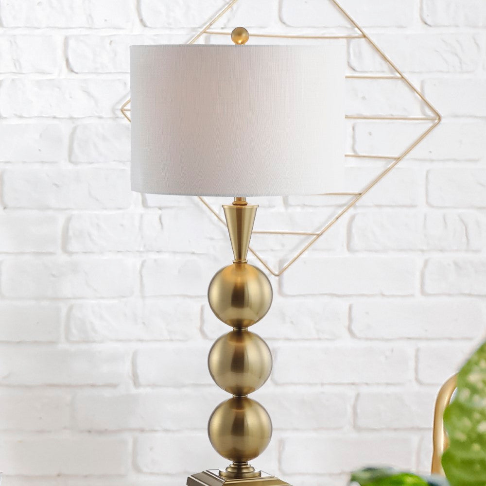 Classic while distinctly modern, this brass lamp base of stacked metal orb topped with a linen drum shade, makes a statement while simultaneously blending in with a variety of home décor styles. Completely monochromatic, the brass not only plates the base, orbs, and electrical components, but the finial as well. Softened by the shade and finished with a silk-wrapped cord, this piece is destined to be an instant classic.