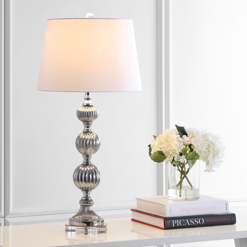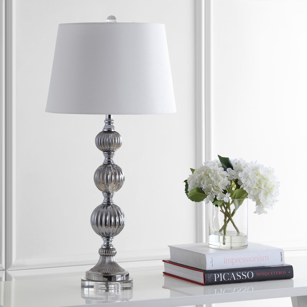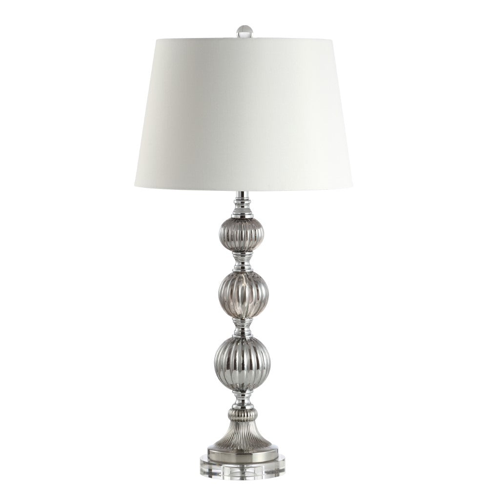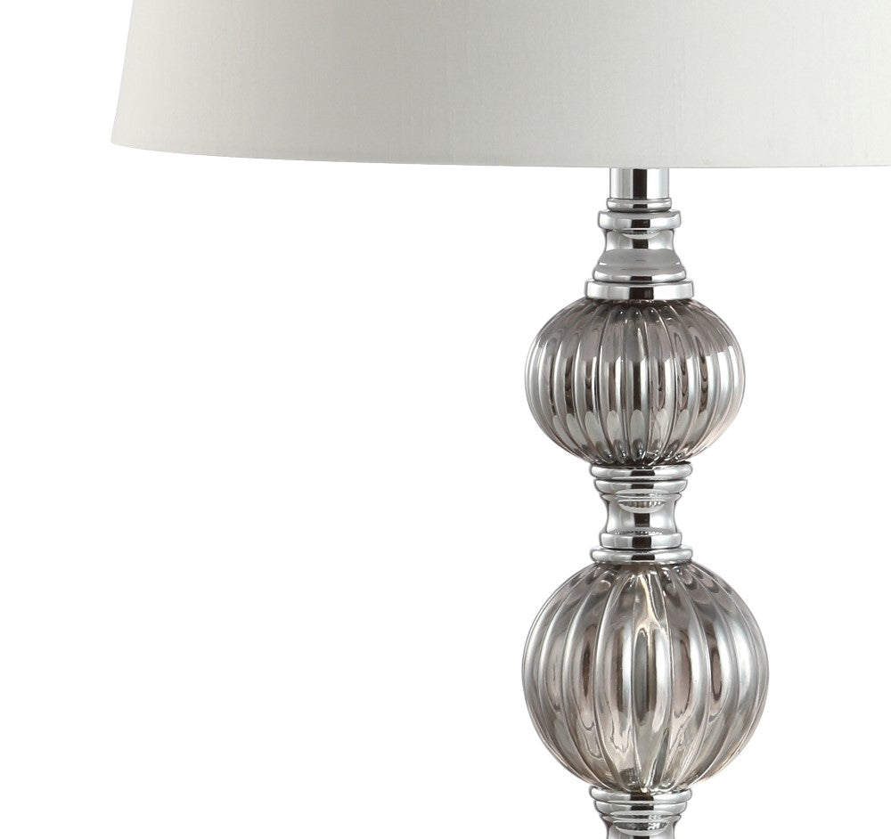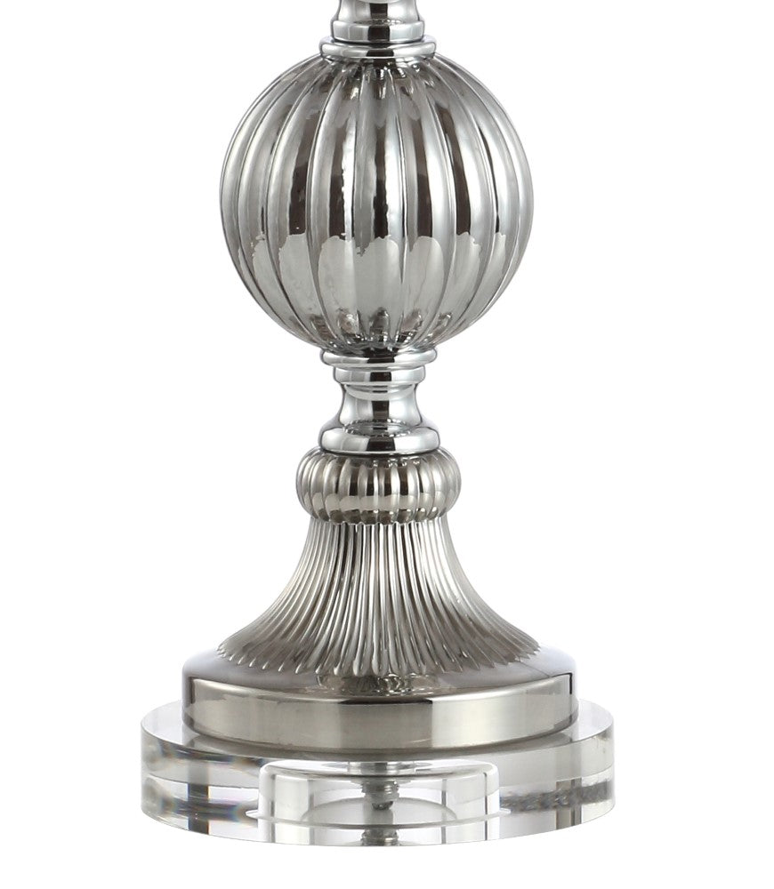 With a playful elegance and chic detail, this stacked sphere table lamp will gracefully light any space. Taken from Art-Deco inspiration, its gracious curves are created by the linear geometry of three fluted spheres. Finished in a smoking gray hue and chrome hardware, the finished look is both elegant and statement-making.
