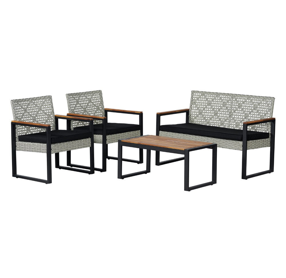 Add an urban touch to your deck or patio with our wood-trimmed 4-piece conversation set. The settee and two lounge chairs have durable synthetic wicker woven onto metal frames, with rustic wood planks on the arms and table top. With comfortable cushions covered in outdoor fabric, this patio set is ideal for a contemporary or farmhouse style home.