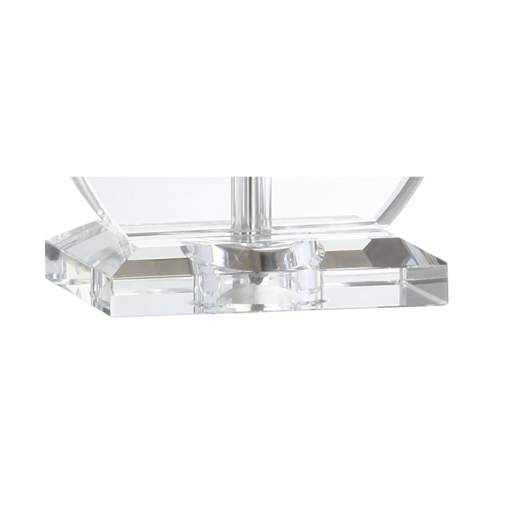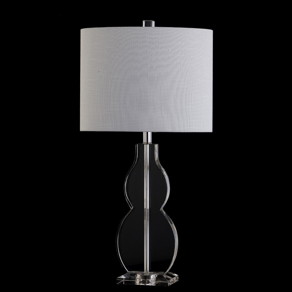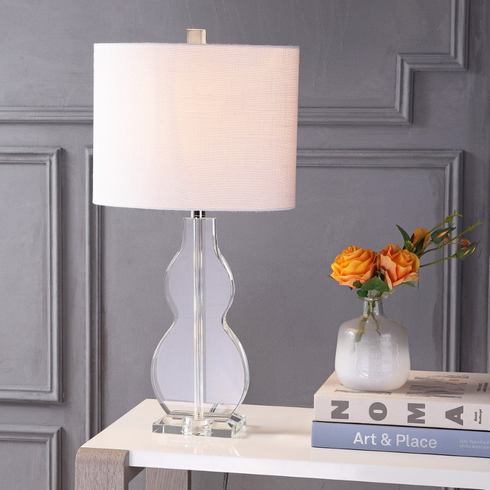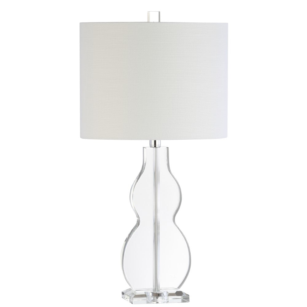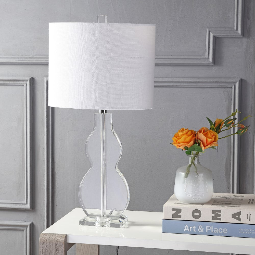The classic midcentury double-gourd gets a modern update in this geometric crystal table lamp. Like a shadow cast from its ceramic cousins, the totally transparent base evokes midcentury style with a modern twist. With crystal nearly 1" thick, it's even more gorgeous illuminated, when light refracts through the crystal base and emanates from behind the cotton drum shade. Not only is this design cutting-edge, but its components are environmentally conscious -- you can use CFL or LED bulbs with its socket, lessening your impact on the earth (and your electricity bill).