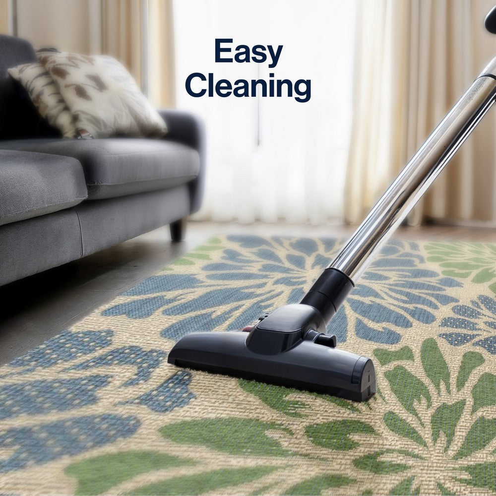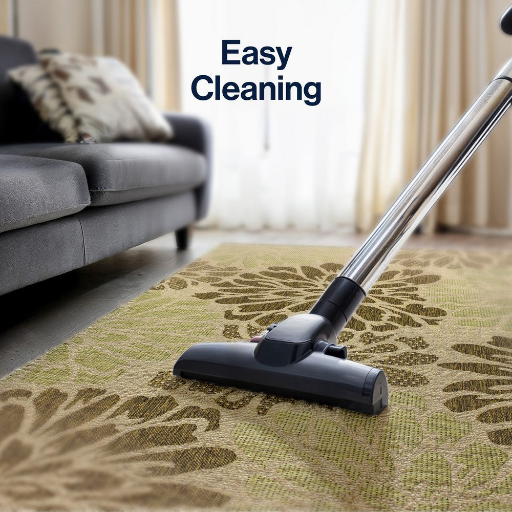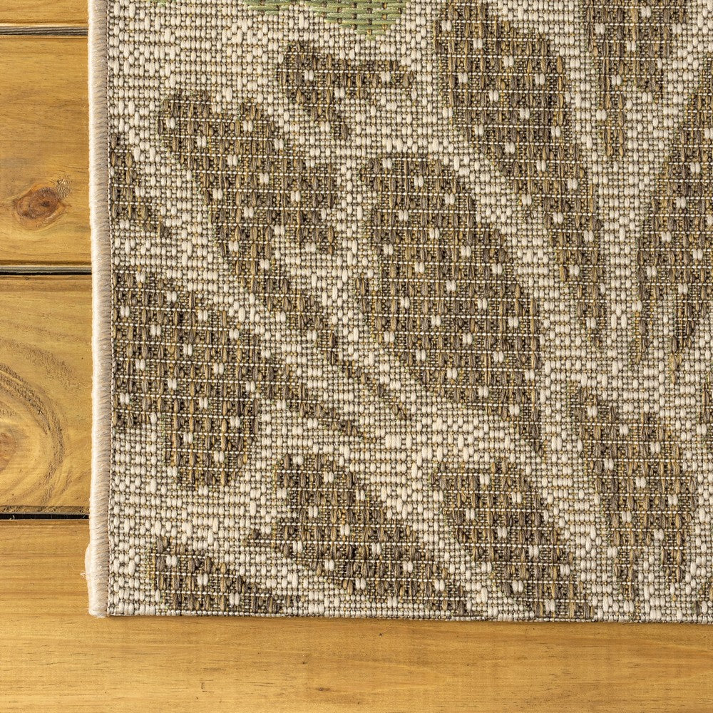 Add some graphic punch to your porch or patio with the bold blooms on our modern floral rug. The large-scale pattern has a geometric effect in a simple palette of sage green, brown and beige. The flatweave design is great for high-traffic spaces indoors too.