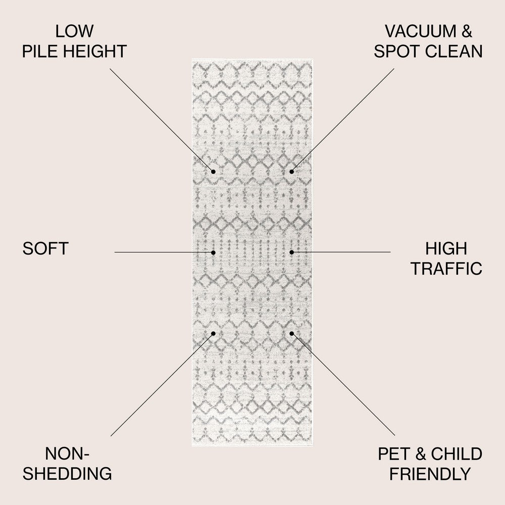 In shades of indigo and ivory, this Moroccan trellis is Inspired by timeless vintage designs and crafted with the softest polypropylene available. Originating with the Berber tribes of North Africa, this beautiful linear pattern is made modern in a deep navy yarn power loomed for durability. The simple geometric stripes, triangle and diamond motifs will give a fresh look to any room.