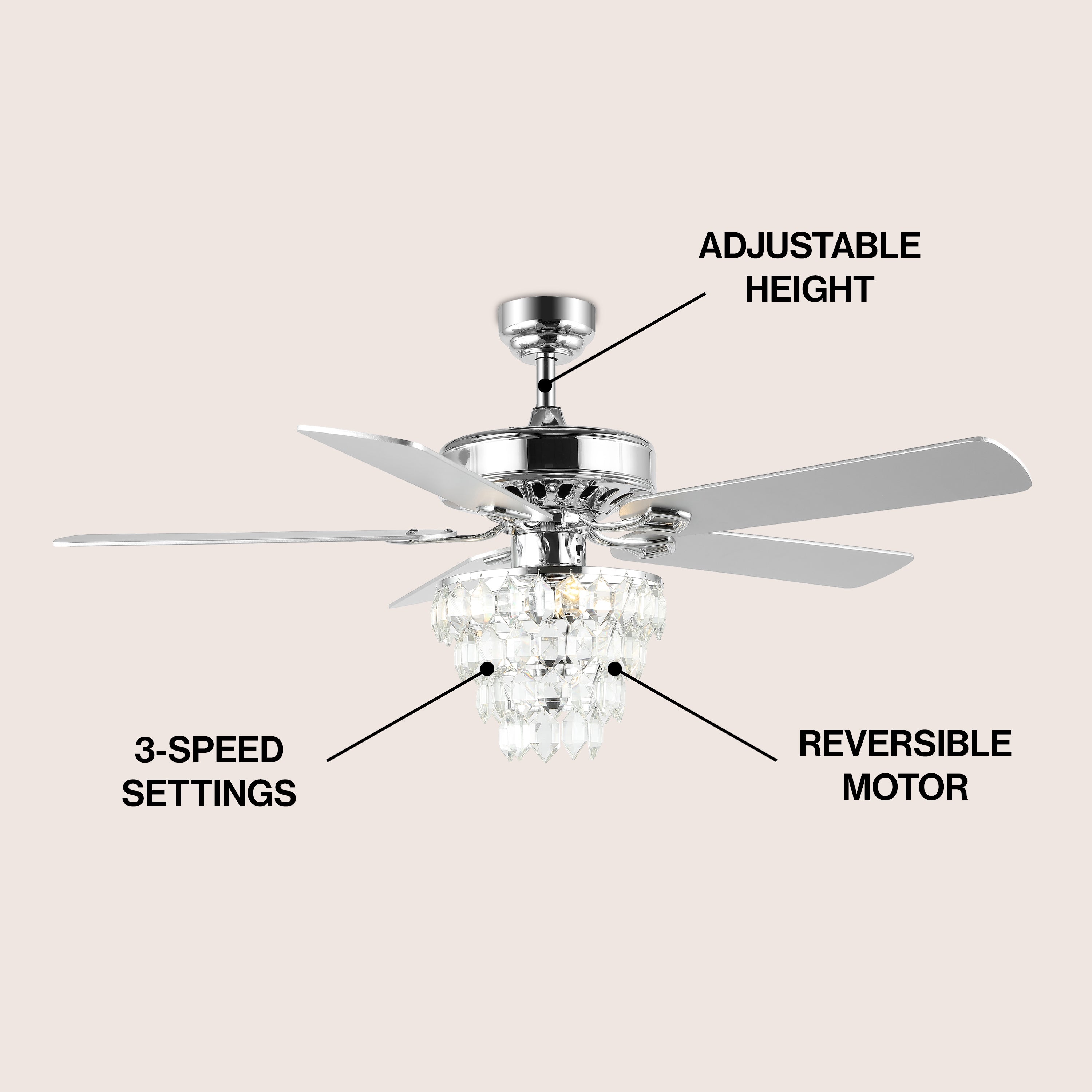 Our 52" chrome fan has swanky style, featuring a mid-century light fixture embellished with crystal prisms. Adjustable height allows for flush ceiling mount, or use the included down rods. Five reversible blades provide plenty of air flow by remote control. Three LED bulbs provide bright, sparkling light.
